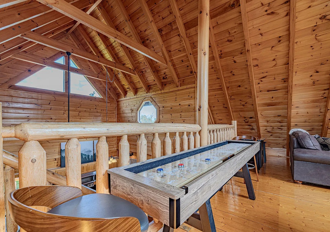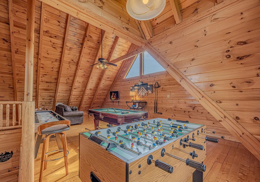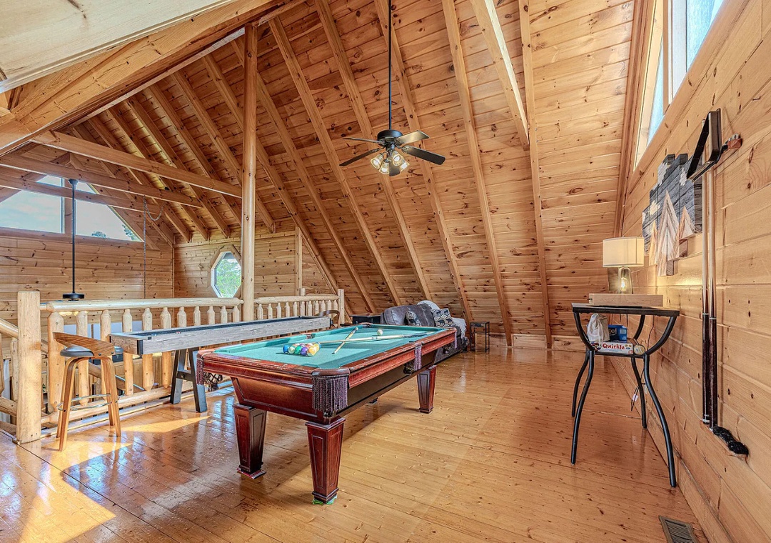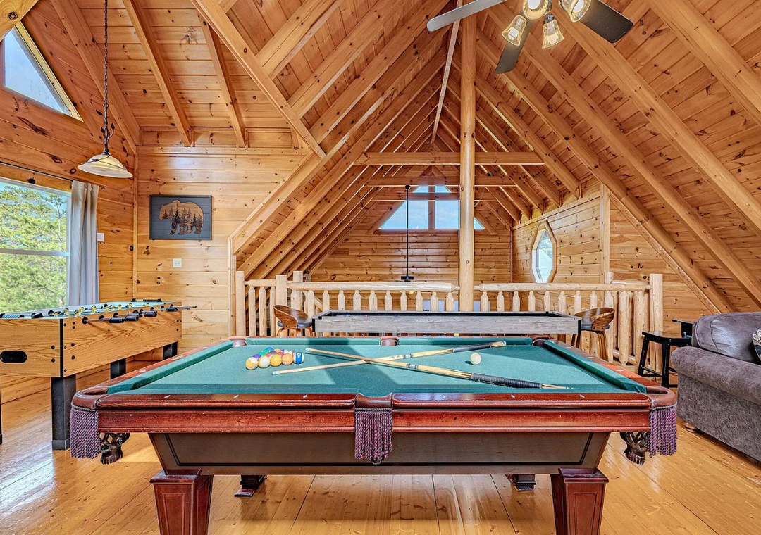 The cabin is overflowing with ways to relax and have fun, both indoors and outside. Step onto the expansive deck to enjoy the soothing hot tub, gentle breezes, and nature views that stretch across the ridges. Settle into the deck swing for a peaceful moment alone or gather around the grill for a cookout in the fresh mountain air. Inside, the massive loft doubles as a full game and movie room, offering a pool table, foosball, and shuffleboard for hours of friendly competition. It also includes a comfortable sofa and a flatscreen TV, creating the perfect spot for movie nights, game days, or cozy relaxation. Combined with the spacious living area below, you’ll find no shortage of entertainment options that make every moment of your stay memorable.