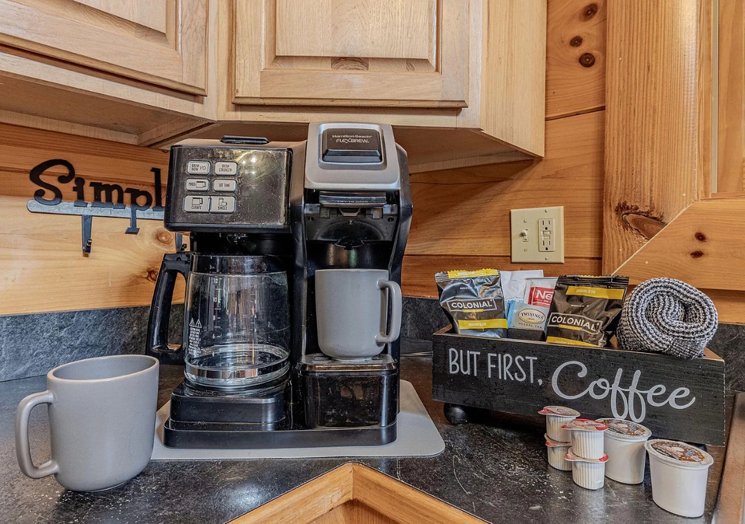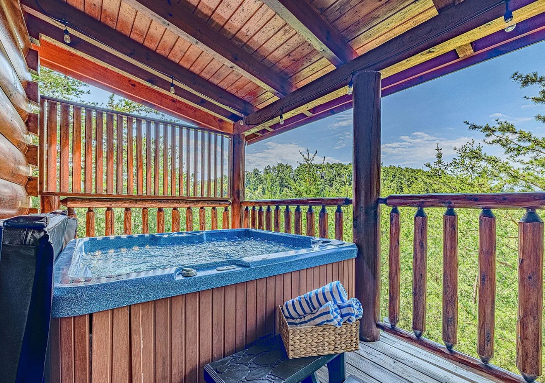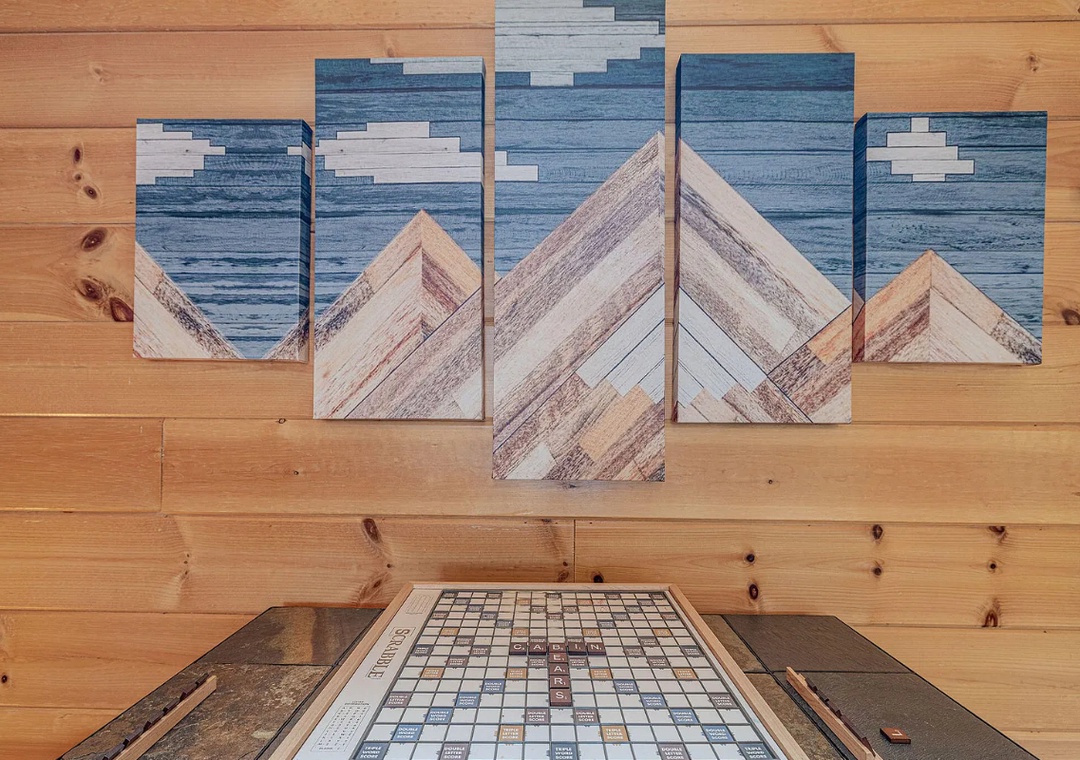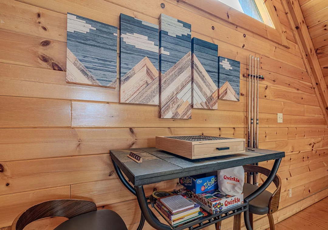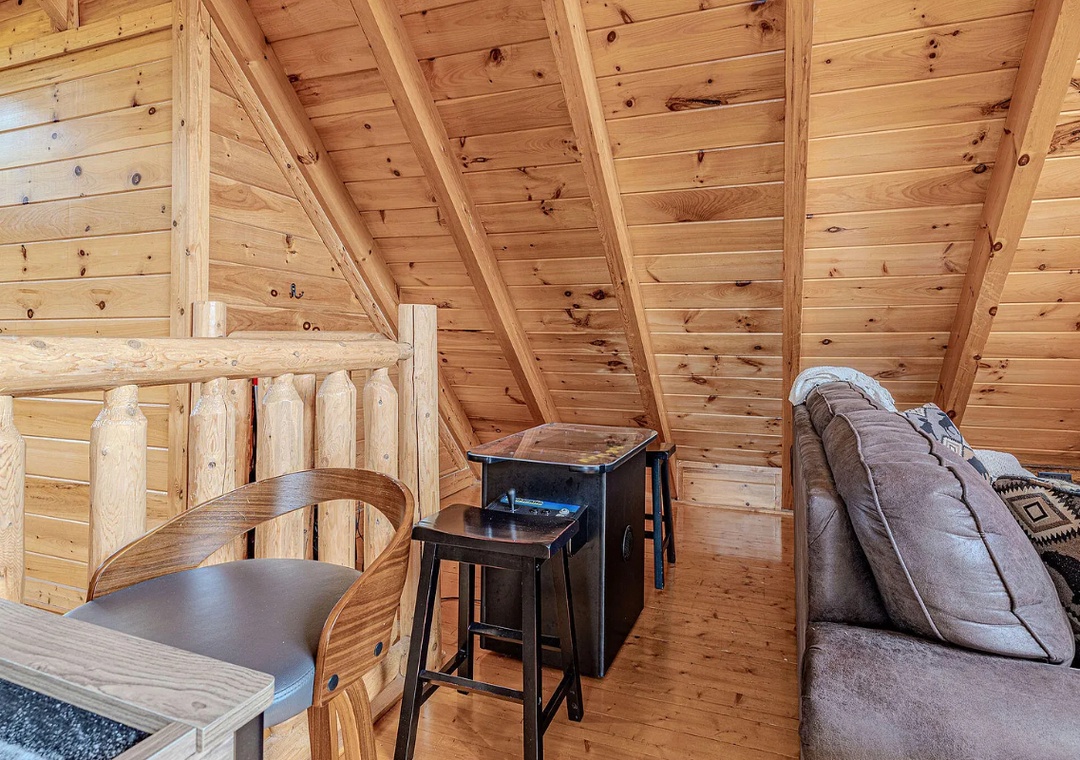 The cabin is overflowing with ways to relax and have fun, both indoors and outside. Step onto the expansive deck to enjoy the soothing hot tub, gentle breezes, and nature views that stretch across the ridges. Settle into the deck swing for a peaceful moment alone or gather around the grill for a cookout in the fresh mountain air. Inside, the massive loft doubles as a full game and movie room, offering a pool table, foosball, and shuffleboard for hours of friendly competition. It also includes a comfortable sofa and a flatscreen TV, creating the perfect spot for movie nights, game days, or cozy relaxation. Combined with the spacious living area below, you’ll find no shortage of entertainment options that make every moment of your stay memorable.