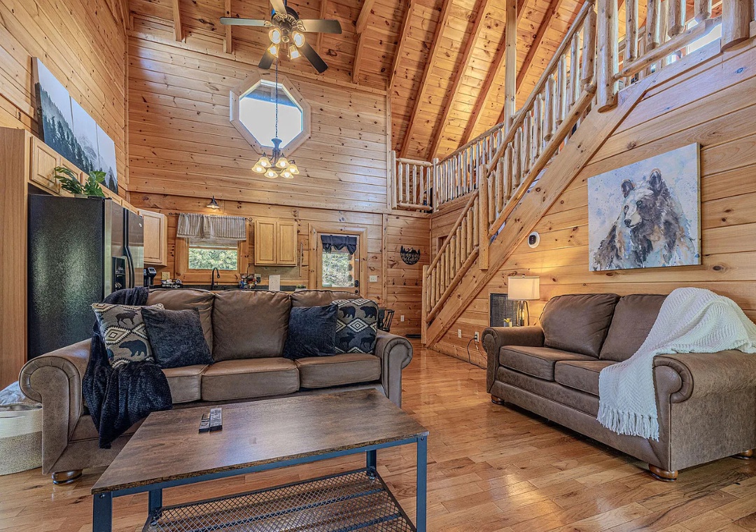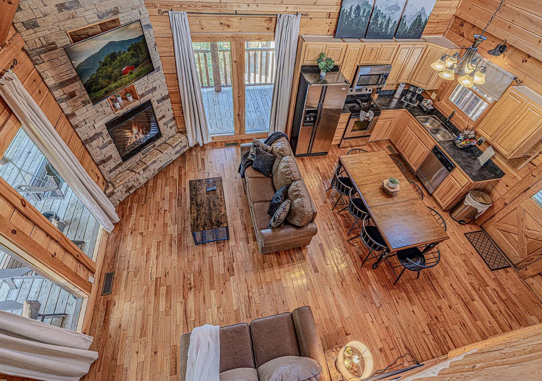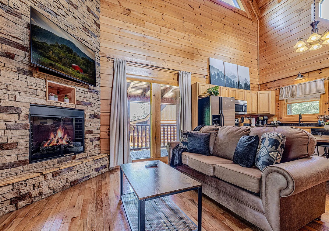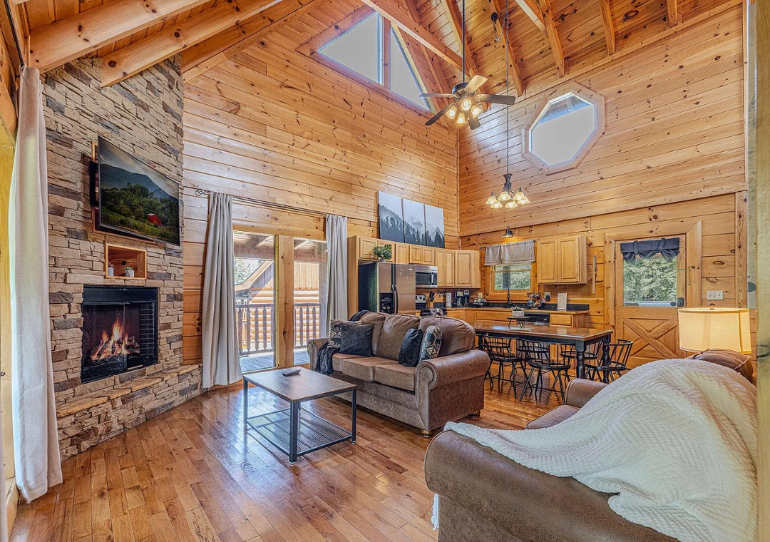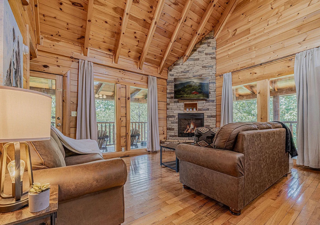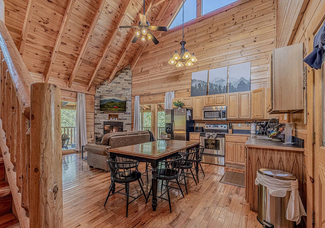 The nearly wrap-around deck invites you to slow down and savor views of the surrounding ridges and tranquil wooded scenery, creating a perfect blend of convenience and natural beauty. From the moment you step inside, the soaring cathedral ceilings, exposed beams, and all-wood interior set the tone for a classic Smokies cabin experience that feels both rustic and luxurious.