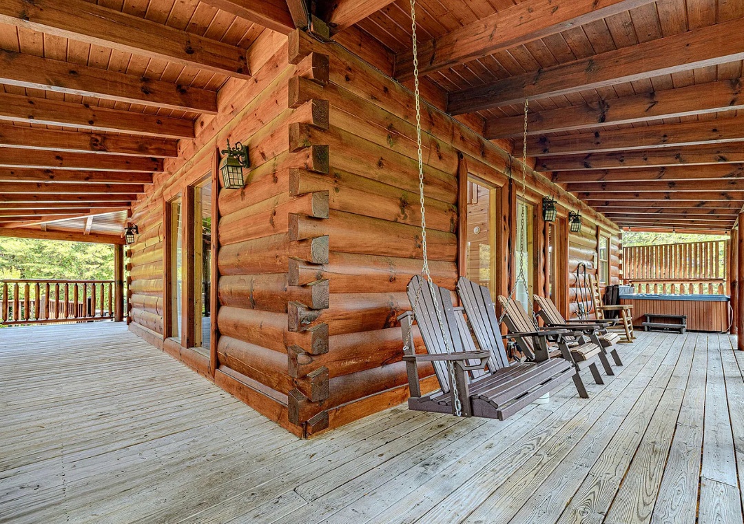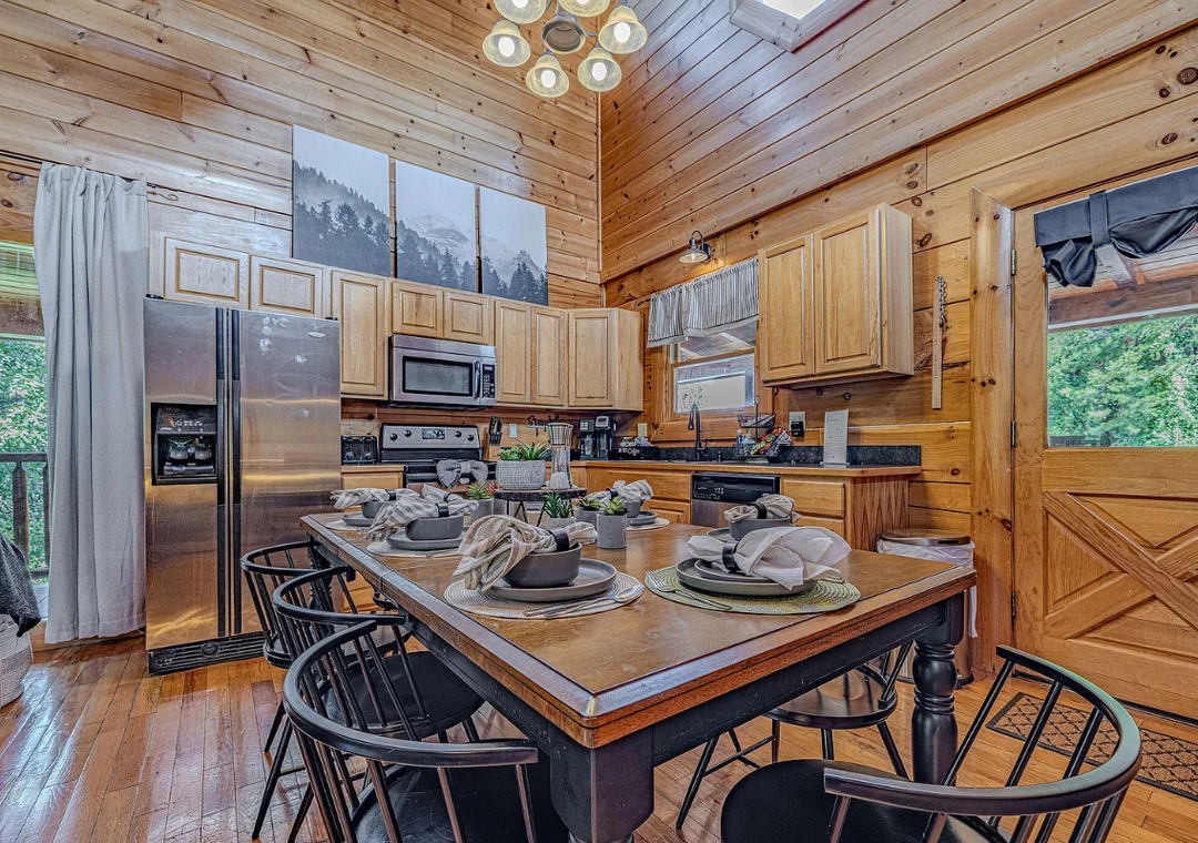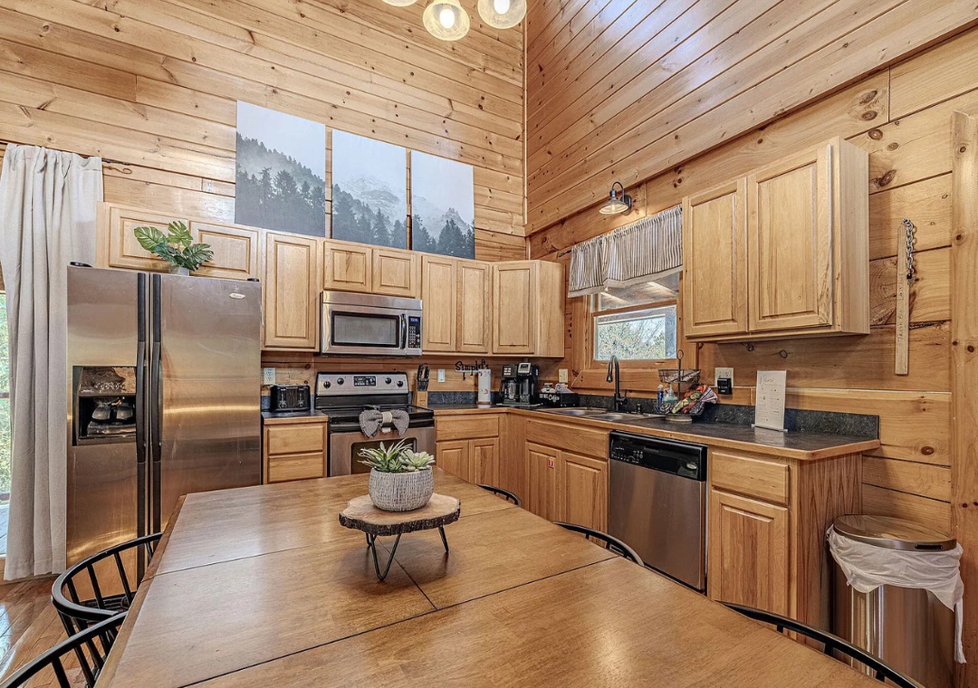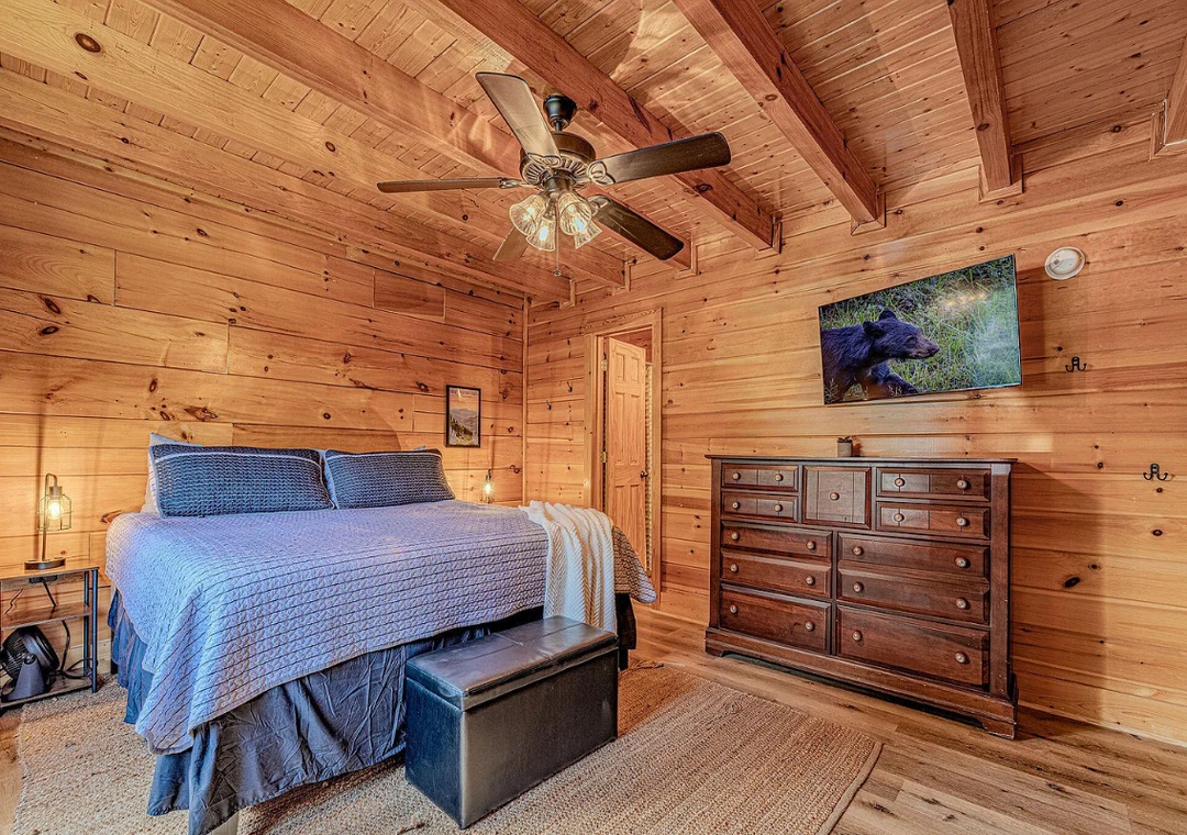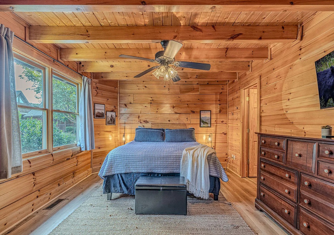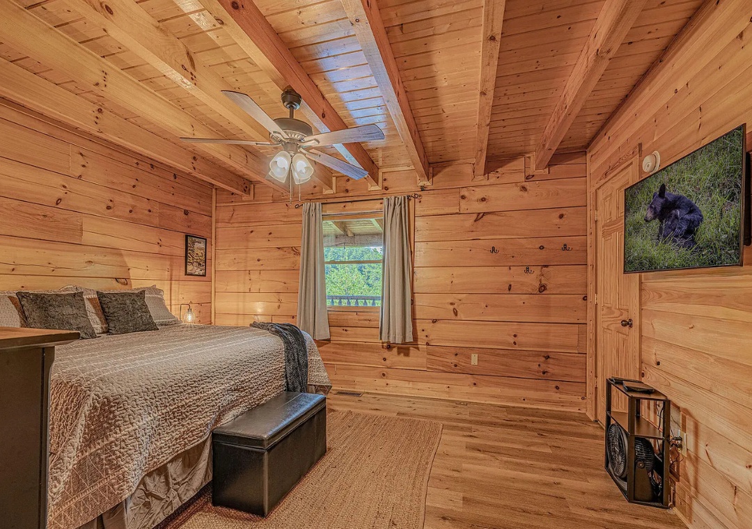 The nearly wrap-around deck invites you to slow down and savor views of the surrounding ridges and tranquil wooded scenery, creating a perfect blend of convenience and natural beauty. From the moment you step inside, the soaring cathedral ceilings, exposed beams, and all-wood interior set the tone for a classic Smokies cabin experience that feels both rustic and luxurious.