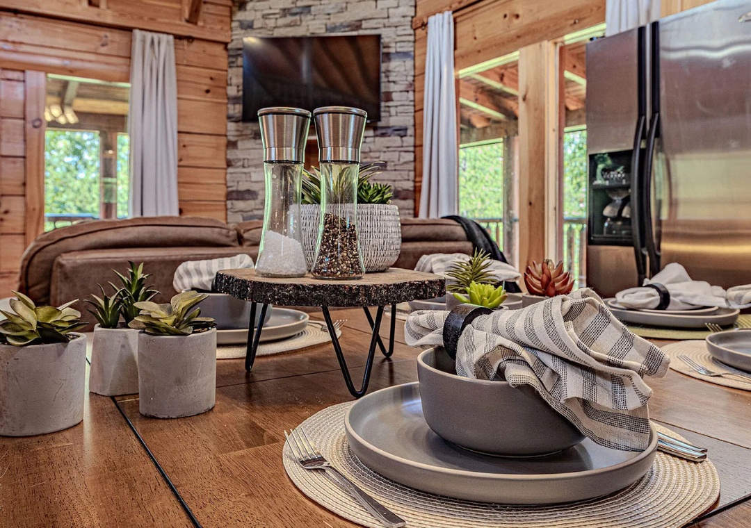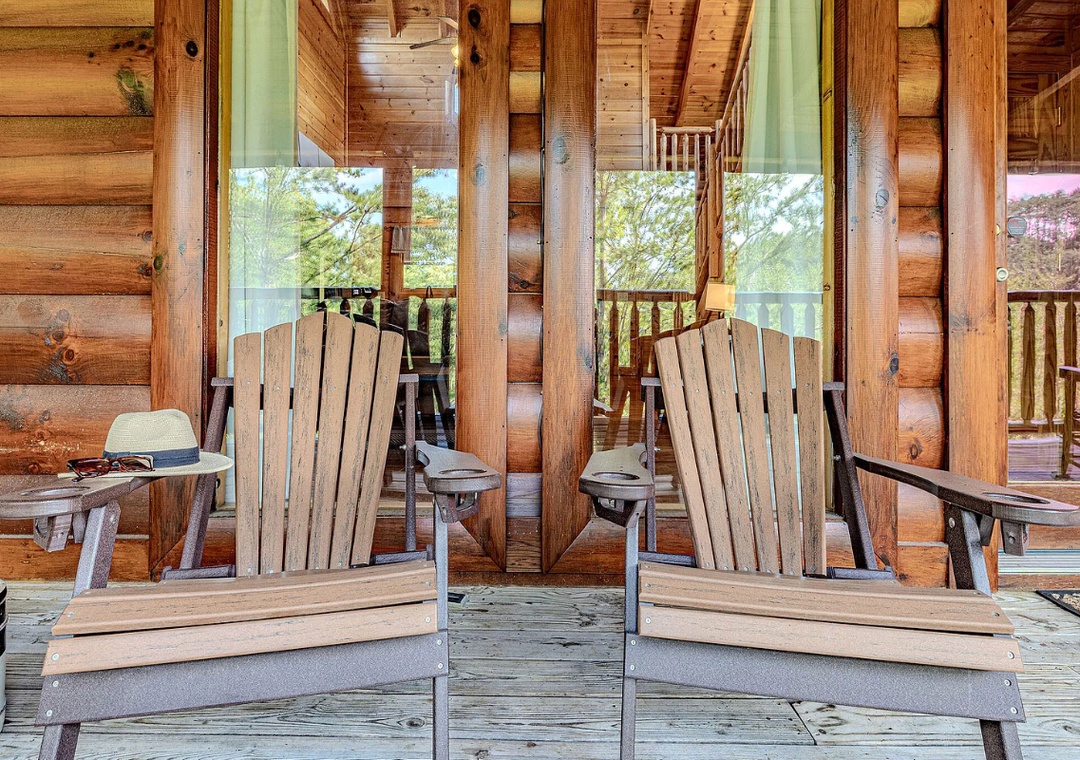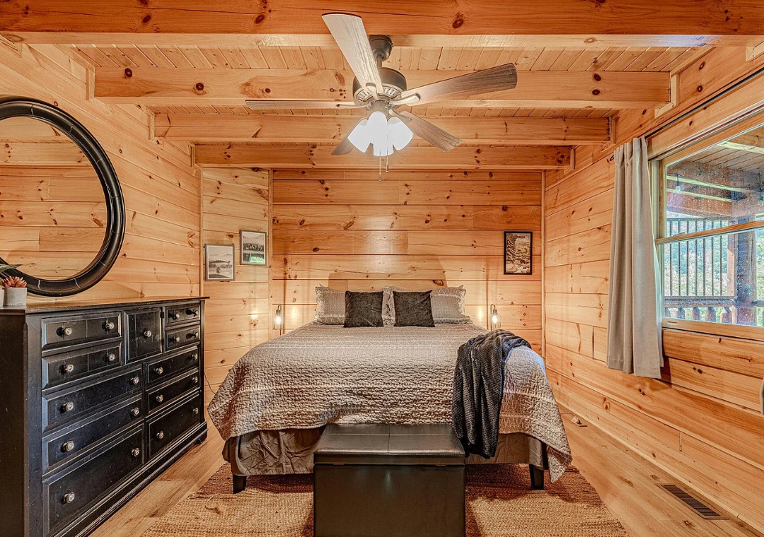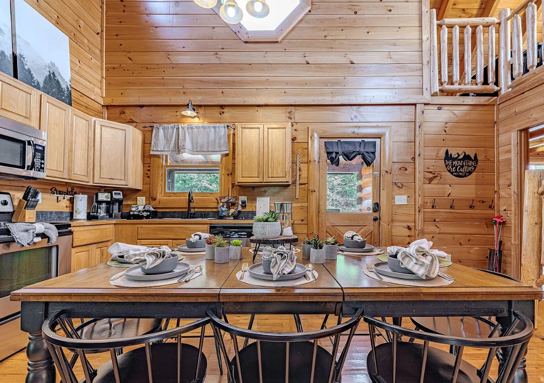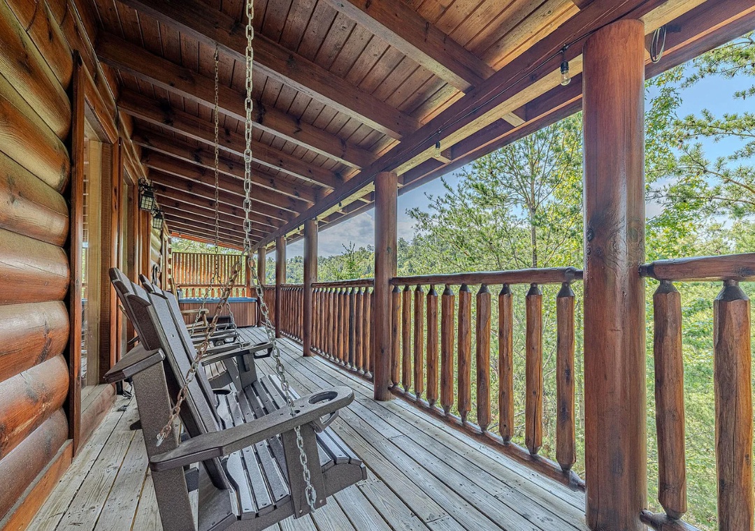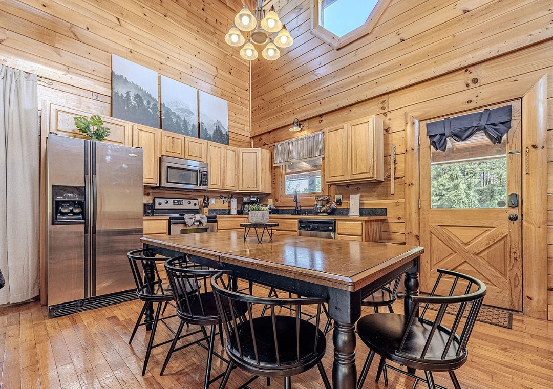 The nearly wrap-around deck invites you to slow down and savor views of the surrounding ridges and tranquil wooded scenery, creating a perfect blend of convenience and natural beauty. From the moment you step inside, the soaring cathedral ceilings, exposed beams, and all-wood interior set the tone for a classic Smokies cabin experience that feels both rustic and luxurious.