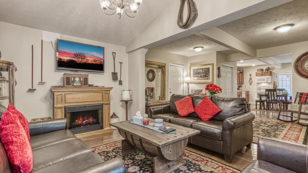 The Farmhouses living room is designed for entertainment and relaxation, so whether youre a couch potato or you spend just a few hours a day in your living room, youll get the most out of it thanks to the included amenities. Youll find a big screen TV, a fireplace, and comfortable couches in the living room so you can watch a movie, read a book, or warm up while chatting about your daily adventures.