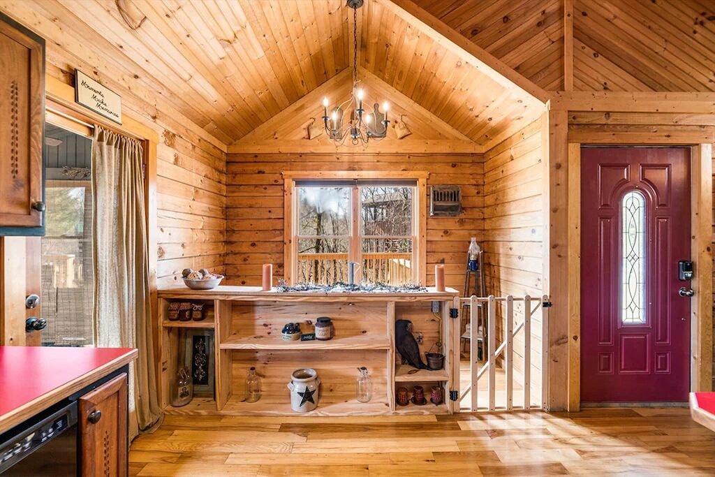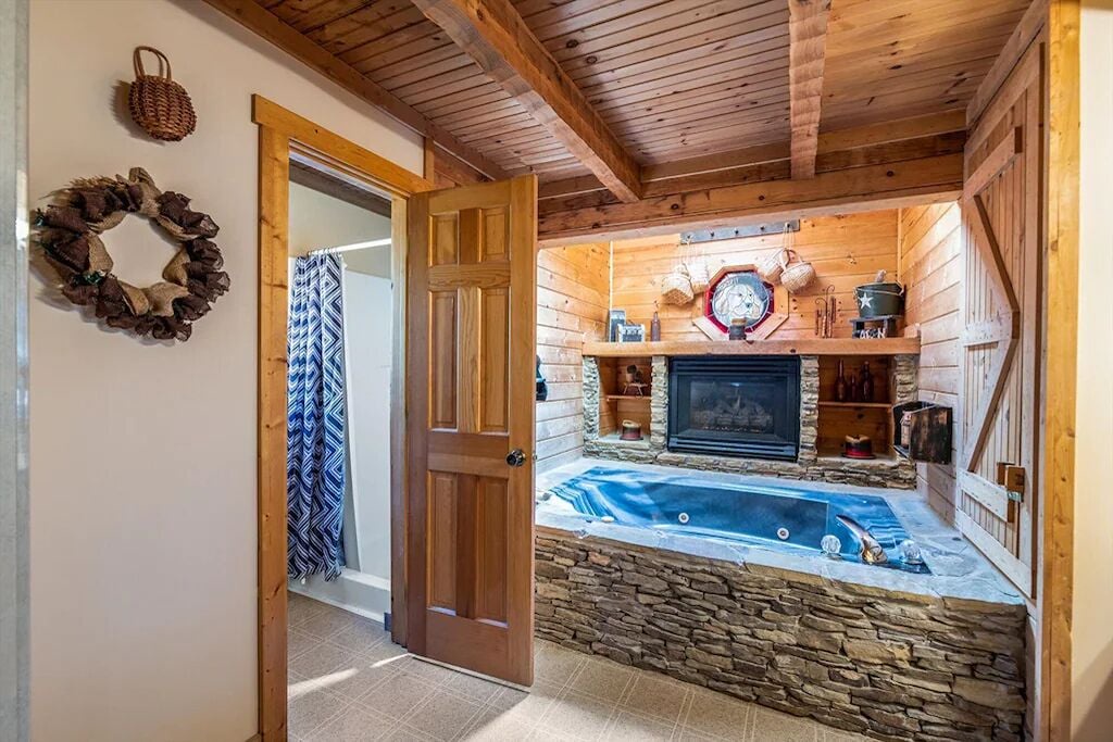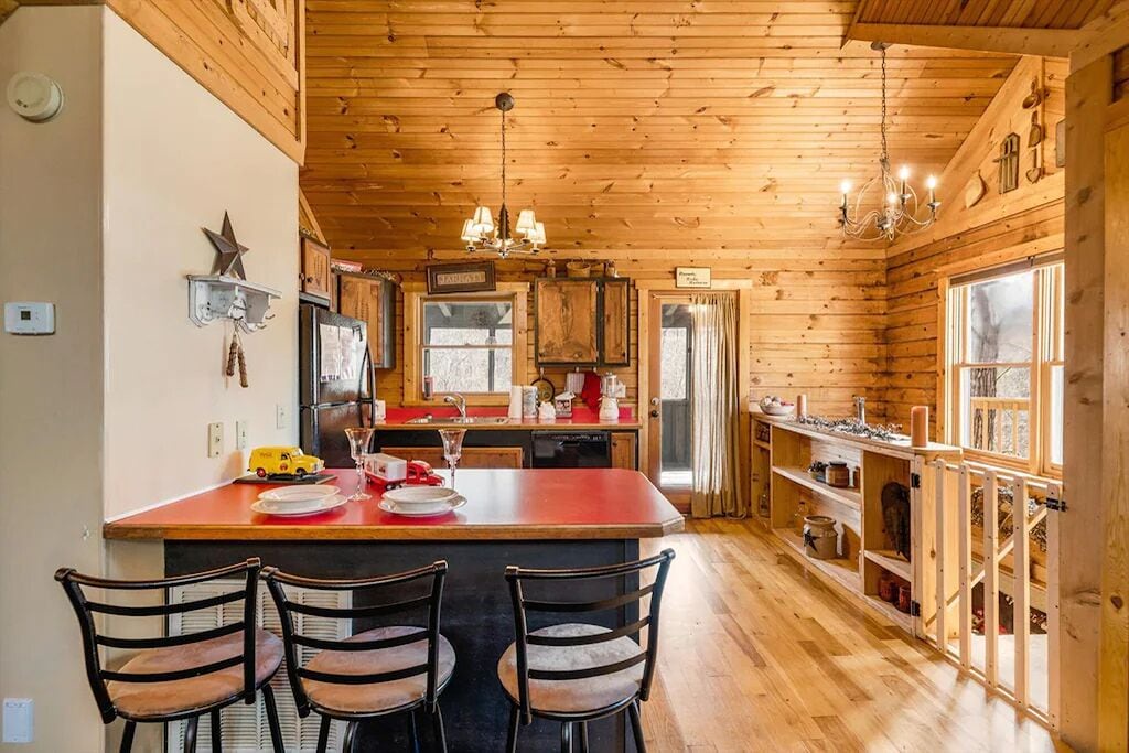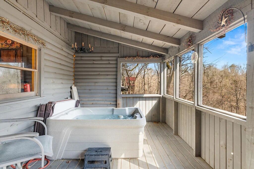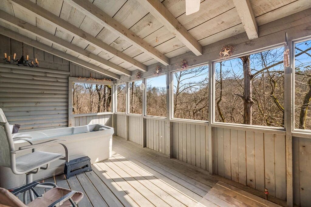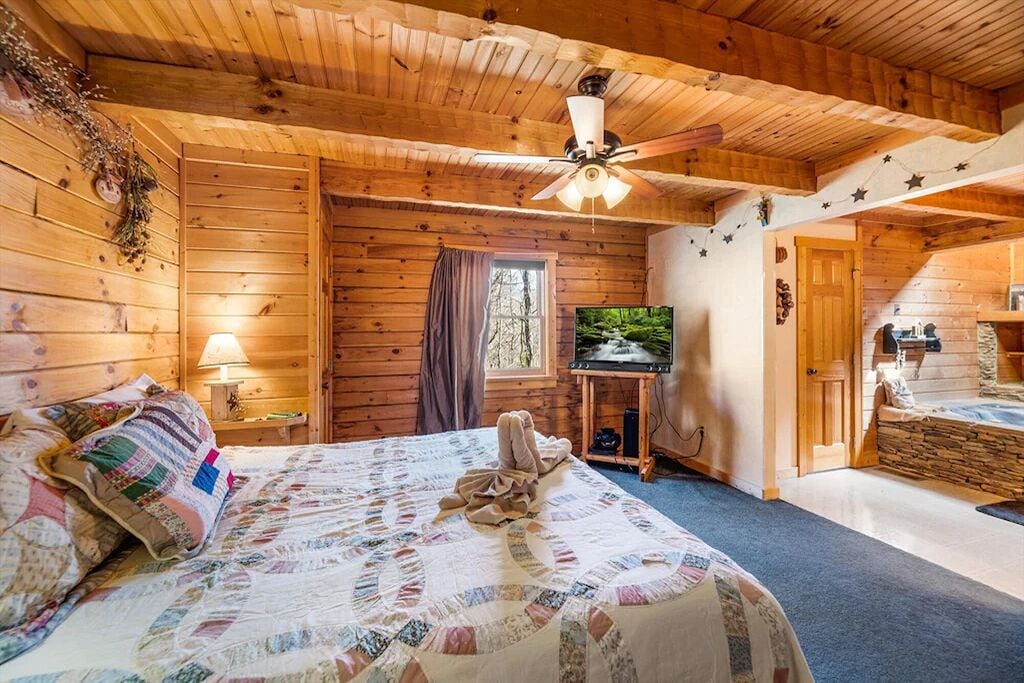 Beautiful, quiet area. The cabin is lovely. The stained glass window in the living room is mesmerizing. The jacuzzi alcove in the bedroom is so romantic with a natural rock surround finish and built-in fireplace wall. The skylight and stained porthole window create the perfect ambiance as sun sets. The kitchen is stocked with basic essentials for dining in. The grill and the blender worked great. The screened inporch with hottub were our deciding criteria ❣️ (Ultimate privacy [day or night])❤️🔥 This cabin is a wonderful couple's retreat. Our hosts were very responsive to our needs.- Reviewed On: 8/7/2023