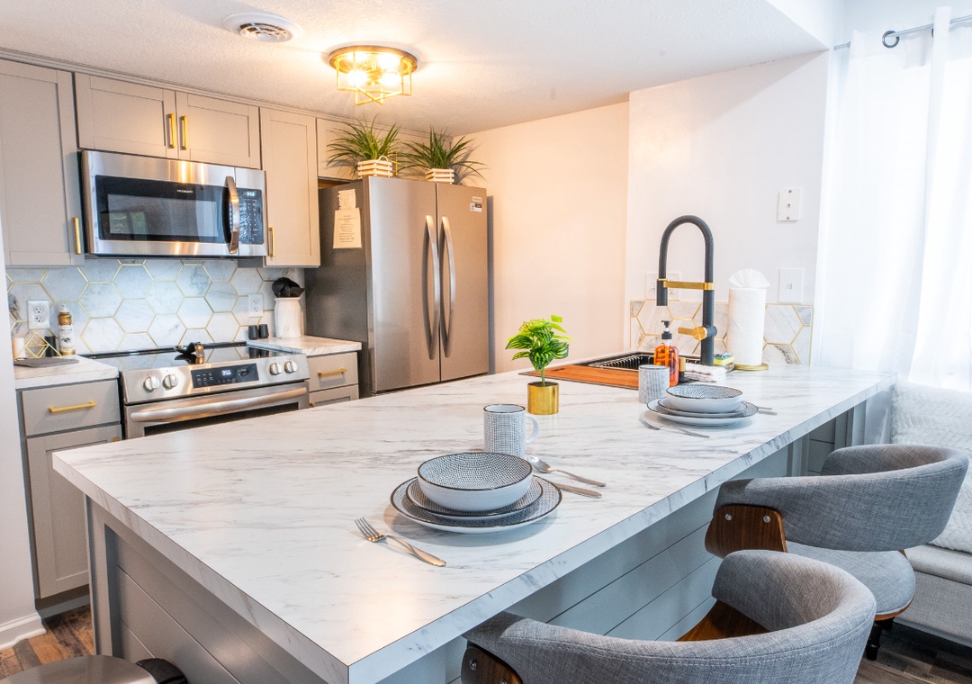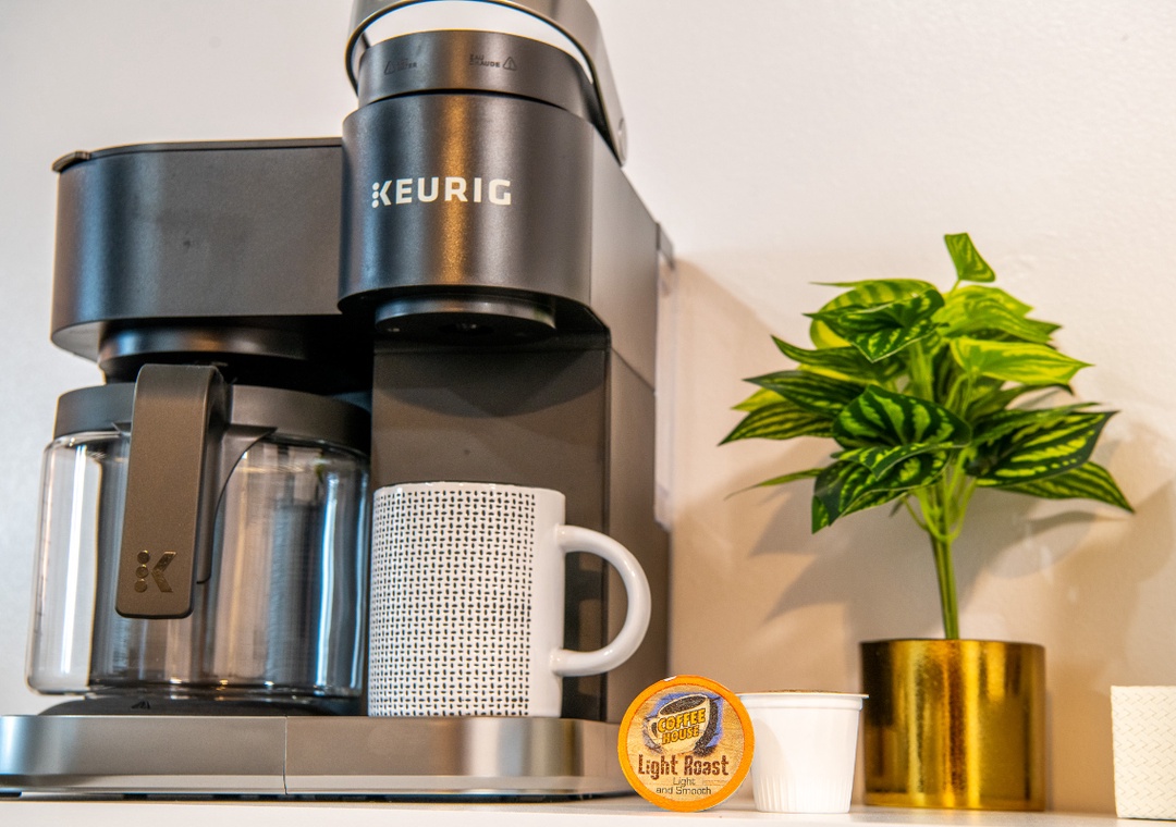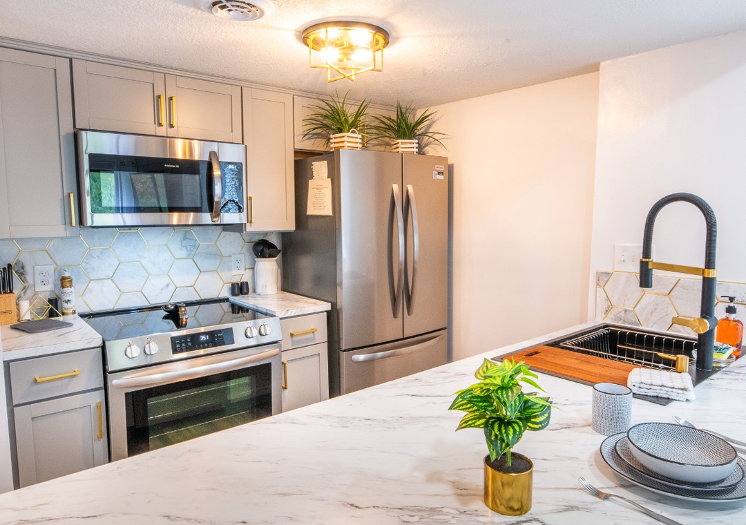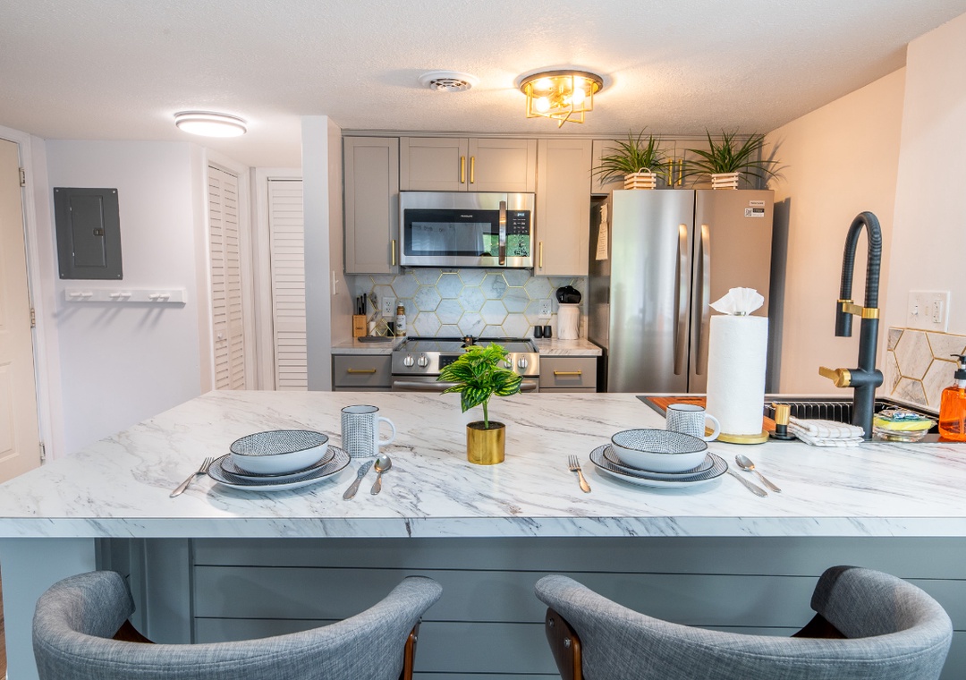 The fully-equipped kitchen boasts modern amenities, allowing you to prepare hearty meals. Complete with a full-sized refrigerator, dishwasher, stove, microwave, and other kitchen appliances perfect for making breakfast, lunch, or dinner throughout your stay! All pots, pans, glasses, plates, silverware, etc. are also there for you! The kitchen counter doubles as a dining area creating an inviting atmosphere, encouraging you to linger over meals and share stories.