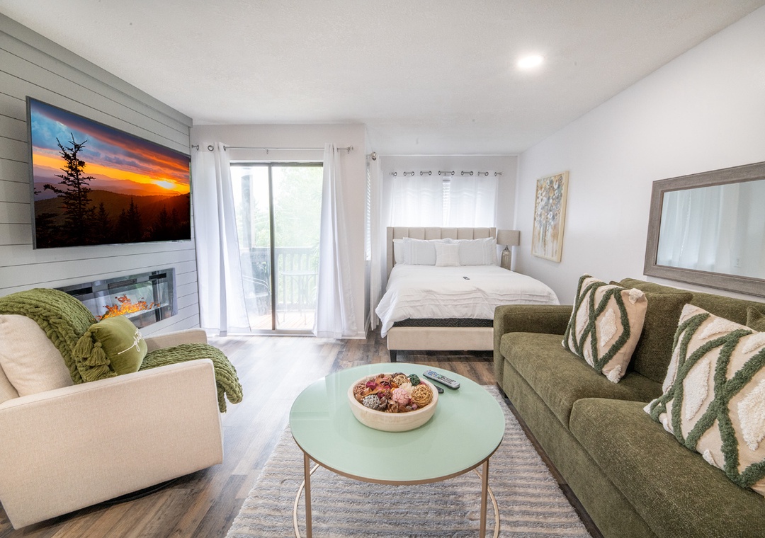 As you enter, you’re greeted by a spacious living area that seamlessly blends into the dining and kitchen spaces, creating a warm and open atmosphere. The centerpiece of the living room is a stylish electric fireplace and a huge flat-screen TV, providing both a modern touch and a cozy ambiance during cooler mountain evenings. Natural light pours in through large windows, illuminating every corner of the condo. The bedroom, located just off the main living space, is a peaceful retreat with soft lighting and its minimalist design ensures restful nights, while still providing all the comforts of home. Free WiFi is also available throughout the property.