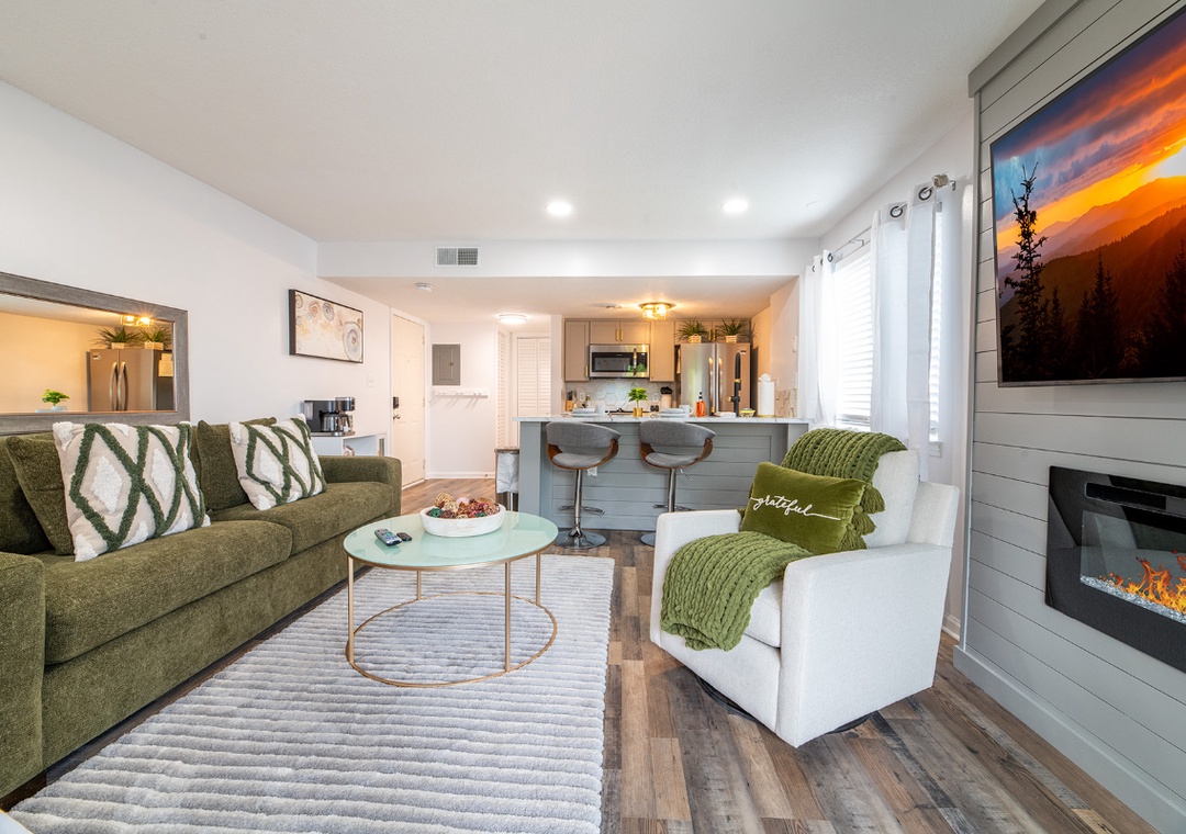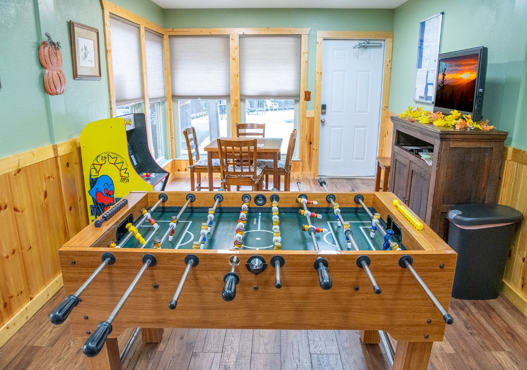 Start in the living area, centered around a modern electric fireplace, it provides a warm, inviting space for unwinding. Whether you're watching your favorite shows on the flat-screen TV, streaming a movie, or just enjoying the ambiance of the fireplace, it's an ideal space for cozy evenings. You may also step out onto the private patio and enjoy your morning coffee or evening drinks after a day of adventure. For outdoor entertainment, The Jeffrey Martin offers access to both a park-style charcoal grill and a propane grill located directly across from the building, making it easy to host a casual cookout. If you're visiting in the warmer months, take advantage of the community’s seasonal pool, which also has a relaxing hot tub area just a short walk away. So whether you want to take a refreshing swim or soak your muscles in the hot tubs, you’ll find both options conveniently available. But the entertainment doesn’t stop there. Just beyond the pool, you’ll discover a community play area designed for both kids and adults alike. With an arcade full of classic games and a foosball table, there’s something for everyone to enjoy.