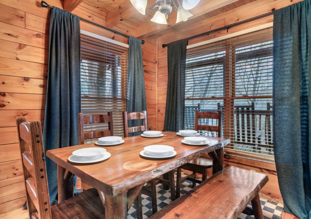 The fully-equipped kitchen boasts modern amenities, making it easy to prepare delicious meals for your family or friends. Well-appointed with a refrigerator, dishwasher, stove, microwave, and other kitchen appliances, perfect for making breakfast, lunch, or dinner throughout your stay! All pots, pans, glasses, plates, silverware, etc., are also there for you! Gather around the inviting dining table to savor your meal while enjoying the fresh mountain air.