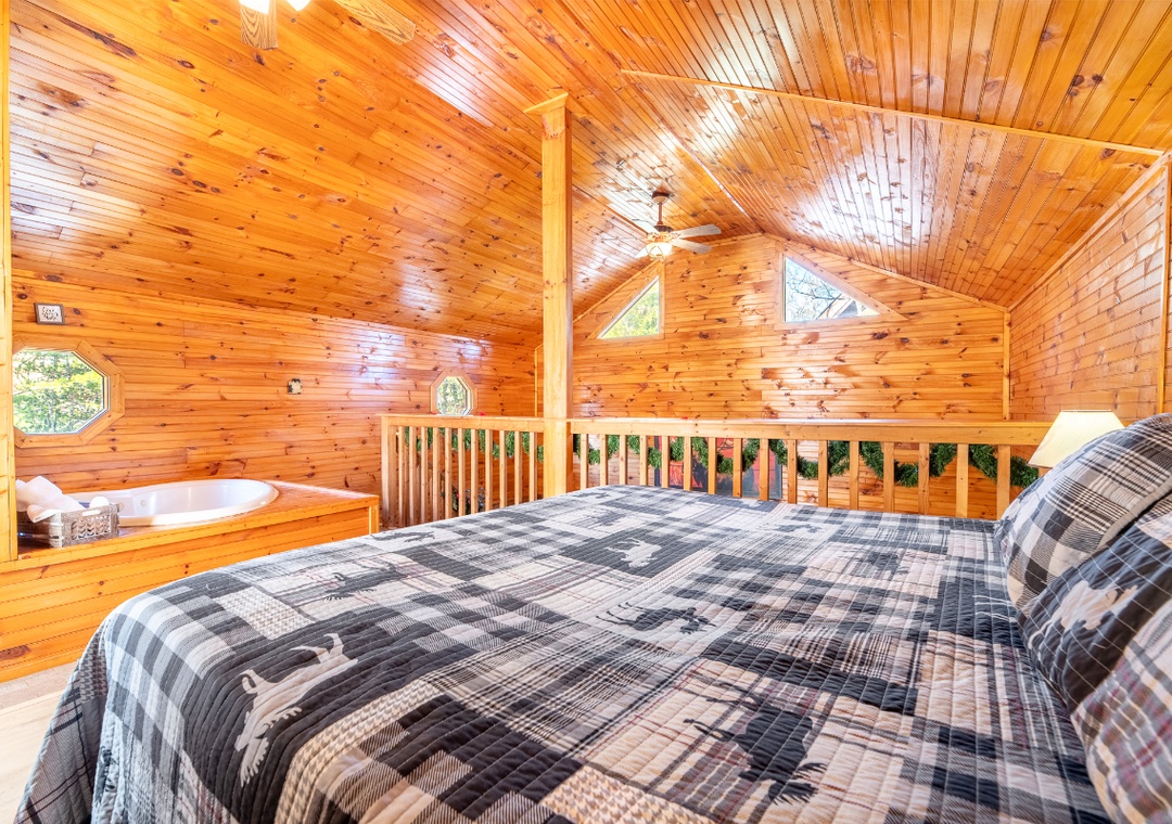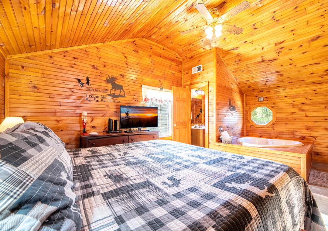 ✔ Bedroom #1 (LOFT): Spacious Bedroom with a King-Bed and Flatscreen TV; Attached Half Bathroom with Separate Jacuzzi Tub