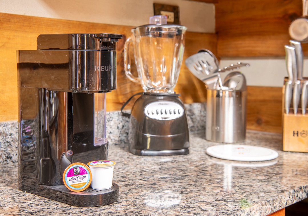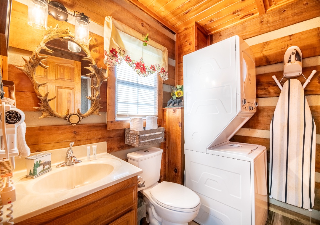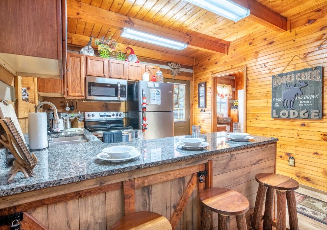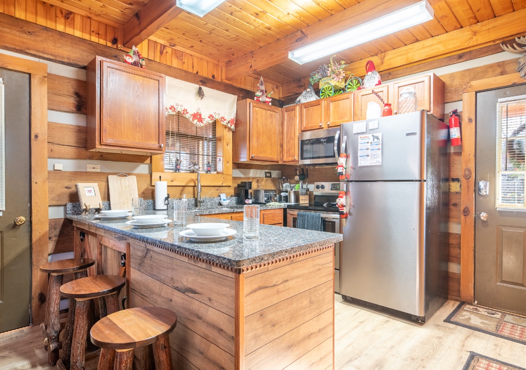 The fully-equipped kitchen boasts modern amenities, making it easy to prepare delicious meals for your family or friends. Well-appointed with a refrigerator, stove, microwave, and other kitchen appliances, perfect for making breakfast, lunch, or dinner throughout your stay! All pots, pans, glasses, plates, silverware, etc., are also there for you! Gather around the inviting dining table to share stories and laughter, as it invites you to savor each bite while soaking in the warm glow of the cabin’s cozy ambiance