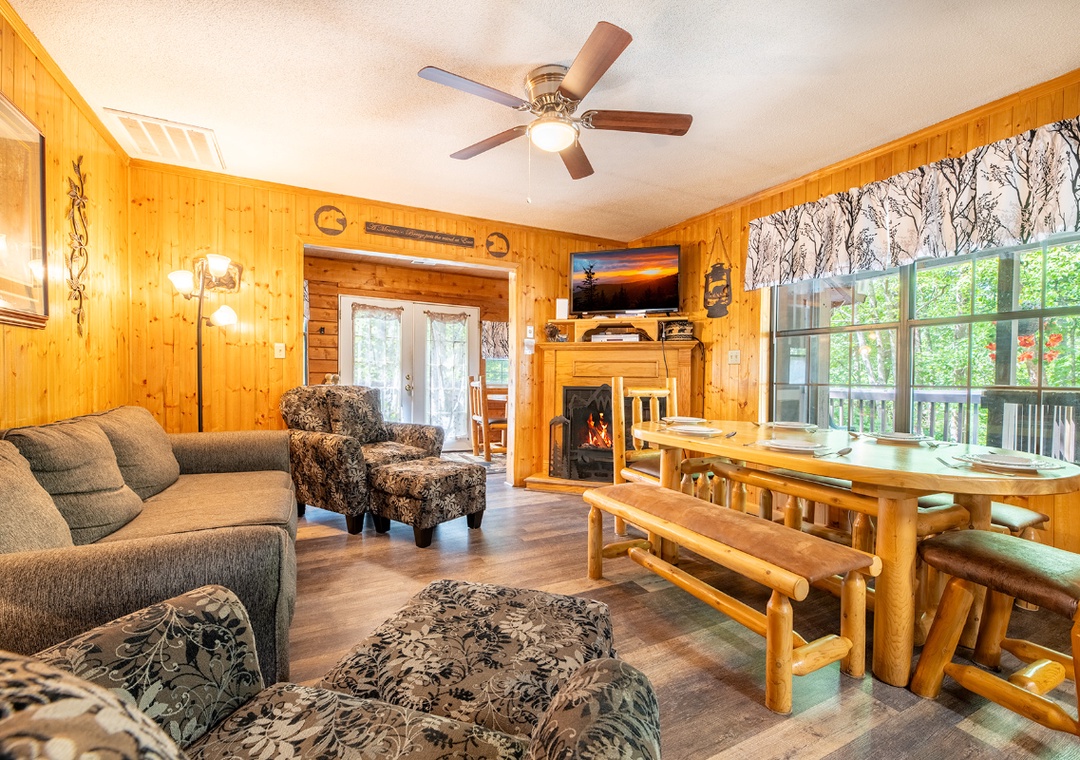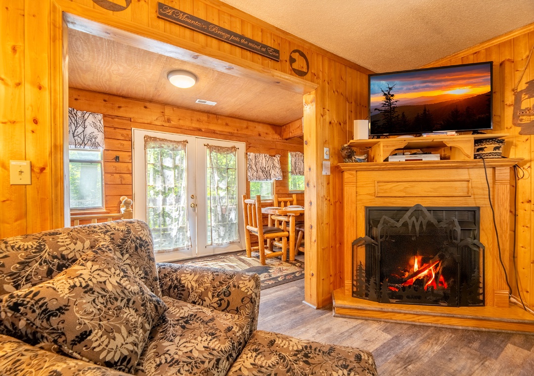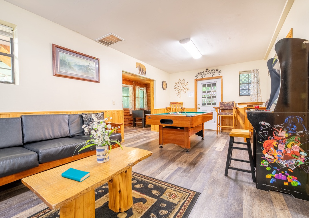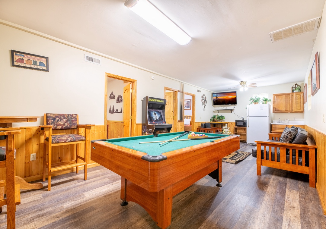 The main level is the heart of the cabin, featuring an open-concept living space where family and friends can gather with ease. The living room is anchored by a cozy propane fireplace, creating the perfect setting for cool mountain nights. With large windows that let in natural light and views of the surrounding woods, it is both spacious and inviting, a place where everyone naturally comes together. The kitchen, just steps away, is fully stocked with all the essentials you’ll need to prepare anything from a simple breakfast to a hearty family dinner. The adjacent dining area features a large table and a smaller one near the deck entrance, perfect for sharing meals, playing board games, or planning the next day’s adventures. On the lower level, find the expansive game room where entertainment and relaxation blend seamlessly. Free WiFi is also available throughout the property.