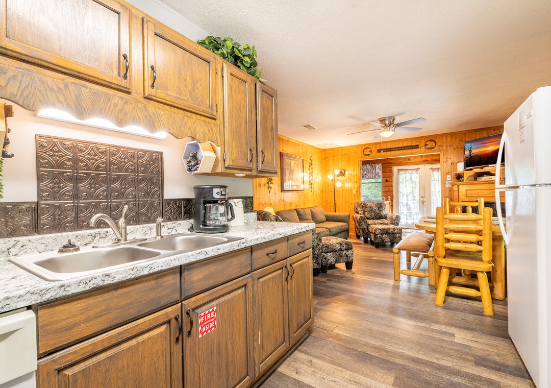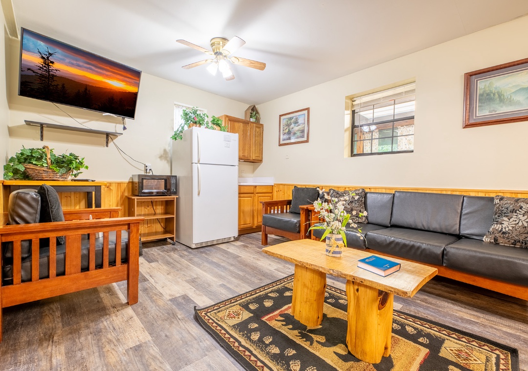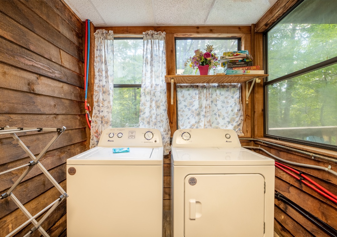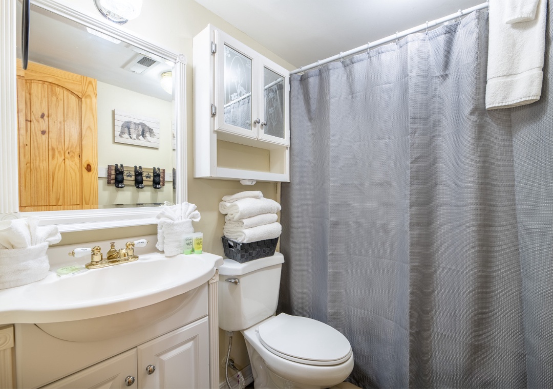 The main level is the heart of the cabin, featuring an open-concept living space where family and friends can gather with ease. The living room is anchored by a cozy propane fireplace, creating the perfect setting for cool mountain nights. With large windows that let in natural light and views of the surrounding woods, it is both spacious and inviting, a place where everyone naturally comes together. The kitchen, just steps away, is fully stocked with all the essentials you’ll need to prepare anything from a simple breakfast to a hearty family dinner. The adjacent dining area features a large table and a smaller one near the deck entrance, perfect for sharing meals, playing board games, or planning the next day’s adventures. On the lower level, find the expansive game room where entertainment and relaxation blend seamlessly. Free WiFi is also available throughout the property.