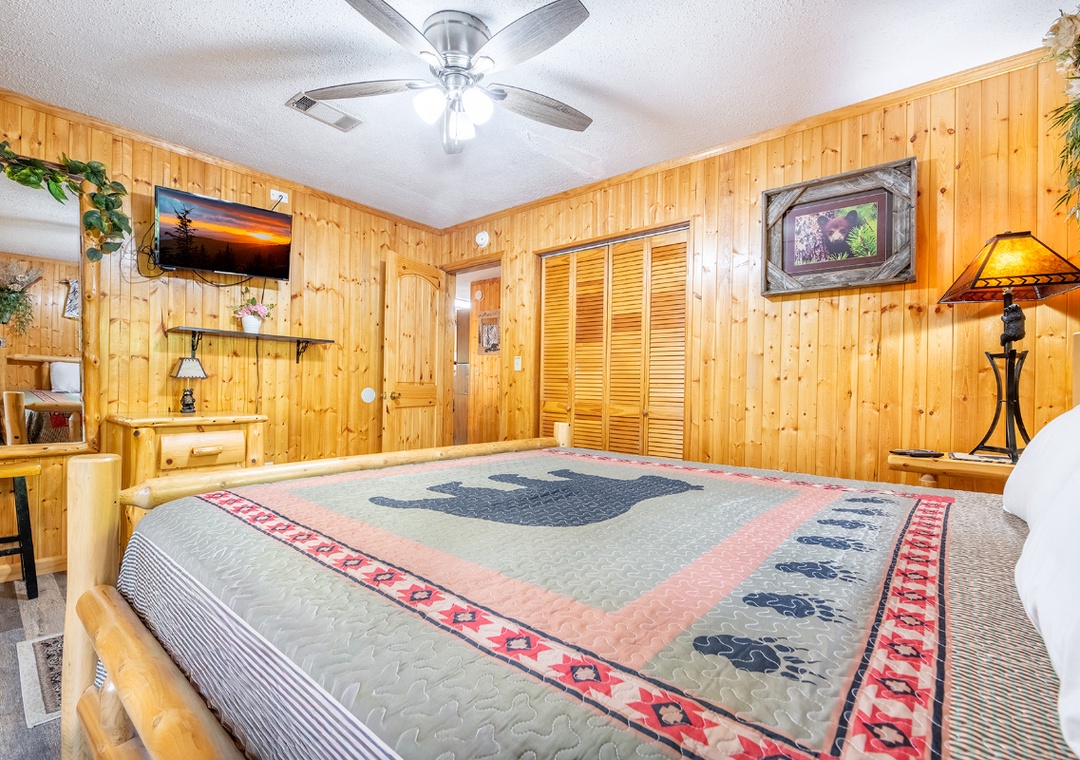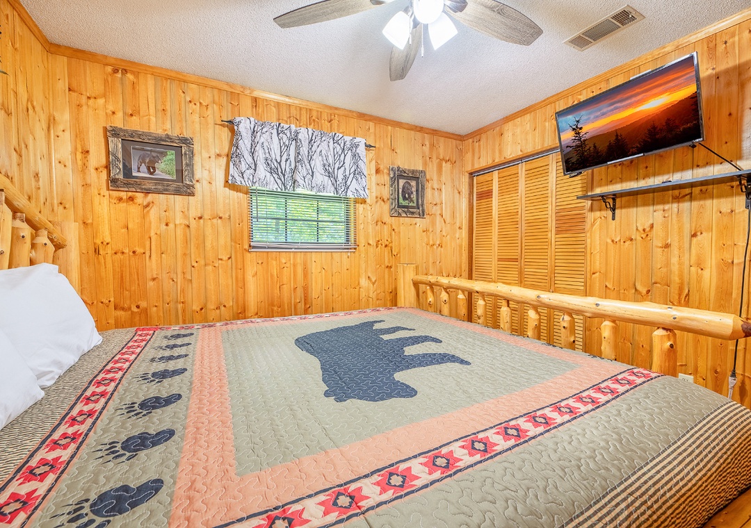 ✔ Bedroom #1 (Main Level): Spacious Bedroom with a King-sized Bed and a Flat-screen TV; Access to a Full Bathroom with Shower/Tub Combo