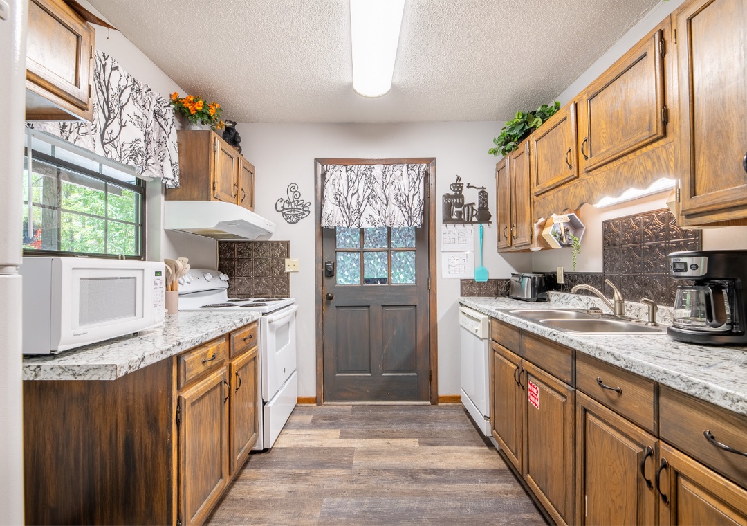 The fully-equipped kitchen boasts modern amenities, making it easy to prepare delicious meals for your family. Well-appointed with a full-sized refrigerator, dishwasher, stove, microwave, and other kitchen appliances perfect for making breakfast, lunch, or dinner throughout your stay! All pots, pans, glasses, plates, silverware, etc., are also there for you! Gather around the inviting dining tables to share stories and laughter, as it invites you to savor each bite while taking in the natural beauty of the surroundings.