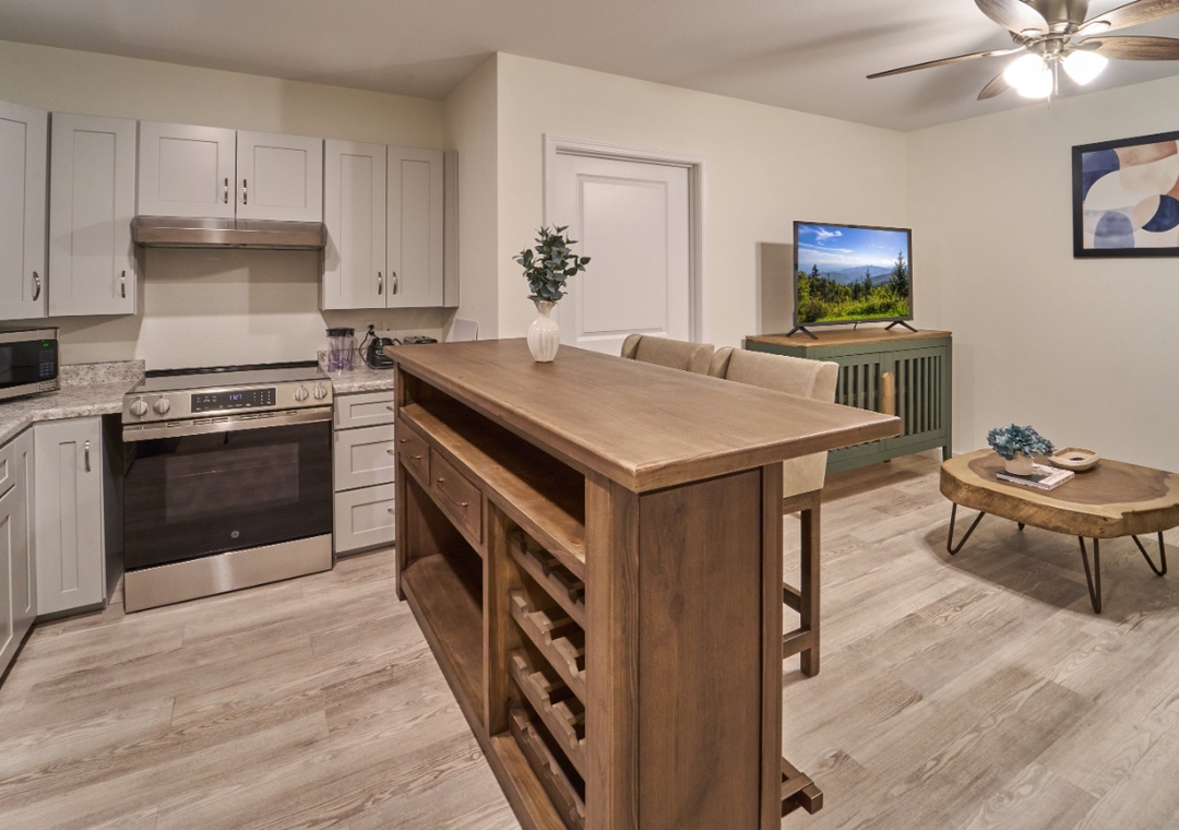 Step into a bright, inviting space where modern comfort meets cozy charm. The living area is designed for relaxation, with an open-concept layout that makes it easy to unwind after a full day of exploring the Smokies. Curl up on the sofa with your favorite book, enjoy a movie night with cable TV, or stream your favorite shows using high-speed fiber Wi-Fi. Large windows fill the room with natural light, creating a cheerful, airy atmosphere that feels like home from the moment you arrive.