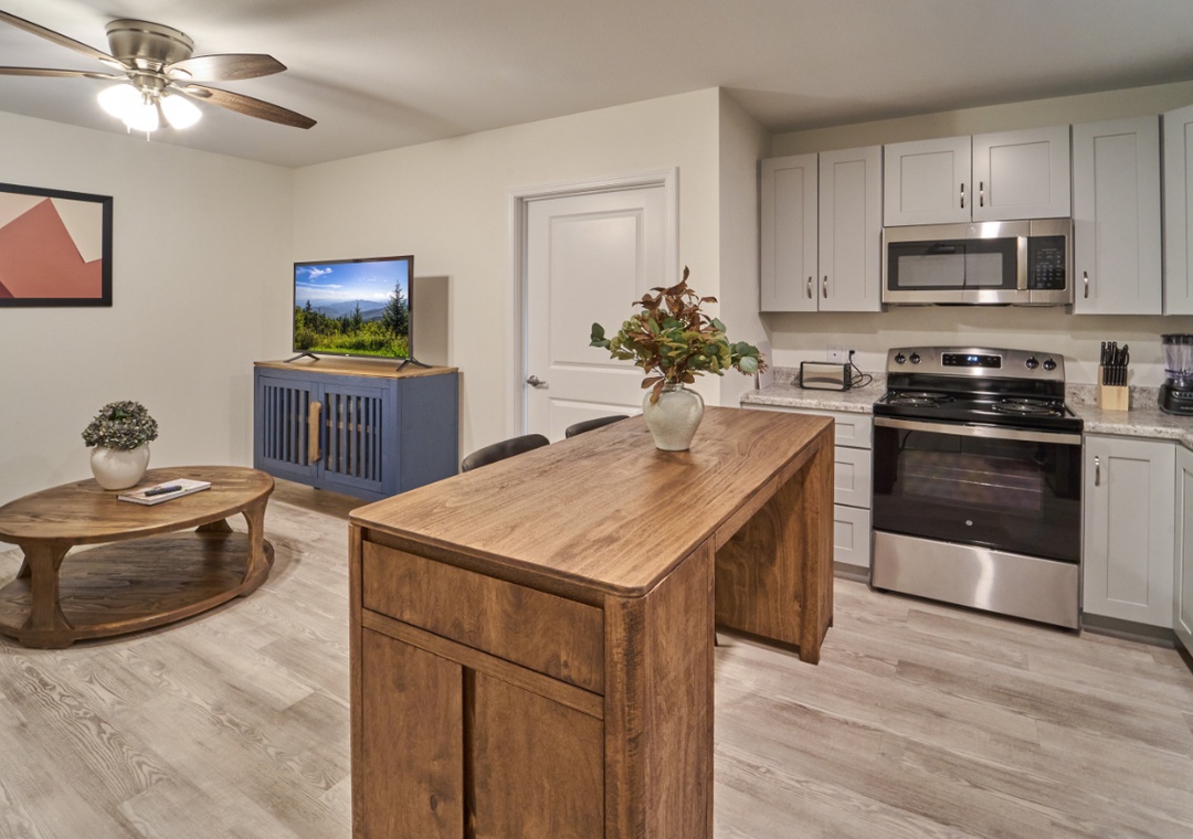 Step into a bright, inviting space where modern comfort meets cozy charm. The living area is designed for relaxation, with an open-concept layout that makes it easy to unwind after a full day of exploring the Smokies. Curl up on the sofa with your favorite book, enjoy a movie night with cable TV, or stream your favorite shows using high-speed fiber Wi-Fi. Large windows fill the room with natural light, creating a cheerful, airy atmosphere that feels like home from the moment you arrive.