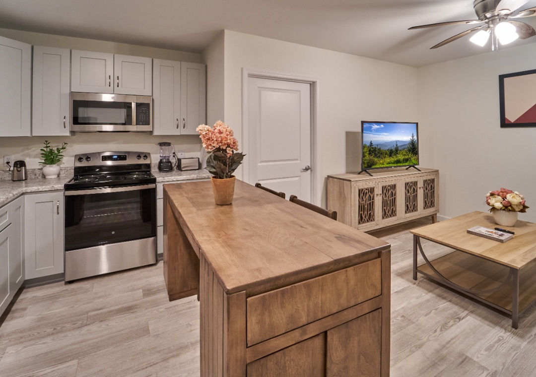 Step into a bright, inviting space where modern comfort meets cozy charm. The living area is designed for relaxation, with an open-concept layout that makes it easy to unwind after a full day of exploring the Smokies. Curl up on the sofa with your favorite book, enjoy a movie night with cable TV, or stream your favorite shows using high-speed fiber Wi-Fi. Large windows fill the room with natural light, creating a cheerful, airy atmosphere that feels like home from the moment you arrive.
