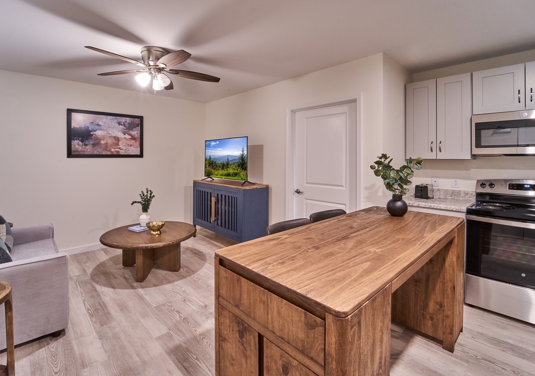 Step into a bright, inviting space where modern comfort meets cozy charm. The living area is designed for relaxation, with an open-concept layout that makes it easy to unwind after a full day of exploring the Smokies. Curl up on the sofa with your favorite book, enjoy a movie night with cable TV, or stream your favorite shows using high-speed fiber Wi-Fi. Large windows fill the room with natural light, creating a cheerful, airy atmosphere that feels like home from the moment you arrive.