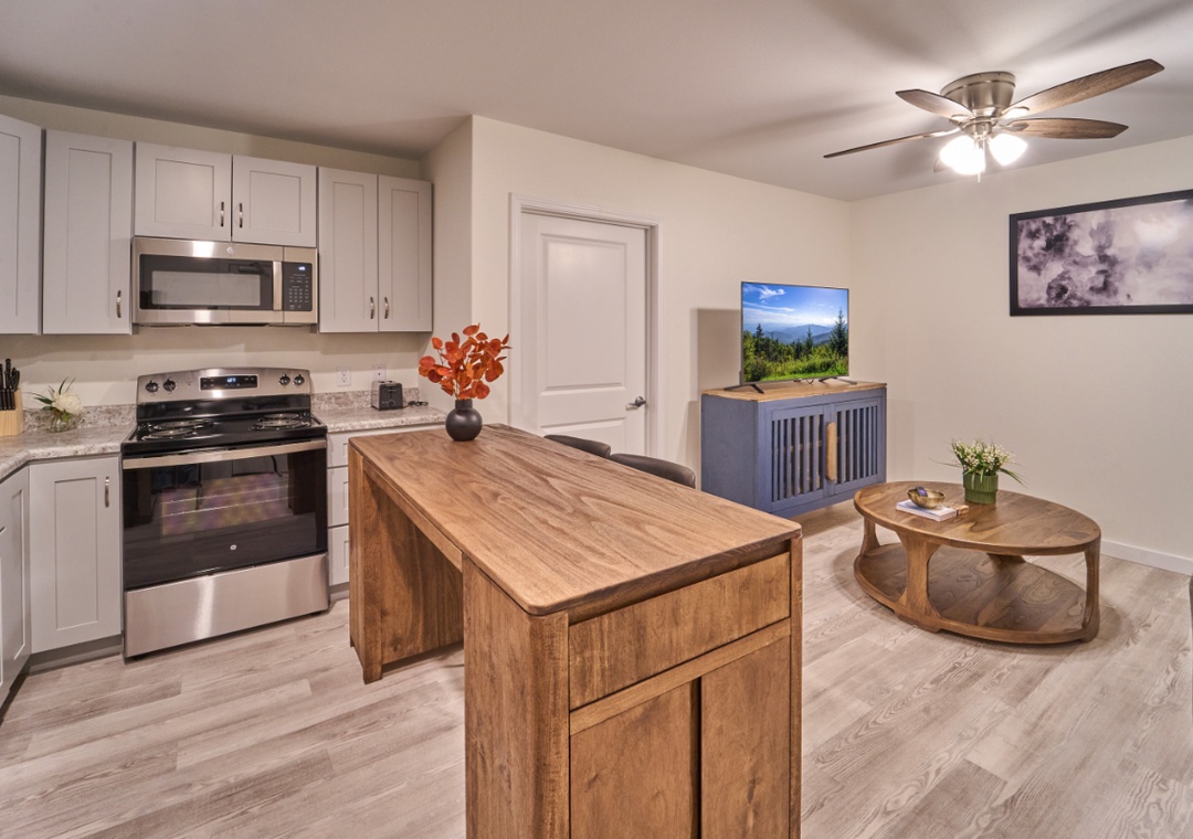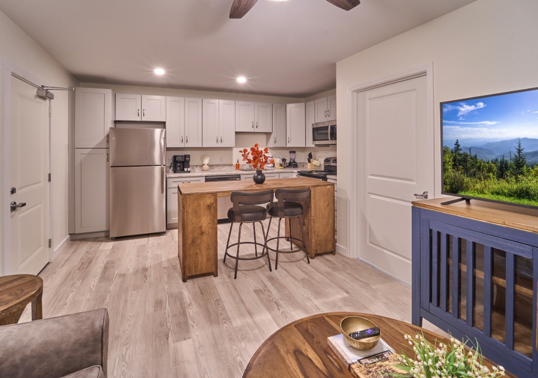 Step into a bright, inviting space where modern comfort meets cozy charm. The living area is designed for relaxation, with an open-concept layout that makes it easy to unwind after a full day of exploring the Smokies. Curl up on the sofa with your favorite book, enjoy a movie night with cable TV, or stream your favorite shows using high-speed fiber Wi-Fi. Large windows fill the room with natural light, creating a cheerful, airy atmosphere that feels like home from the moment you arrive.