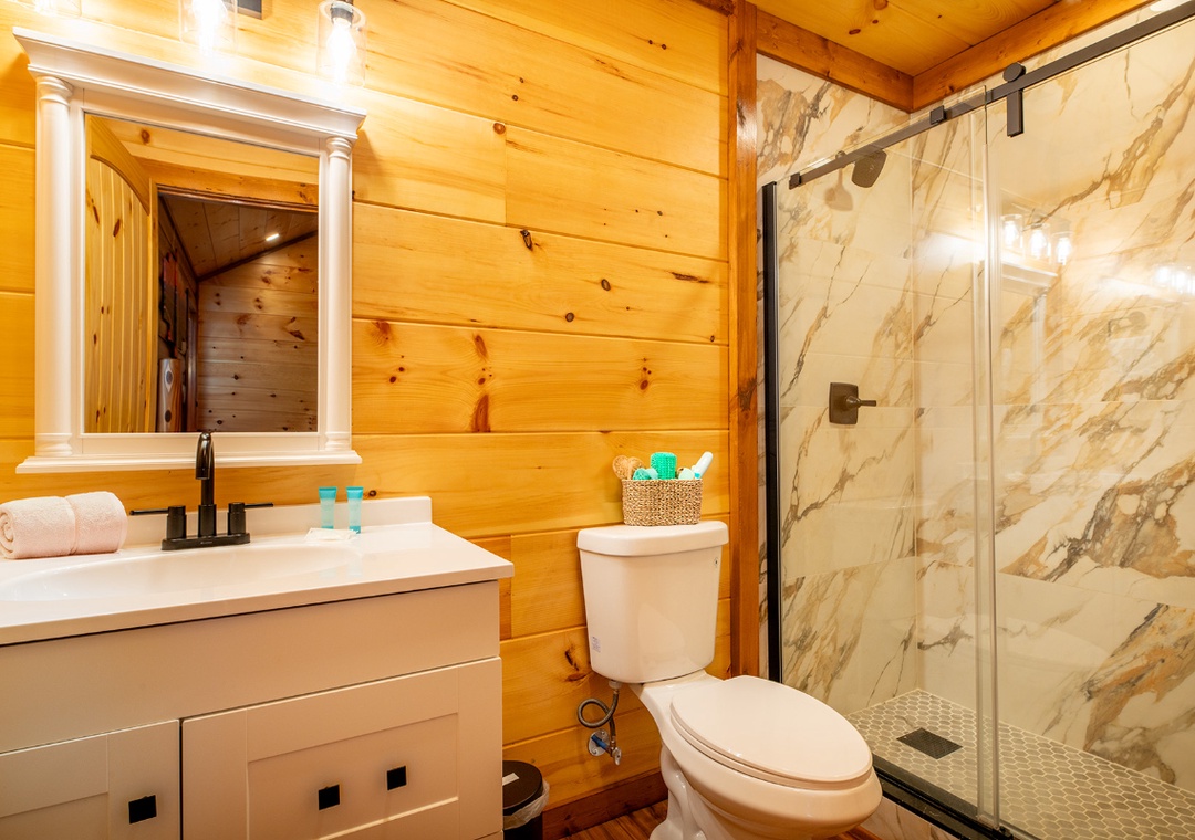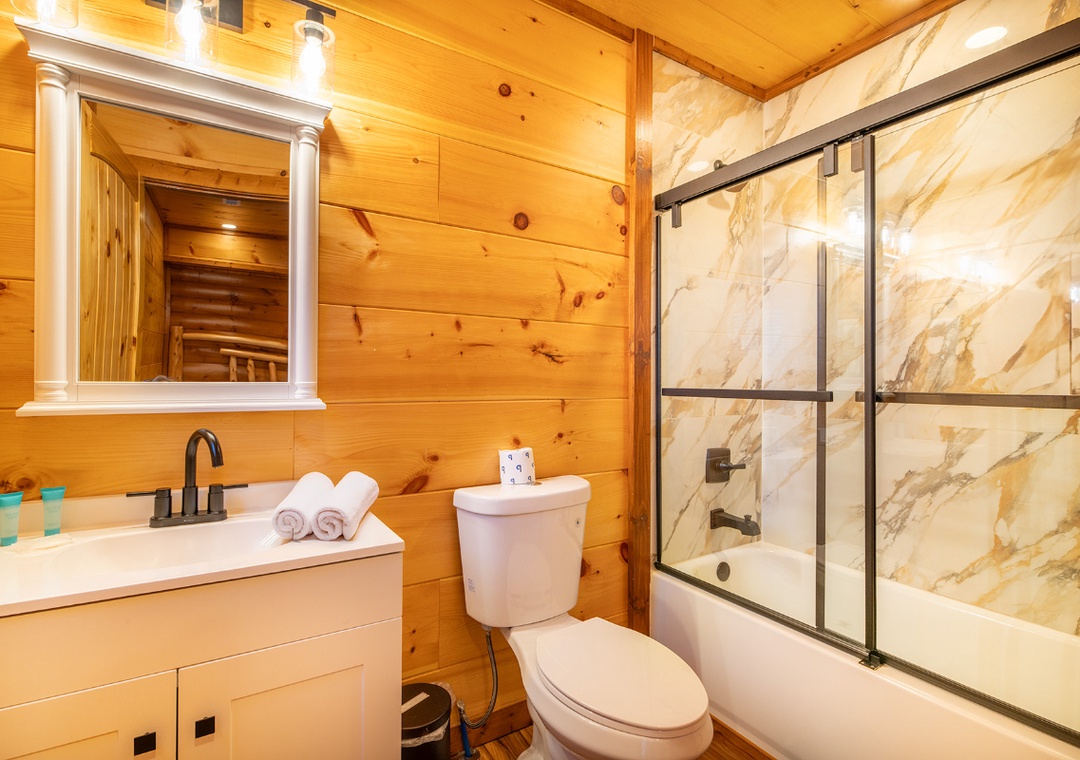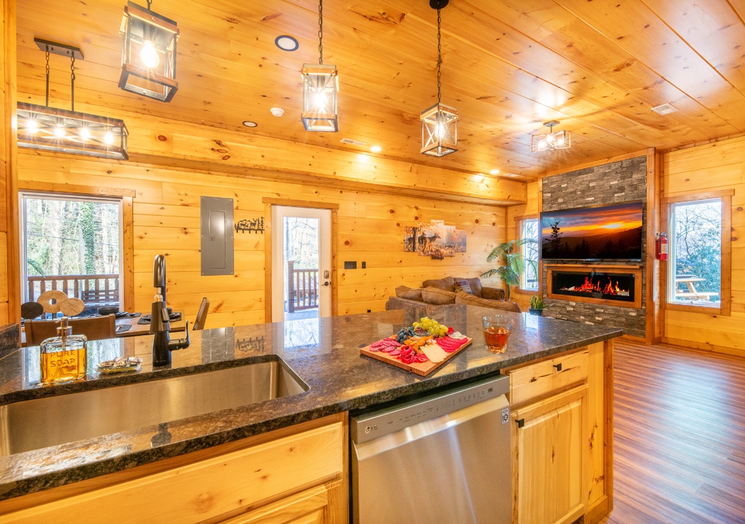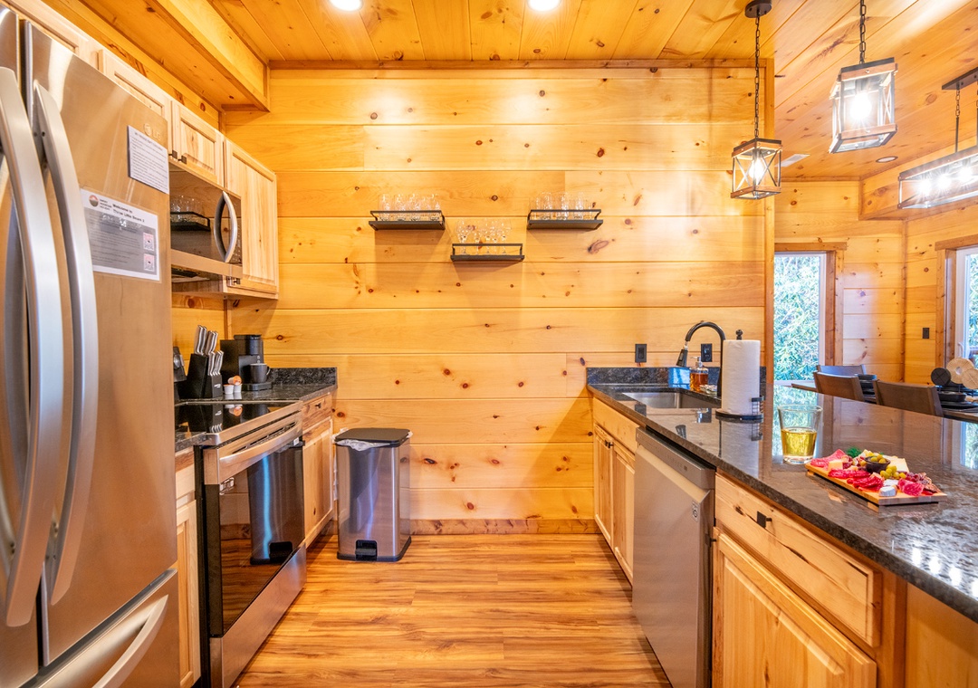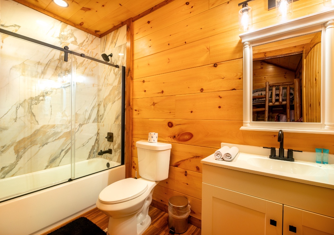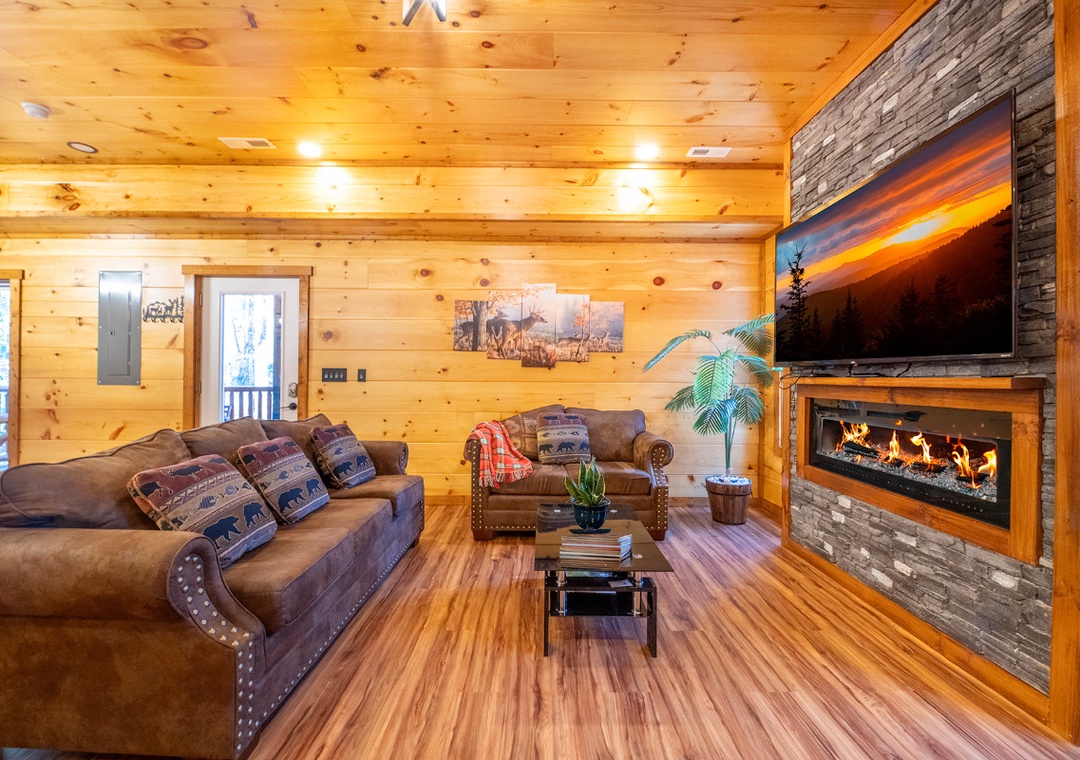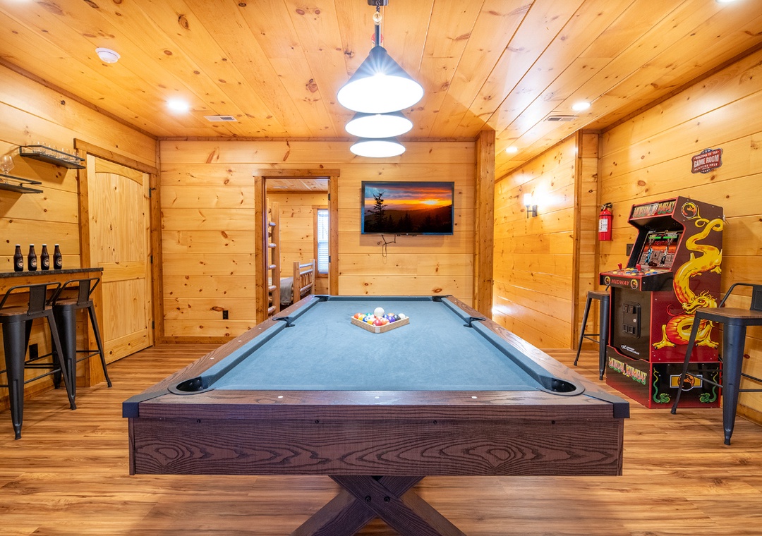 The main level invites you in with its open and cozy atmosphere, featuring a stone hearth fireplace that adds a touch of rustic charm. Floor-to-ceiling wood paneling throughout creates a warm, cabin feel, perfectly complemented by stylish, recessed lighting. The open layout seamlessly connects the living room to the kitchen and dining areas, making it easy to spend quality time together. In the game room, start friendly competitions with the pool table, arcade, and darts, or simply kick back and enjoy the lively atmosphere. Complimentary WiFi is also included for your convenience.