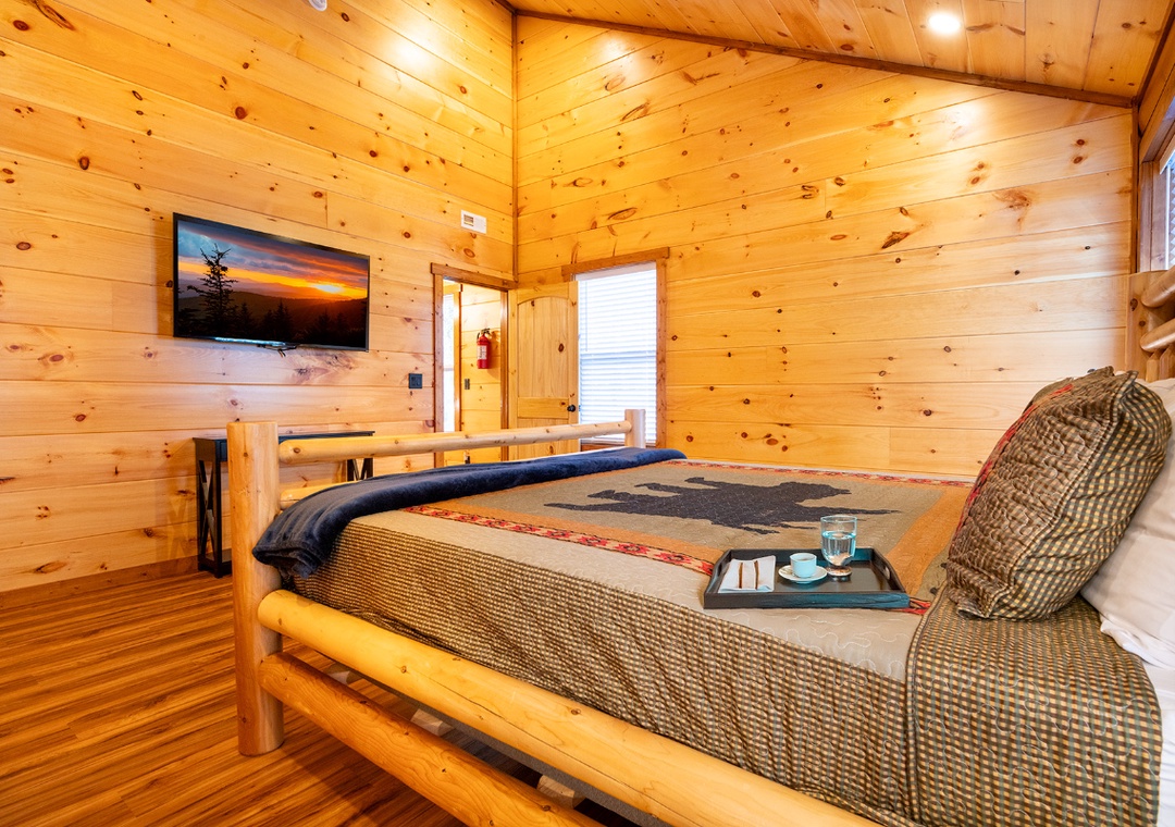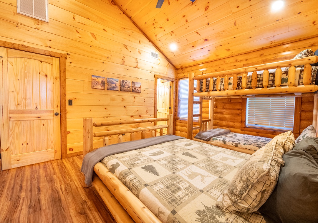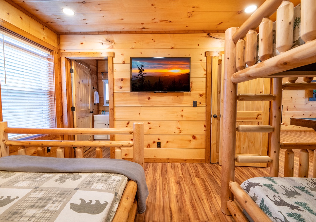 ✔ Bedroom #1 (Second Level): Inviting Bedroom with a Queen Bed, a Twin-over-Twin Bunk Bed, Flat-screen TV, and Attached Full Bathroom with Shower/Tub Combo