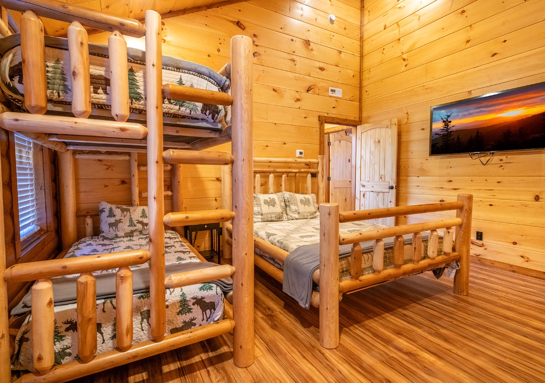✔ Bedroom #2 (Third Level): Relaxing Bedroom with a Queen Bed, a Twin-over-Twin Bunk Bed, Flat-screen TV, and Attached Full Bathroom with Shower/Tub Combo