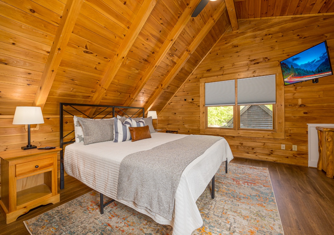 ✔ Bedroom #3 (Upper Level): Spacious Bedroom with a King-Bed and Flatscreen TV; Attached Full Bathroom with Shower/Tub Combo