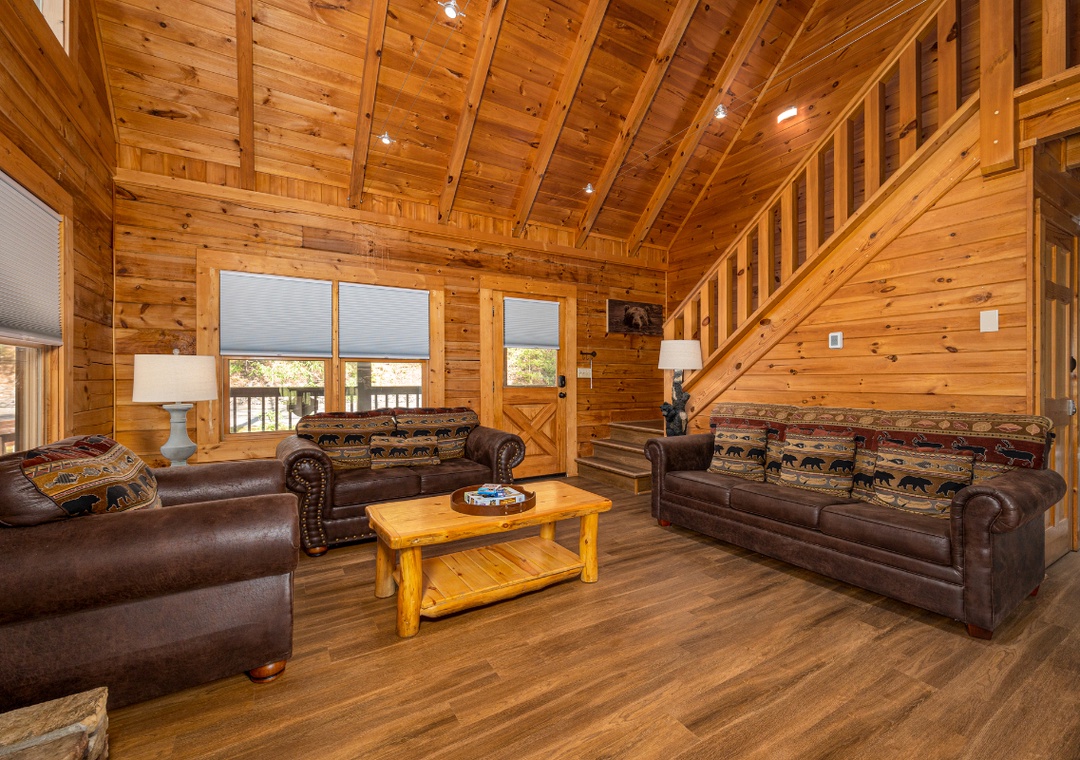 The heart of the cabin is the expansive Great Room, where a soaring cathedral ceiling and gleaming hardwood floors create a bright, airy feel. A beautiful stone gas fireplace anchors the room, offering warmth and charm on cool mountain evenings. Plush seating makes it easy to gather with loved ones for a cozy night in. The open design flows seamlessly into the dining area and fully equipped kitchen, allowing the entire group to stay connected no matter where you are. Go to the upstairs bedroom to enjoy a multicade arcade game or the screened-in porch for the axe-throwing game, corn hole, or the bubbling hot tub. Free WiFi is also available throughout the property.