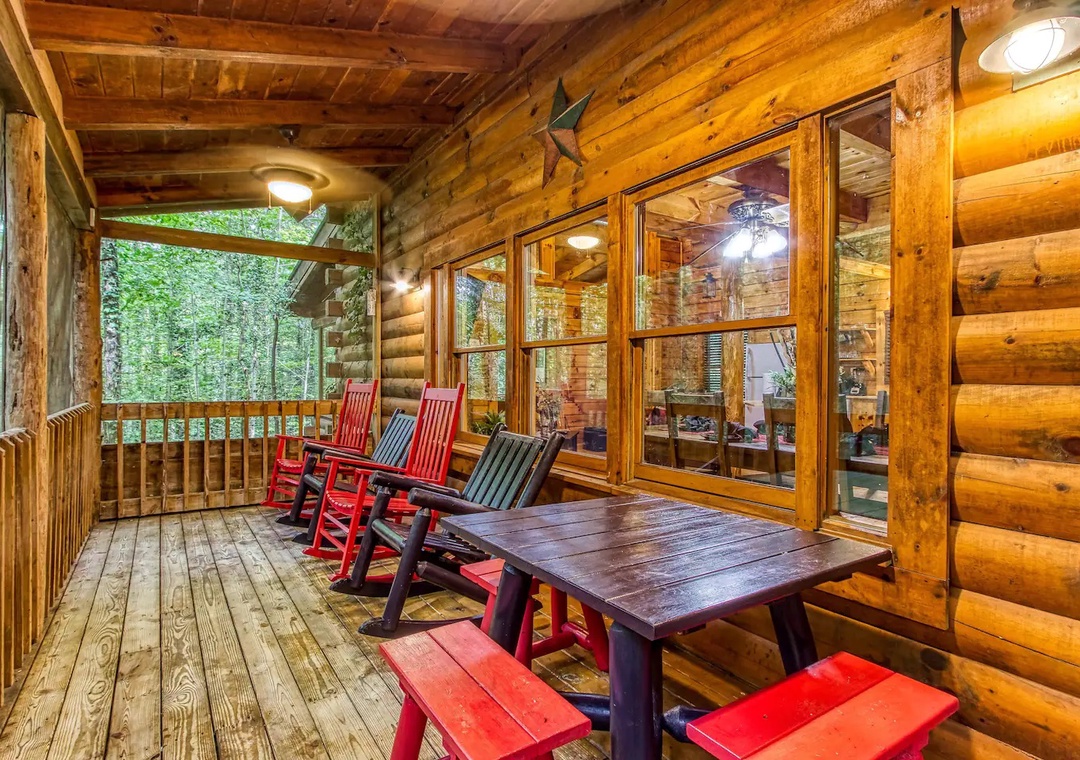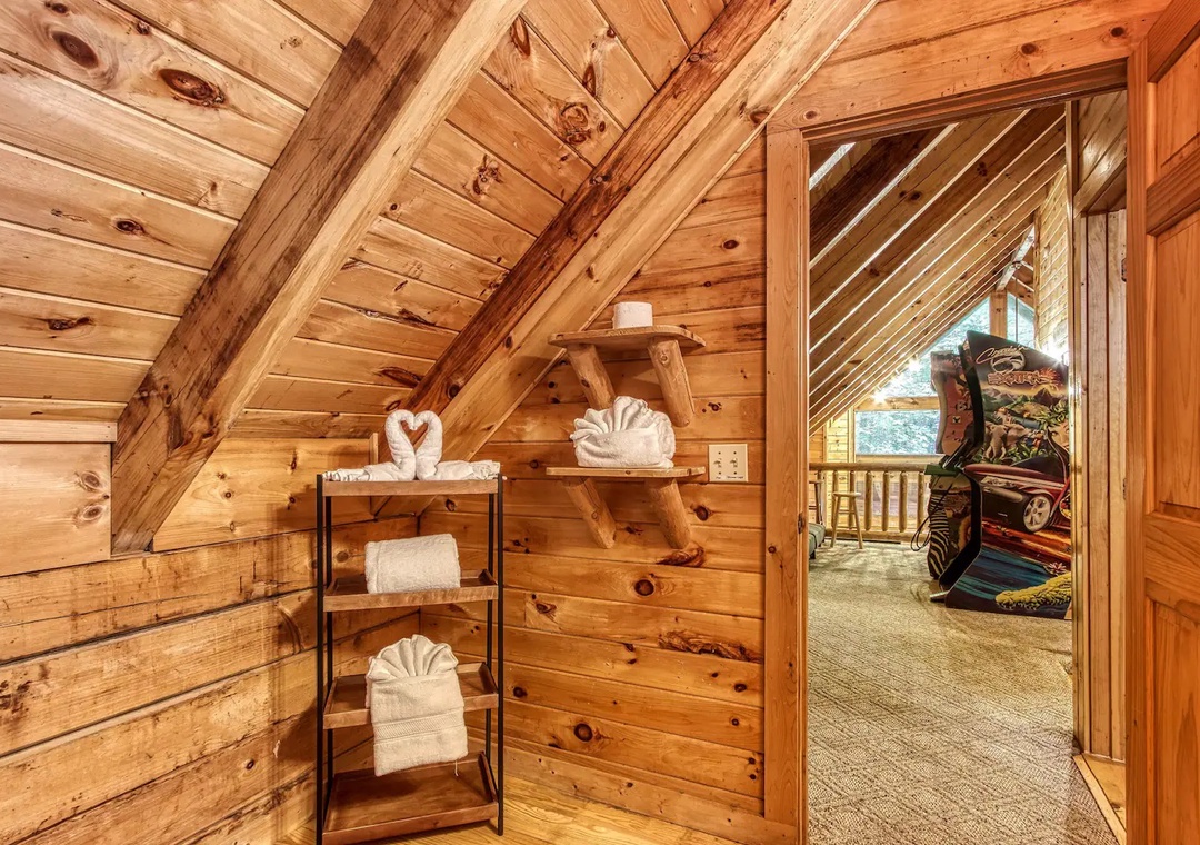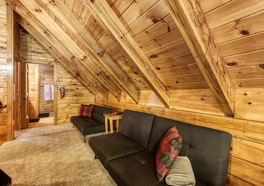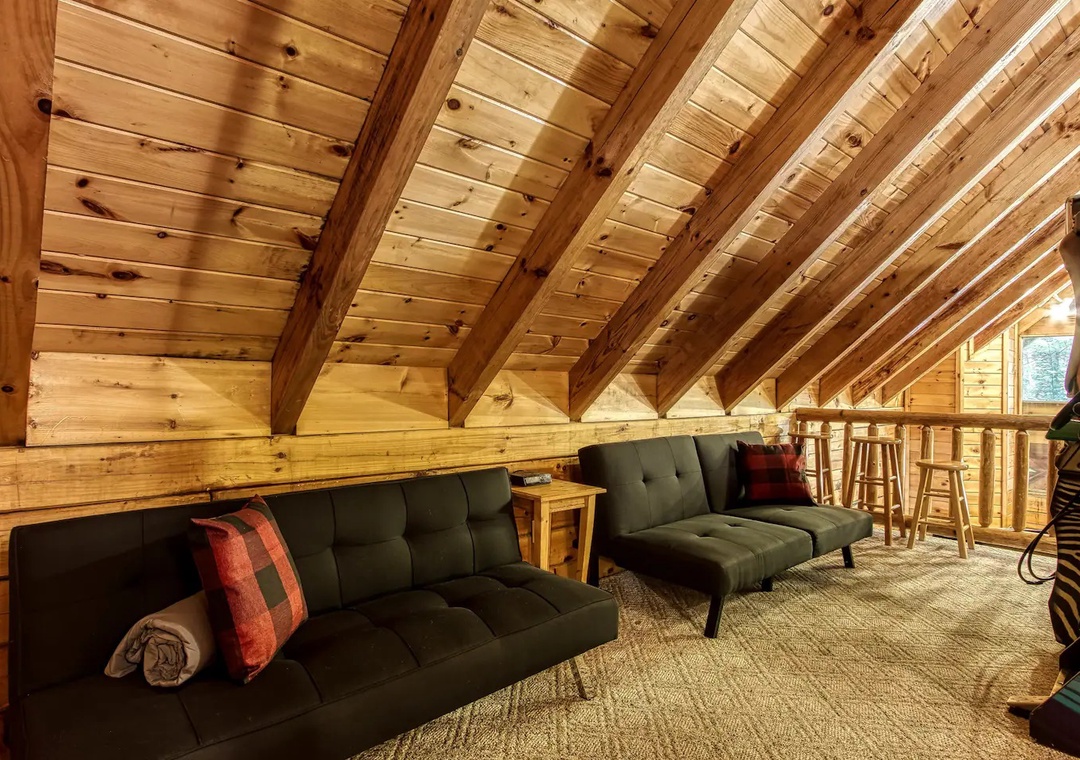 Laughter and friendly competition echo against the rustic walls with the Pool Table. Showcase your skills or engage in lively tournaments, creating memorable moments filled with camaraderie and friendly banter. In the loft, entertainment awaits in the form of indoor arcade games. Challenge your companions to a variety of classic games ensuring endless hours of excitement for all. As the sun sets, retreat to the spacious outdoor deck adorned with comfortable rocking chairs, a welcoming table, and additional seating. Here, immerse yourself in the tranquility of nature while savoring panoramic views of the surrounding mountains, where each moment becomes a picturesque masterpiece.