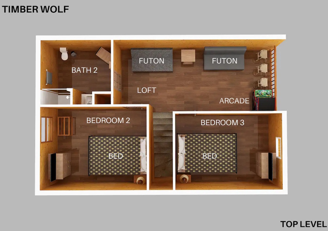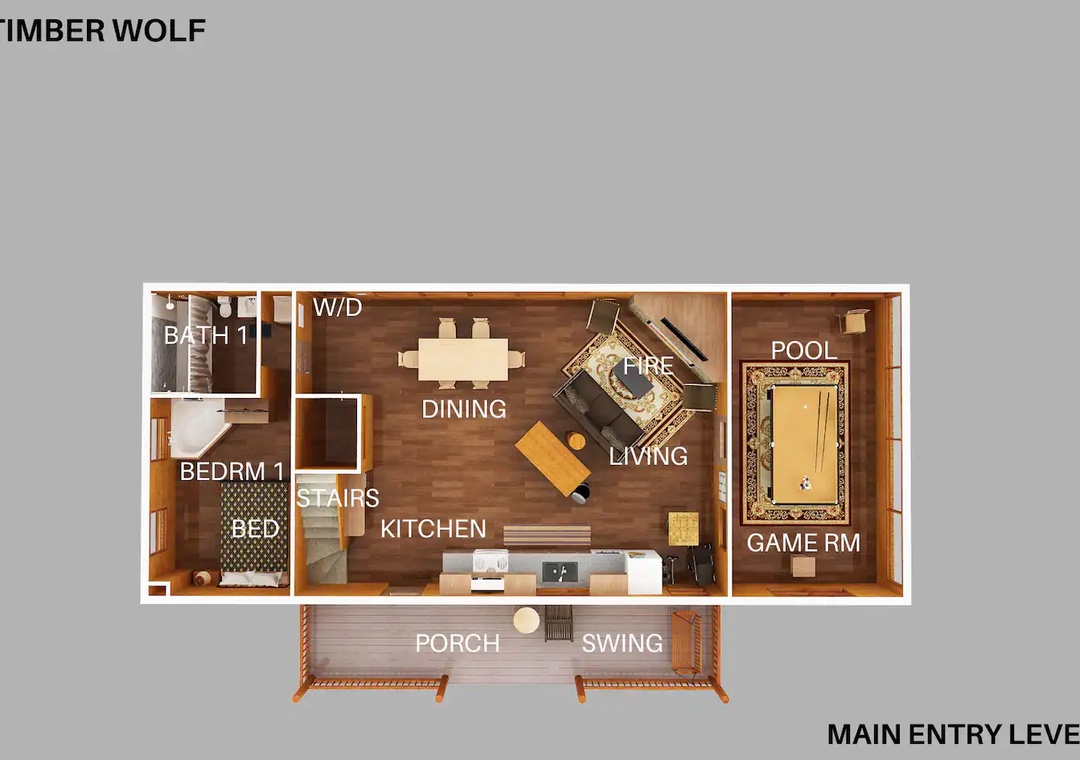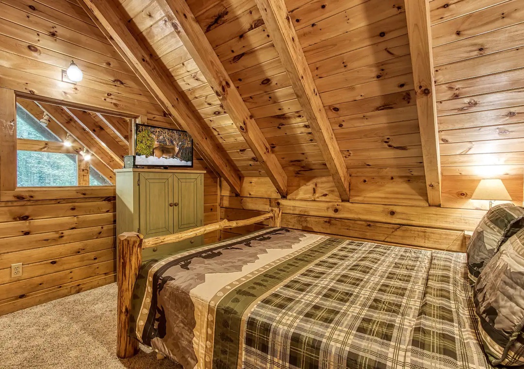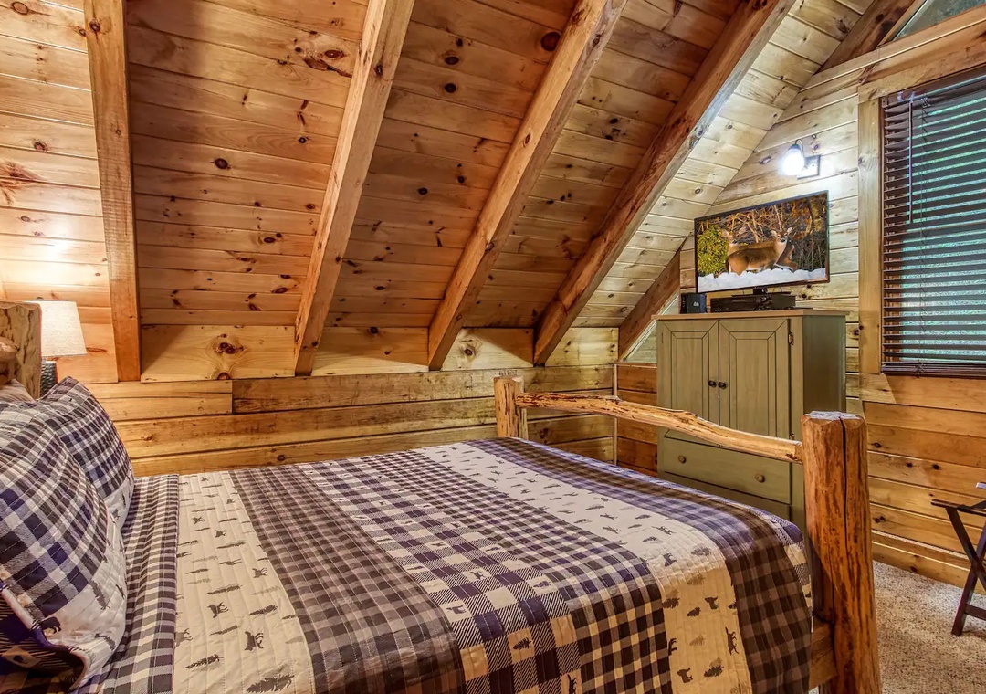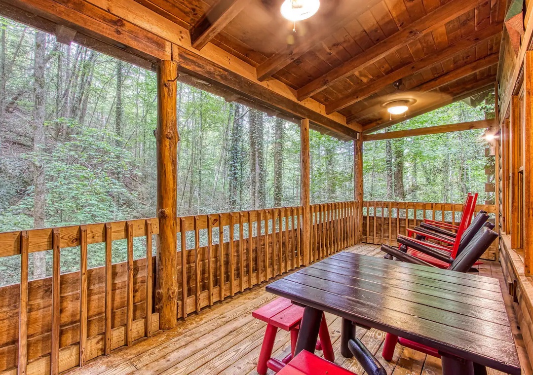 Laughter and friendly competition echo against the rustic walls with the Pool Table. Showcase your skills or engage in lively tournaments, creating memorable moments filled with camaraderie and friendly banter. In the loft, entertainment awaits in the form of indoor arcade games. Challenge your companions to a variety of classic games ensuring endless hours of excitement for all. As the sun sets, retreat to the spacious outdoor deck adorned with comfortable rocking chairs, a welcoming table, and additional seating. Here, immerse yourself in the tranquility of nature while savoring panoramic views of the surrounding mountains, where each moment becomes a picturesque masterpiece.