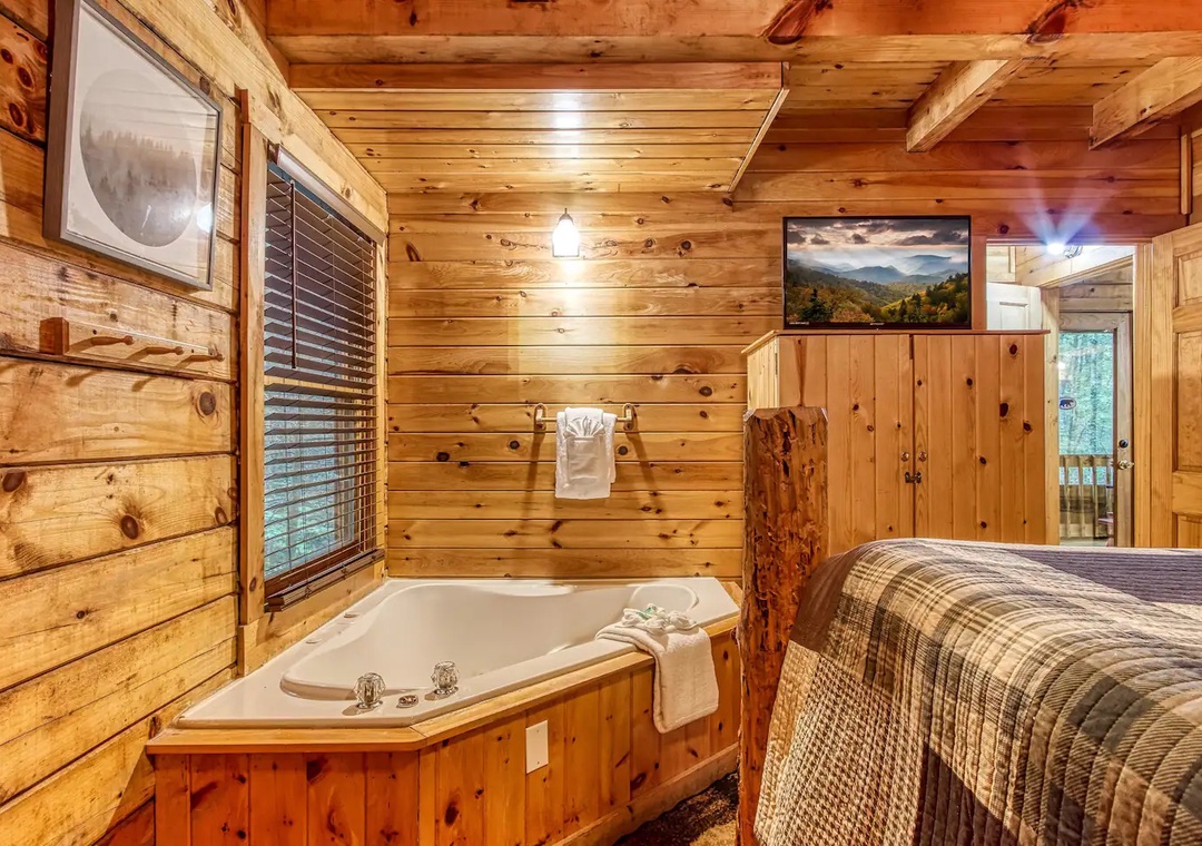 Master Bedroom: Queen-sized bed; TV; soaker tub in bedroom, private ensuite bathroom
