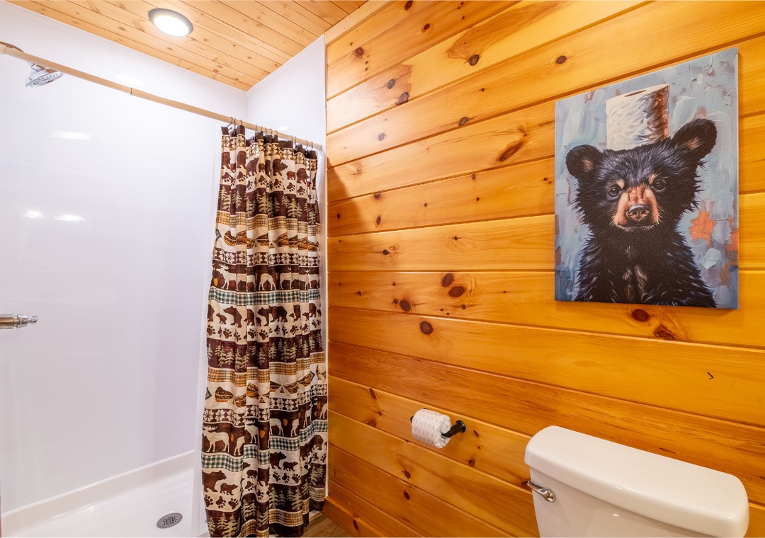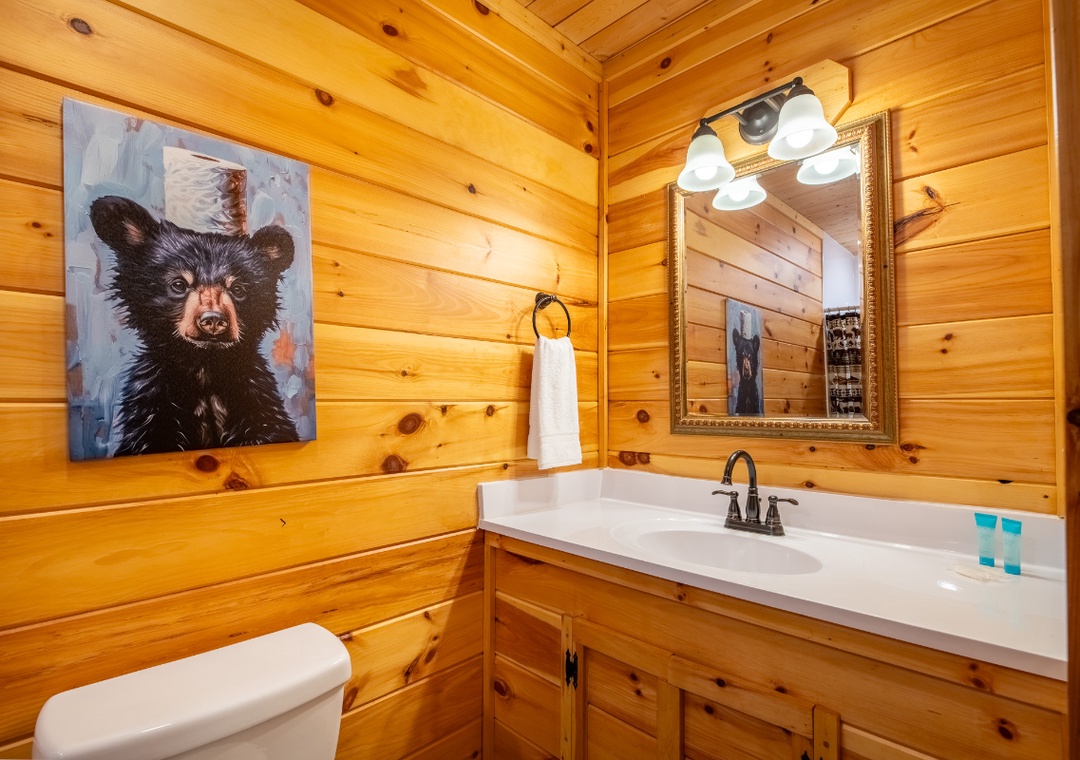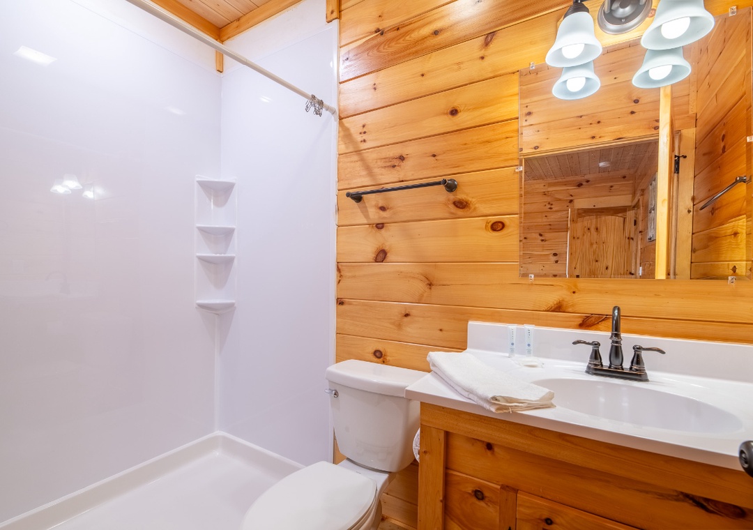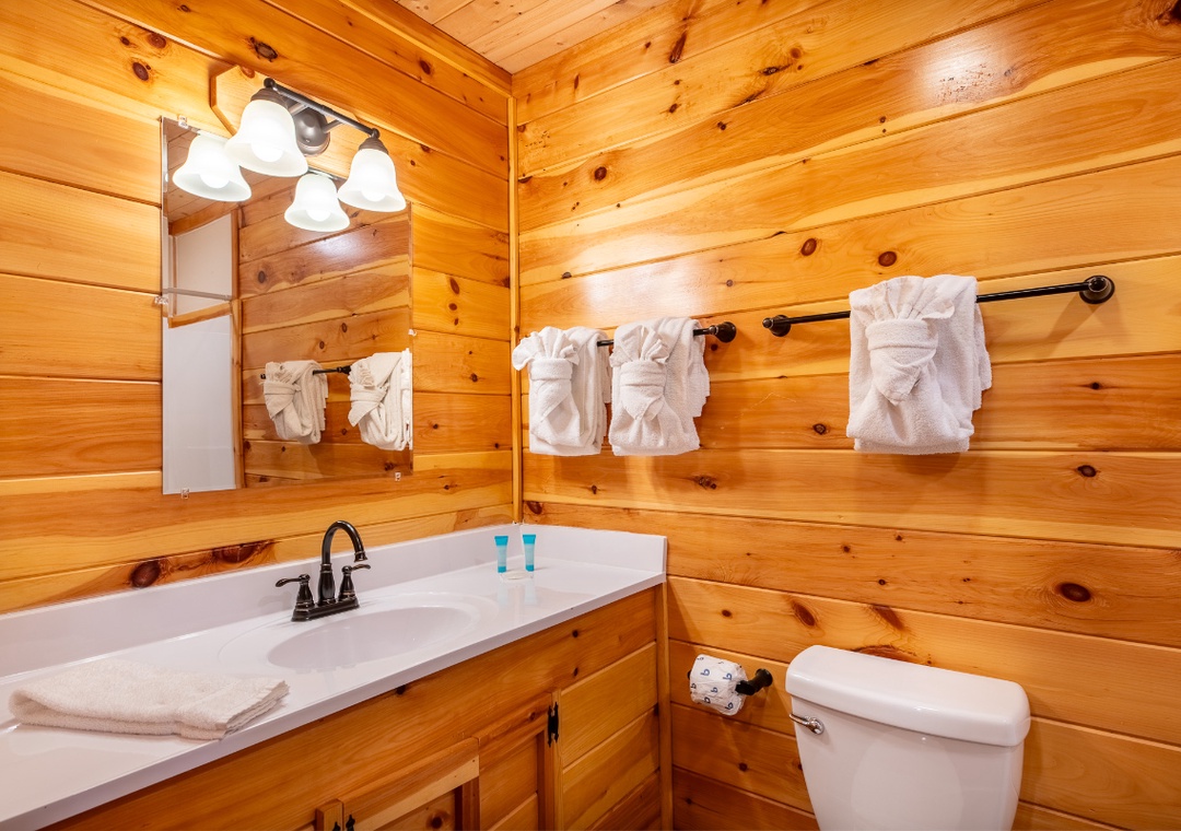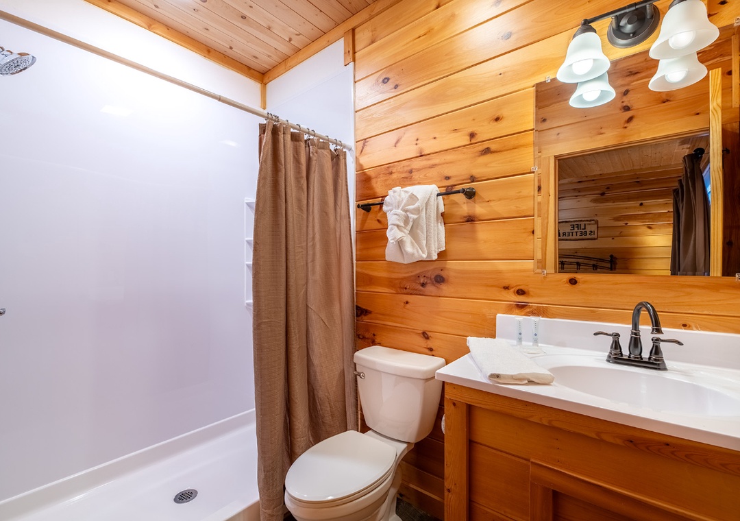 In total, the cabin features four full bathrooms with two connected to a bedroom. Another half bath is present for added comfort and convenience. All baths come with starter toiletries, so you don't need to bring yours unless you’re staying a while.