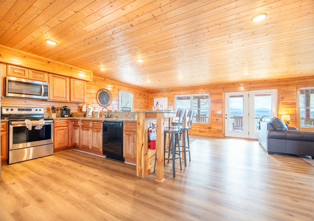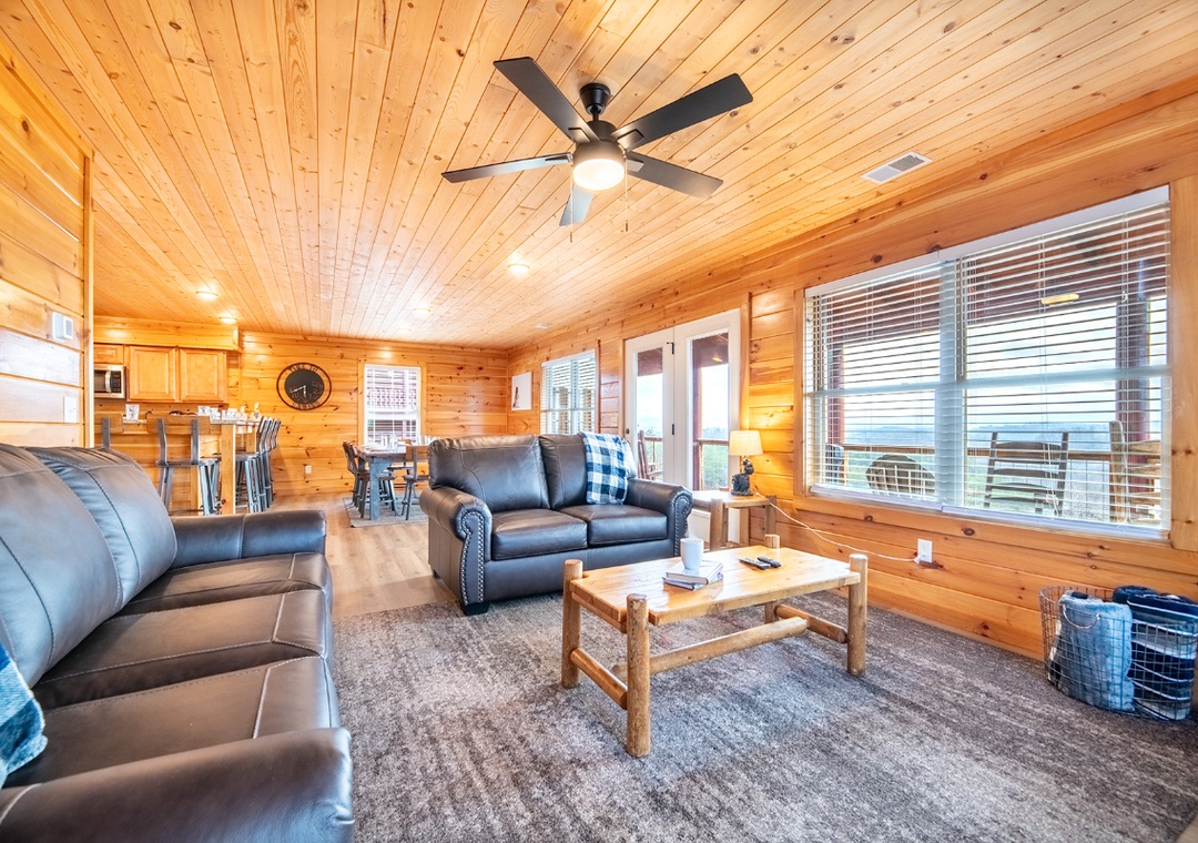 Breathe in the fresh mountain air while gazing out at your enchanting panoramic view from the back deck. Relax in the hot tub after a long day hiking. (Or braving the urban jungle at all the shopping places!) Enjoy the stunning scenery through the spacious windows of the open-concept space living area. With hardwood floors and log construction, the entire cabin feels homey and warm.