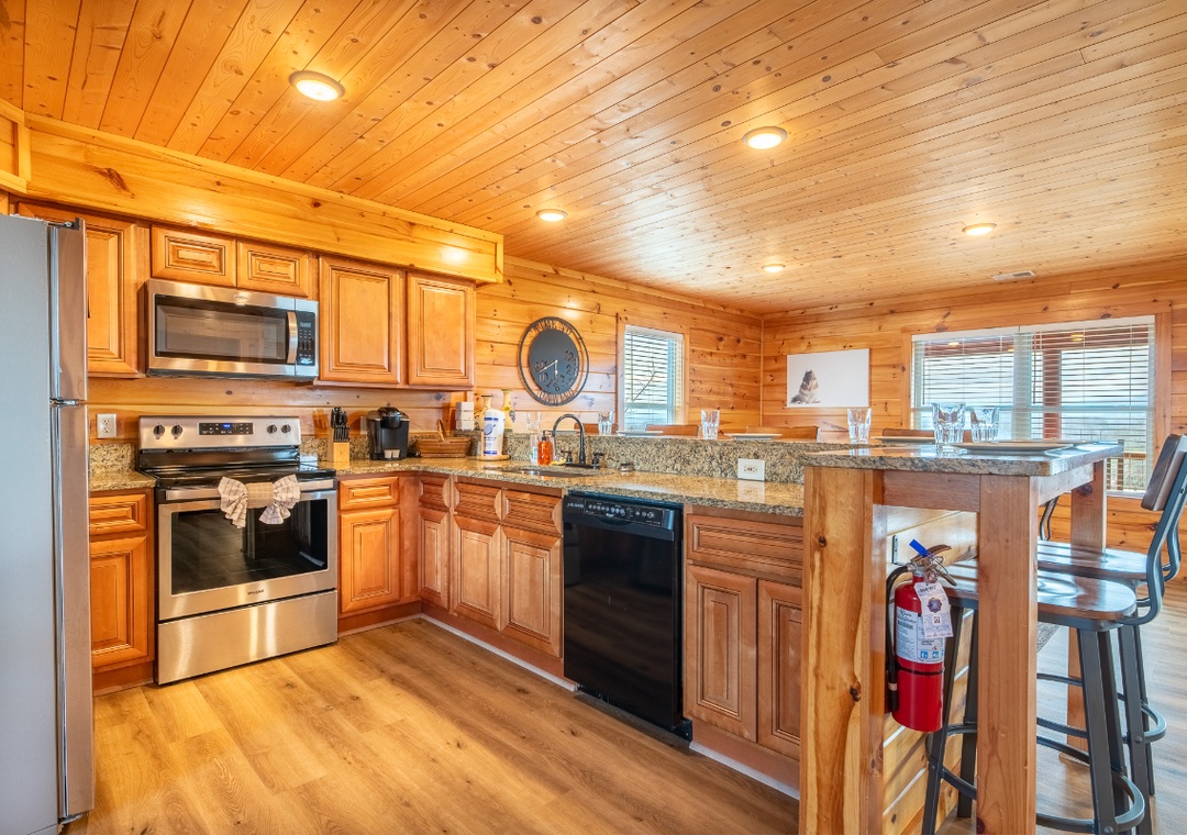 The kitchen bar is a perfect place to gather, have a few drinks, and chat while the food sizzles. The kitchen is filled with state-of-the-art amenities to aid you in making delicious meals for you and your companions.