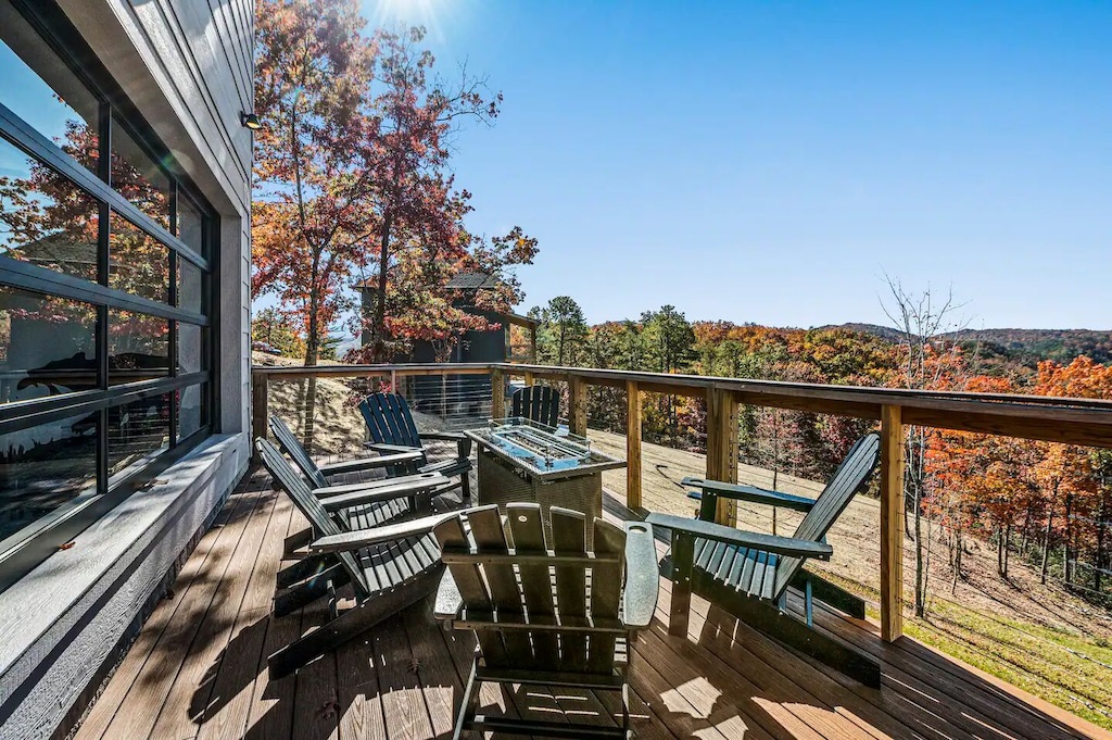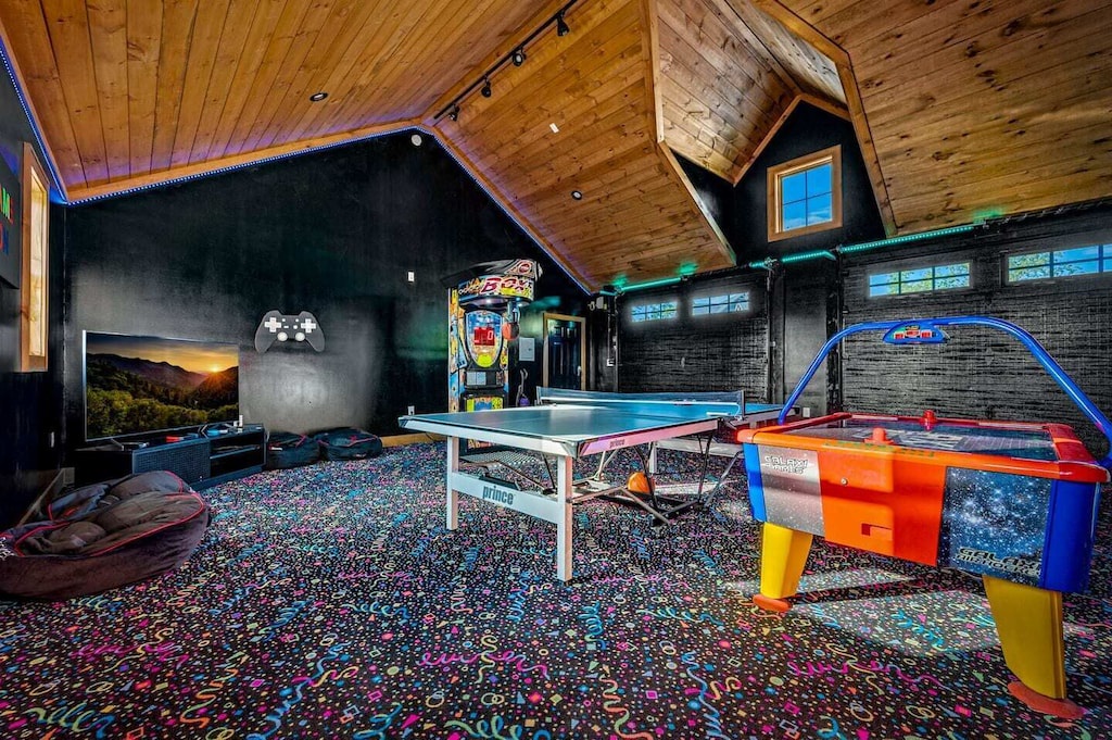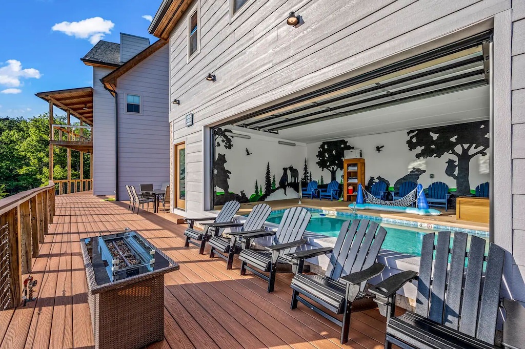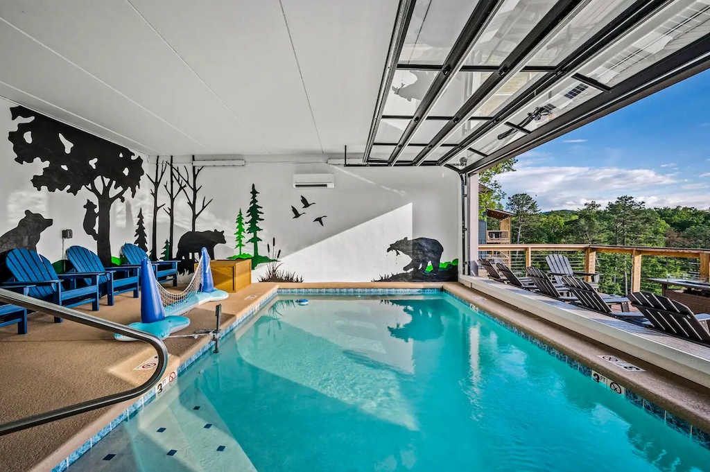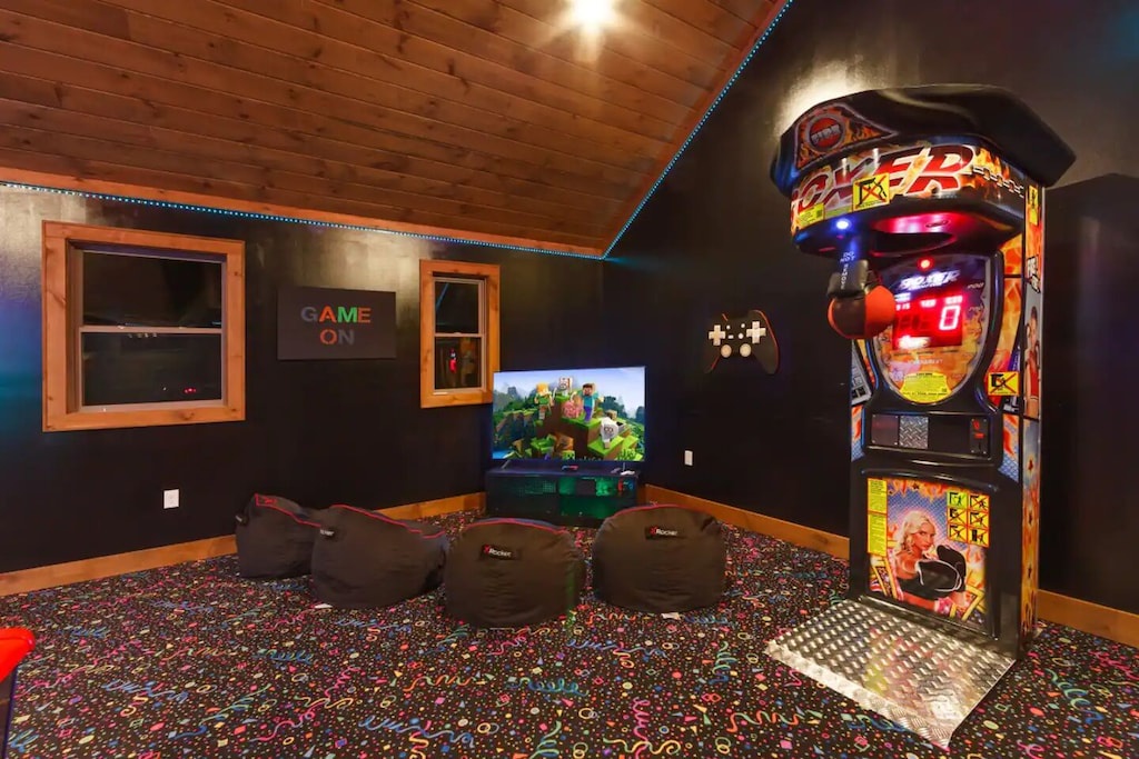 "Top of the Summit Lodge" is the perfect place to both relax and play! The game room hosts a pool table, shuffleboard, foosball table, and air hockey, as well as comfy seating surrounding the fireplace and huge flat screen TV (and more views of course!). The huge arcade room that is located near the pool will also provide hours and hours of entertainment - from the Hydro Thunder boat racing simulator, Galaxy Air Hockey table, Ping pong Table, Fire Boxer, Basketball Shoot Out or the 4 player Nintendo Switch, the kids (or adults alike!) will never be bored! And each bedroom also hosts its own individual TV too. Outside, off the living room, guests will find a large, covered deck complete with cozy sectional and dining table, perfect for both entertaining and relaxing under the hypnotizing spell of Tennessee skies. Enjoy the heated indoor/outdoor swimming pool or bubbling hot tub while you take in the sunset. There's also additional outside seating, fire pit and a gas BBQ for grilling up some yummy meals.