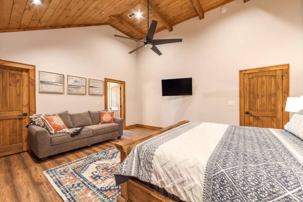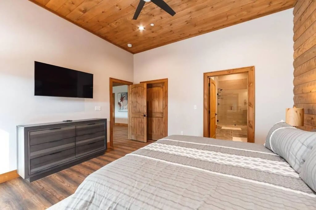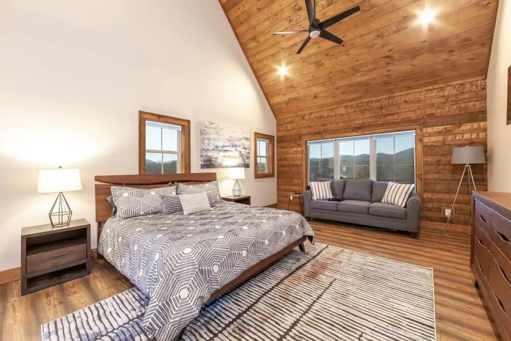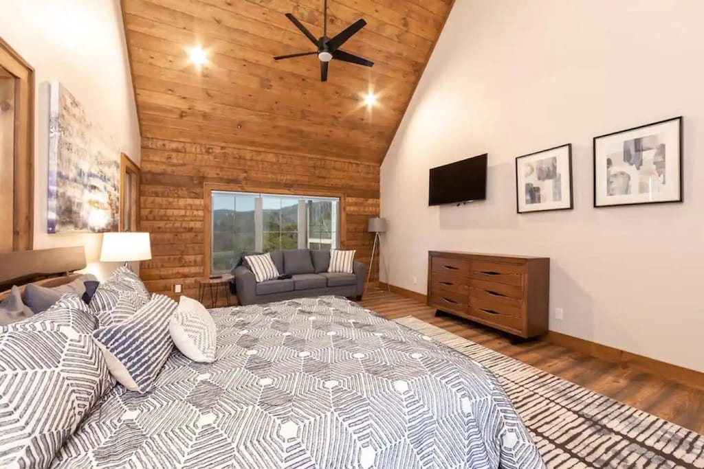 ✔ Bedroom #1 (main level): Primary bedroom complete with a king bed, Queen-sized sleeper sofa, vaulted ceiling, private bath with walk-in shower, closet space, and a grand view