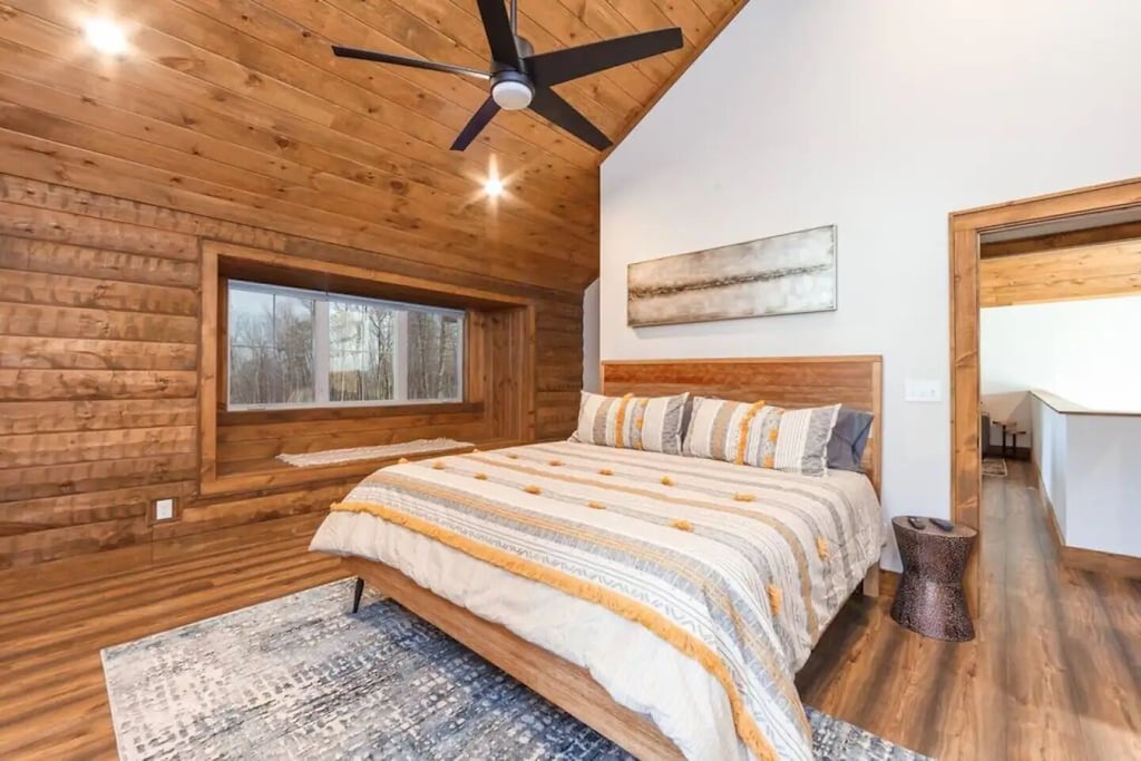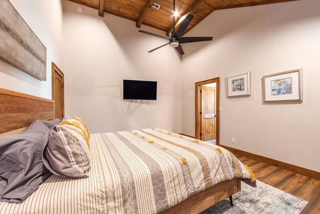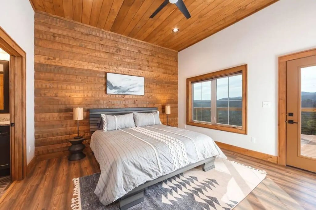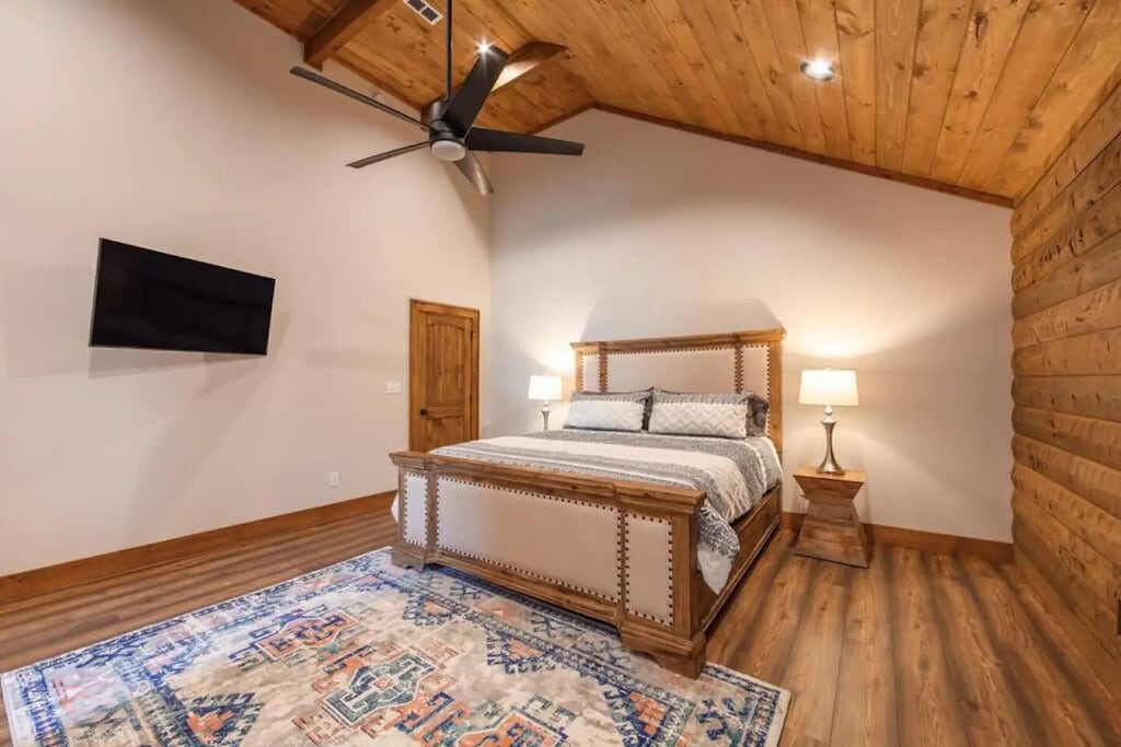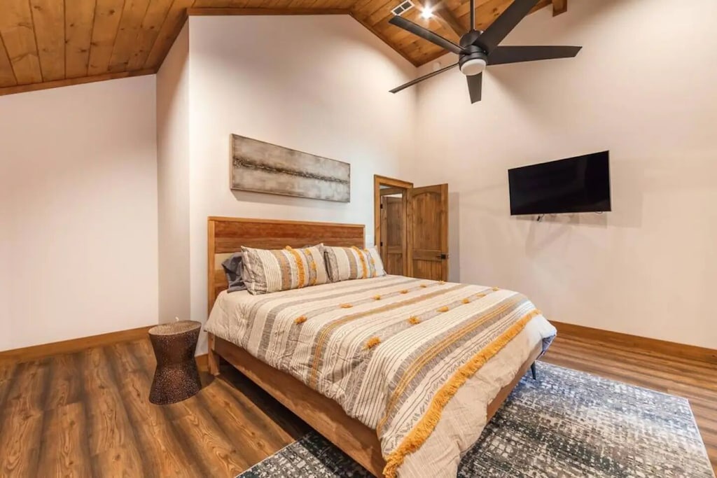 ✔ Bedroom #1 (main level): Primary bedroom complete with a king bed, Queen-sized sleeper sofa, vaulted ceiling, private bath with walk-in shower, closet space, and a grand view