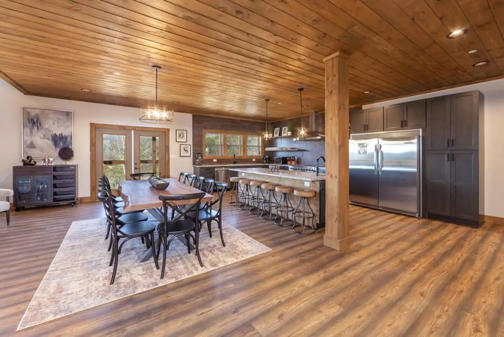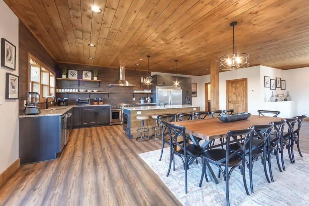 Fully equipped gourmet kitchen with modern stainless-steel appliances, granite countertops, full-sized refrigerator, double oven, dishwasher, stove, microwave, ice maker, and other kitchen appliances perfect for making breakfast, lunch or dinner throughout your stay! All pots, pans, glasses, plates, silverware, etc. are also there for you! There is a gorgeous wooden dining room table right off the kitchen, along with tons of additional seating at the huge island bar.
