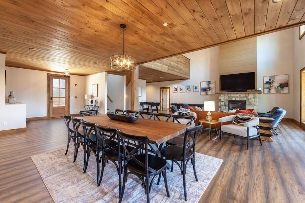 Newly furnished mountain home with modern lodge decor; Open living room with floor-to-ceiling fireplace and cathedral ceilings; Spacious gourmet kitchen; Spacious bedrooms and bathrooms; Game Room, Arcade Room, Loft; Access to multiple decks; Free WiFi