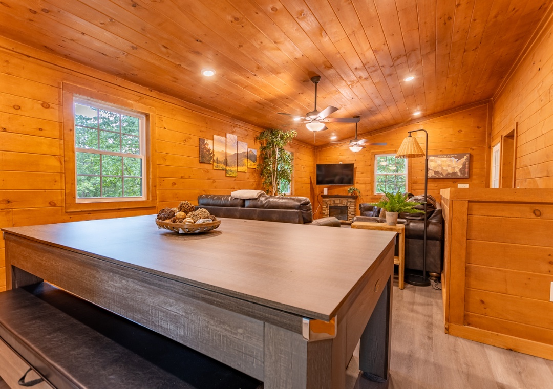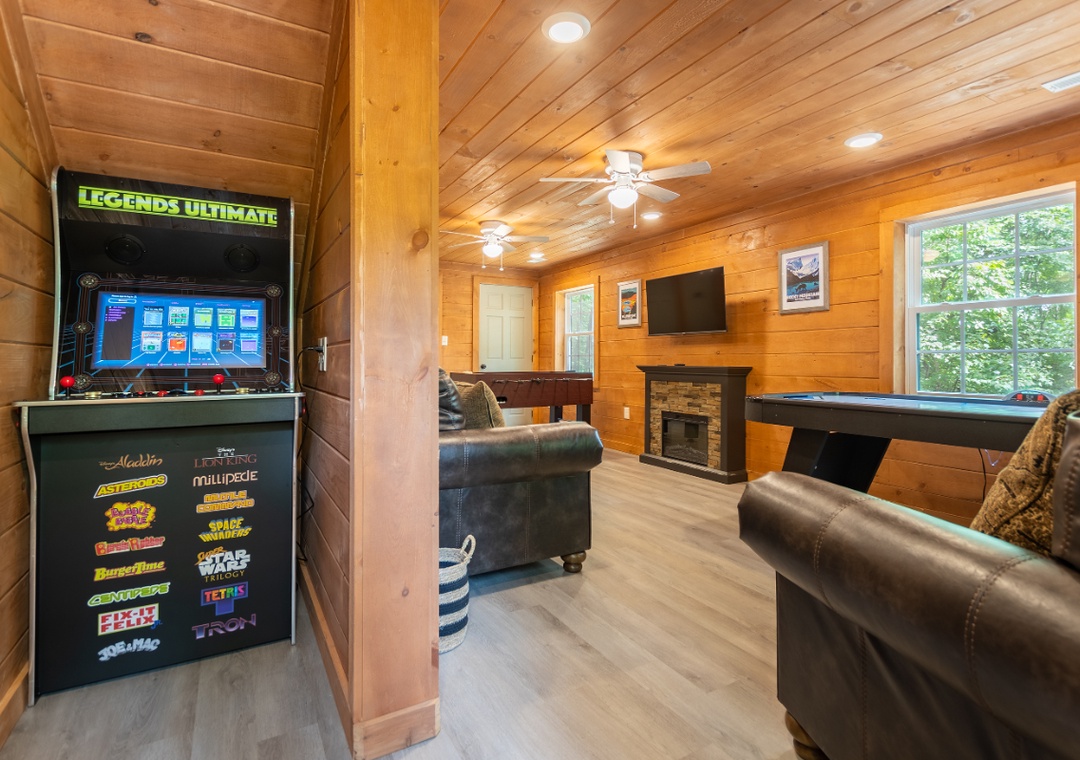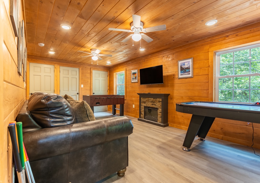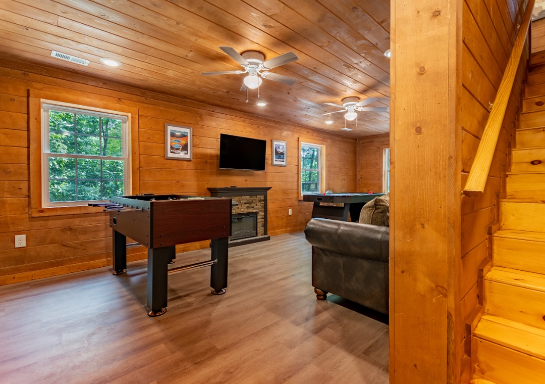 Step inside and immediately feel at home in the spacious, open-concept living area. The rustic wooden beams create a charming, natural ambiance, complemented by windows that flood the space with natural light. The centerpiece of the living room is a cozy electric fireplace, perfect for gathering around on chilly mountain evenings. Sink into the plush seating and enjoy a movie night on the flat-screen TV, or simply relax with a good book as the fire crackles in the background. Adjacent to the living room is the fully equipped kitchen, where rustic charm meets modern convenience. Go to the lower level, where the fun continues. This level is equipped with a variety of activities to keep everyone entertained. Challenge your friends and family to a game of air hockey, arcade, foosball, or pool, or switch up the fun with a round of ping pong. A second electric fireplace in the seating area provides warmth and ambiance, making it a cozy spot to relax between games. Free WiFi is also available throughout the property.