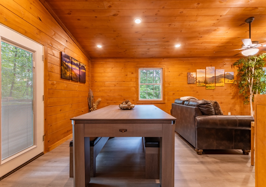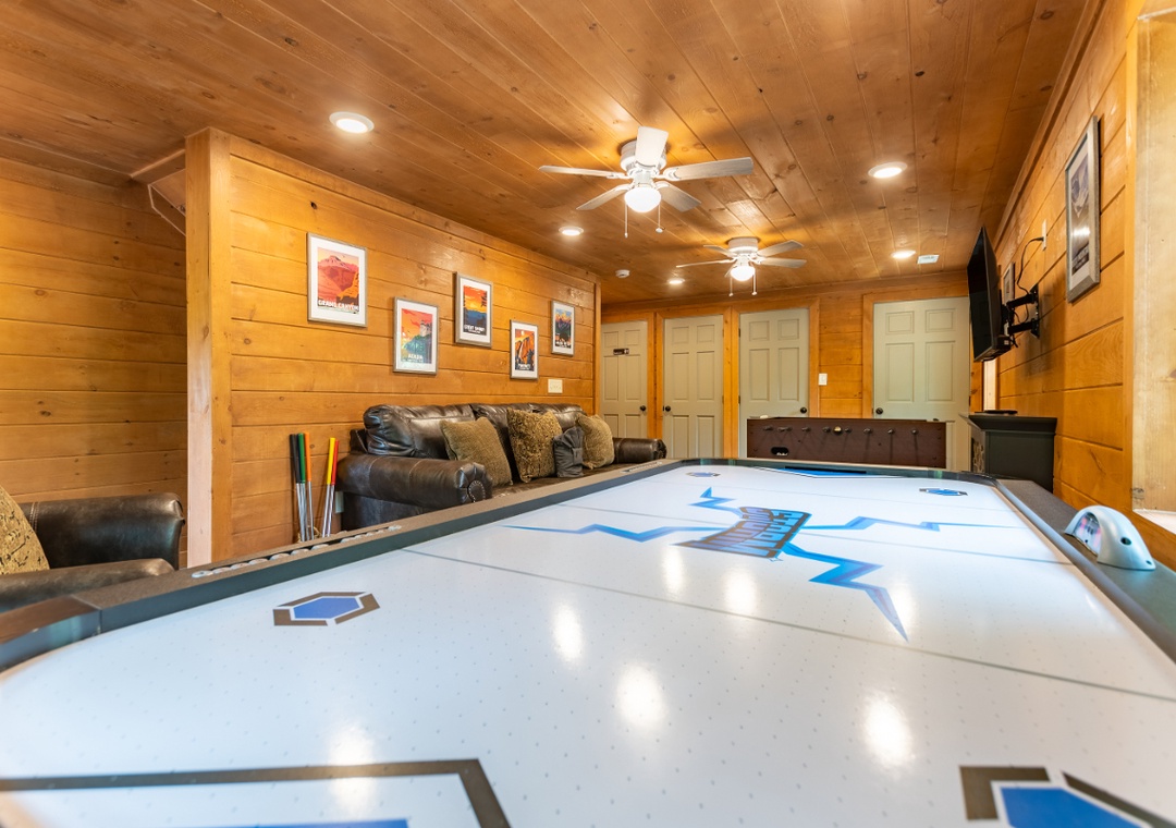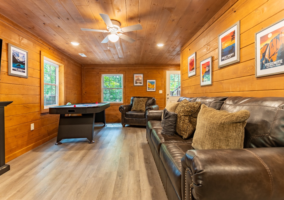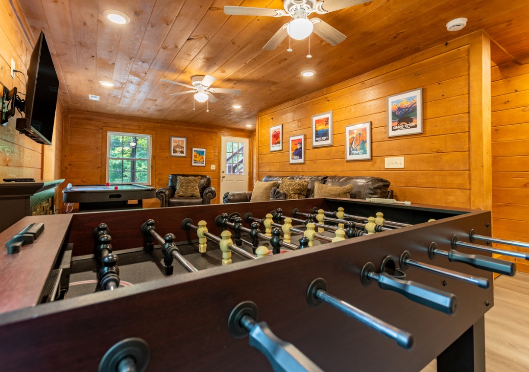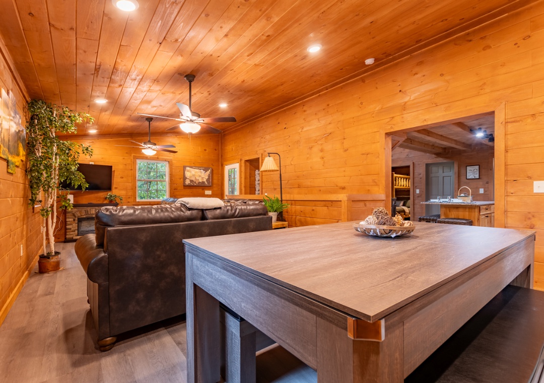 Step inside and immediately feel at home in the spacious, open-concept living area. The rustic wooden beams create a charming, natural ambiance, complemented by windows that flood the space with natural light. The centerpiece of the living room is a cozy electric fireplace, perfect for gathering around on chilly mountain evenings. Sink into the plush seating and enjoy a movie night on the flat-screen TV, or simply relax with a good book as the fire crackles in the background. Adjacent to the living room is the fully equipped kitchen, where rustic charm meets modern convenience. Go to the lower level, where the fun continues. This level is equipped with a variety of activities to keep everyone entertained. Challenge your friends and family to a game of air hockey, arcade, foosball, or pool, or switch up the fun with a round of ping pong. A second electric fireplace in the seating area provides warmth and ambiance, making it a cozy spot to relax between games. Free WiFi is also available throughout the property.