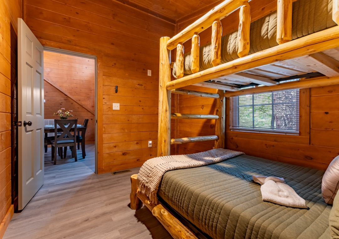 ✔ Bedroom #1 (Main Level): Comfortable Bedroom with a Twin-over-Queen Bunk Bed and Flat-screen TV, Access to a Full Bathroom with Shower/Tub Combo