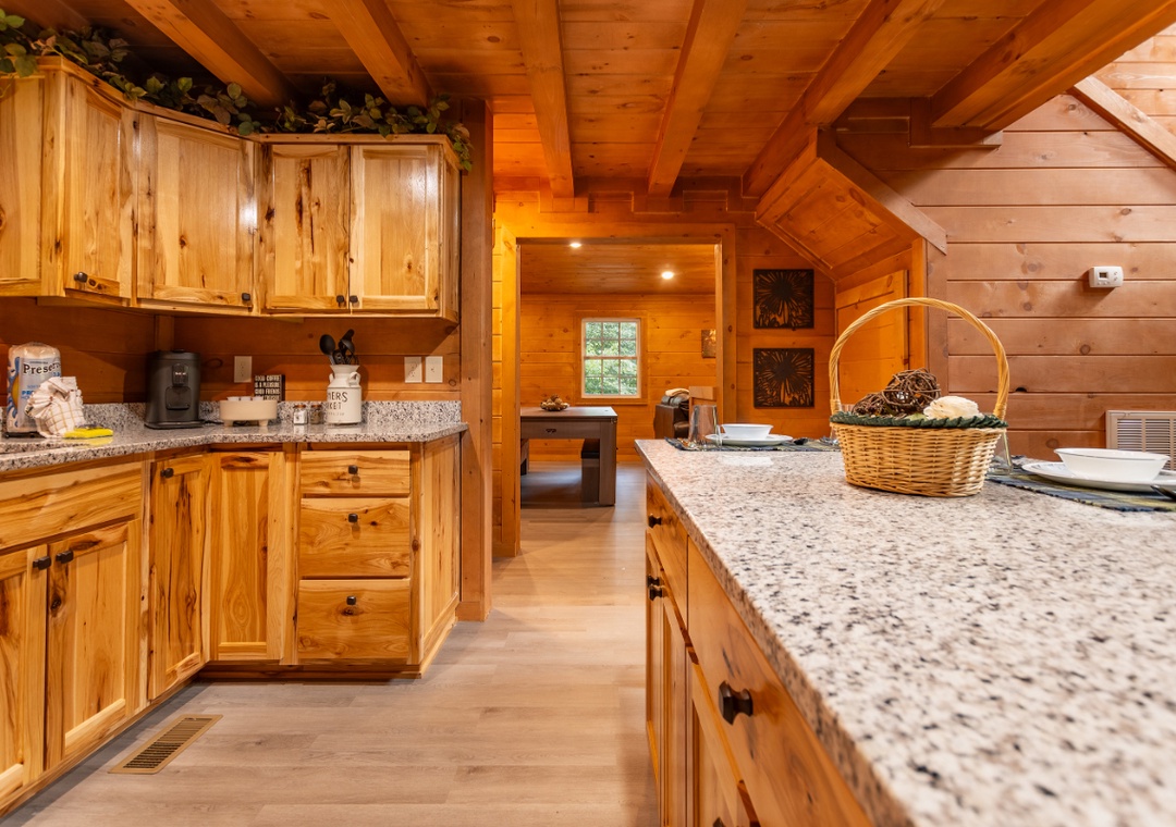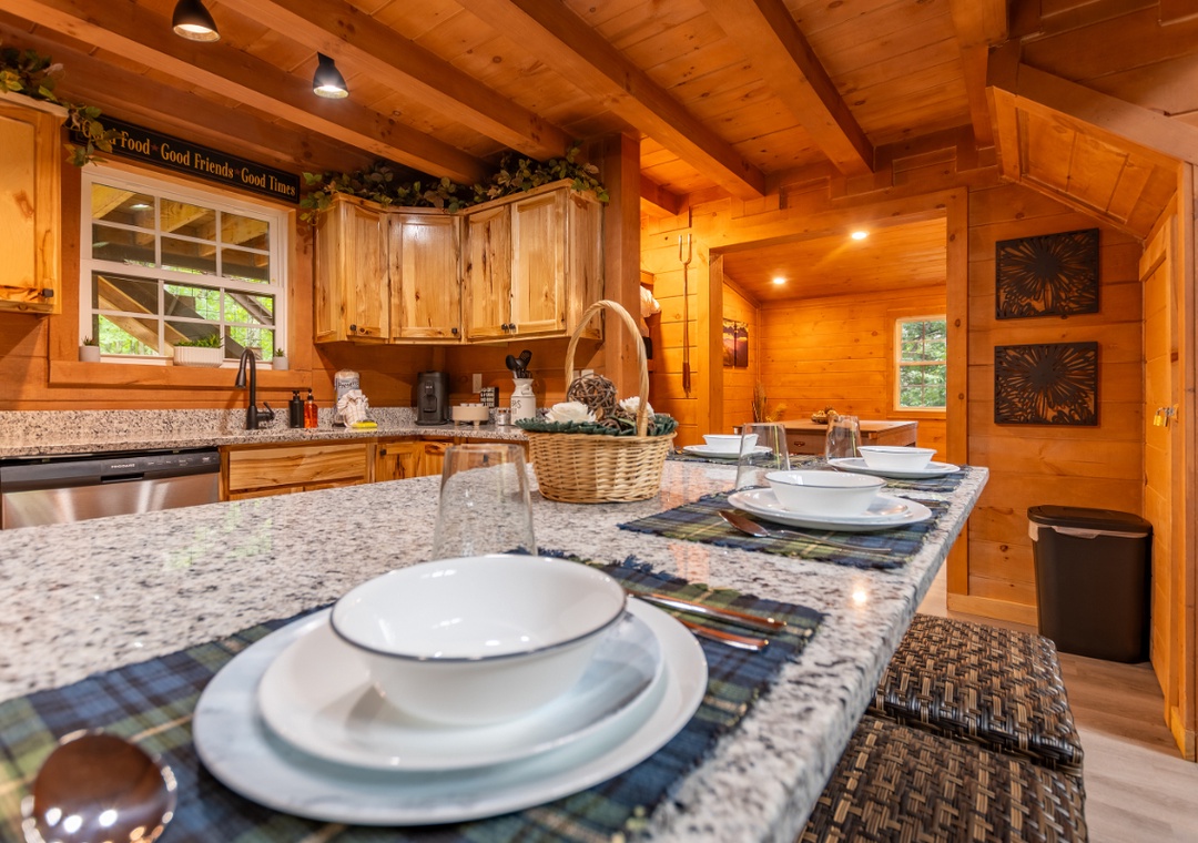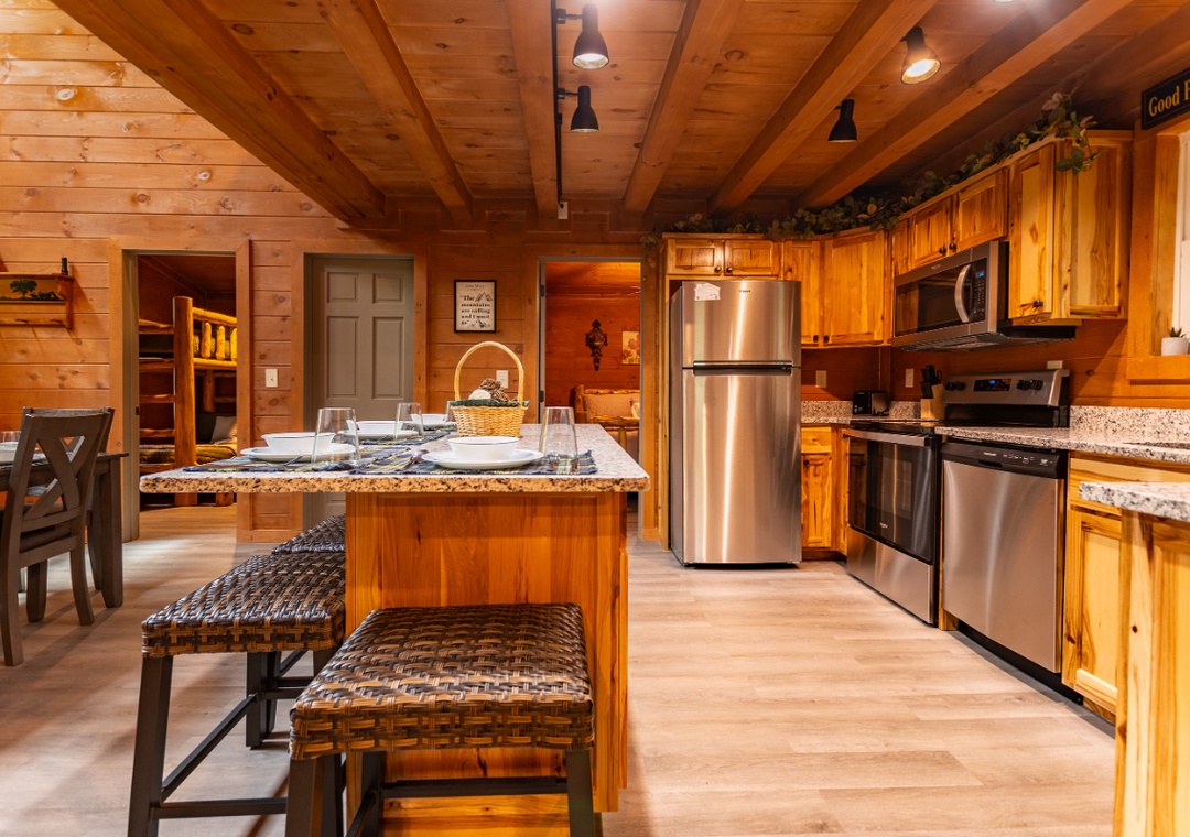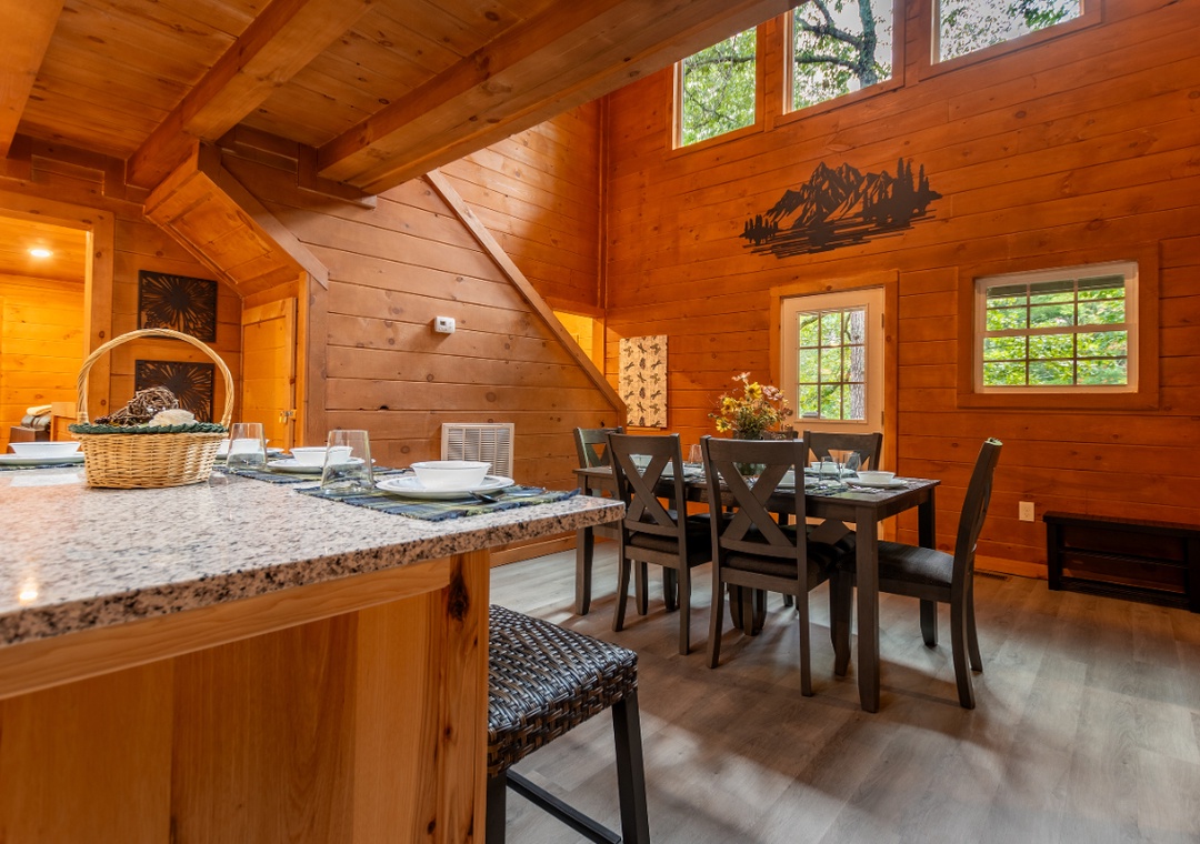 The fully-equipped kitchen boasts modern amenities making it easy to prepare delicious meals for your family or friends. Well-appointed with a full-sized refrigerator, dishwasher, stove, microwave, and other kitchen appliances perfect for making breakfast, lunch, or dinner throughout your stay! All pots, pans, glasses, plates, silverware, etc. are also there for you! Gather around the wooden dining table or the nearby breakfast bar to share stories and laughter as it invites you to savor each bite while taking in the natural beauty of the surroundings.