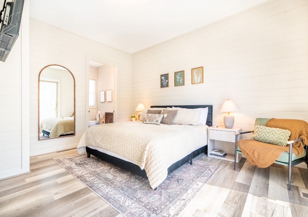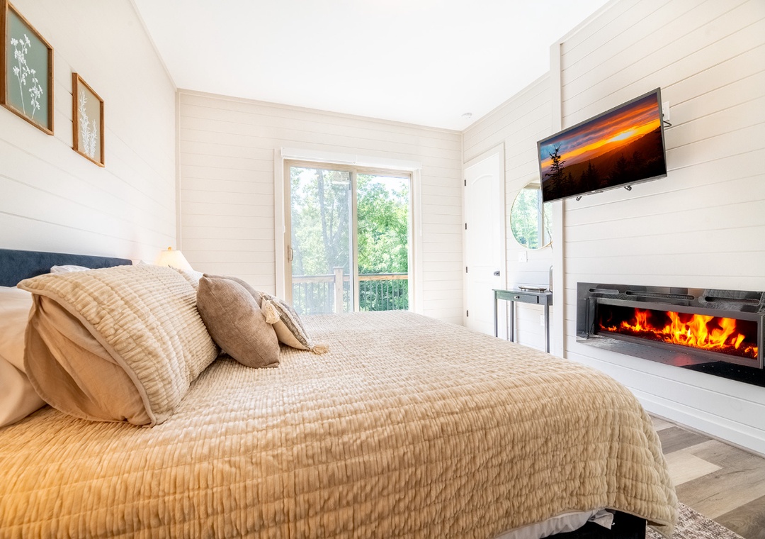 ✔ Bedroom #1 (Main Level): Spacious Bedroom with a King-sized Bed, Electric Fireplace, and a Flat-screen TV; Attached Full Bathroom with Stand Up Shower