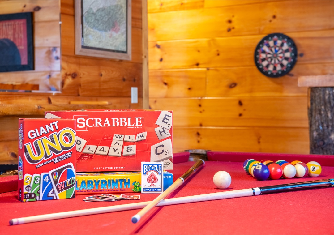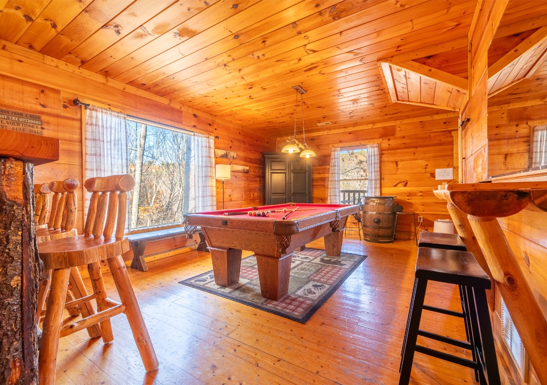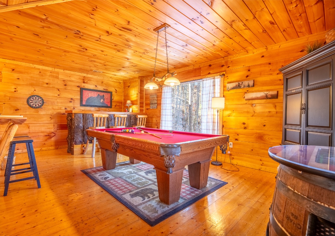The main level features a spacious living area that seamlessly connects to the kitchen and dining spaces, creating the perfect gathering spot for family and friends. Curl up by the gas fireplace after a day of hiking or exploring, or enjoy movie nights on the flat-screen TV. The natural wood finishes, rustic decor, and thoughtful touches throughout the cabin make every moment feel special and comfortable. Downstairs, the lower level offers additional space for relaxation or play, featuring a game room with a pool table, arcade machine, and cozy sitting area, the perfect hangout zone for kids and adults alike. Free WiFi is also available throughout the property.
