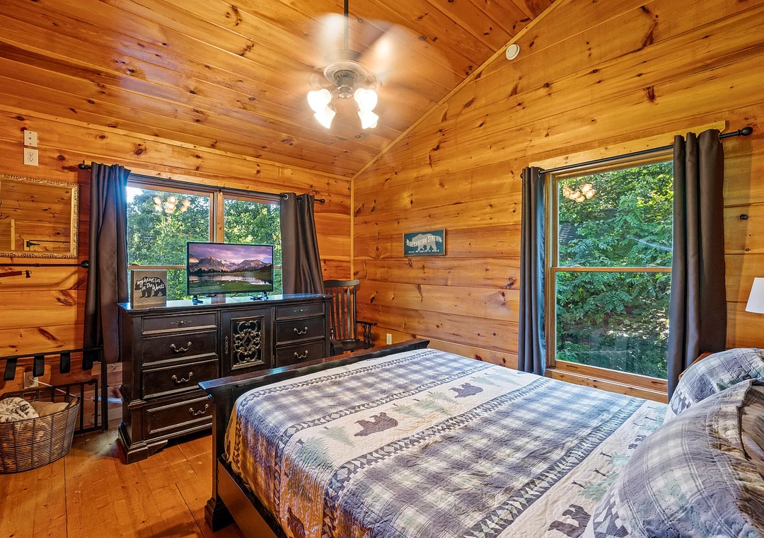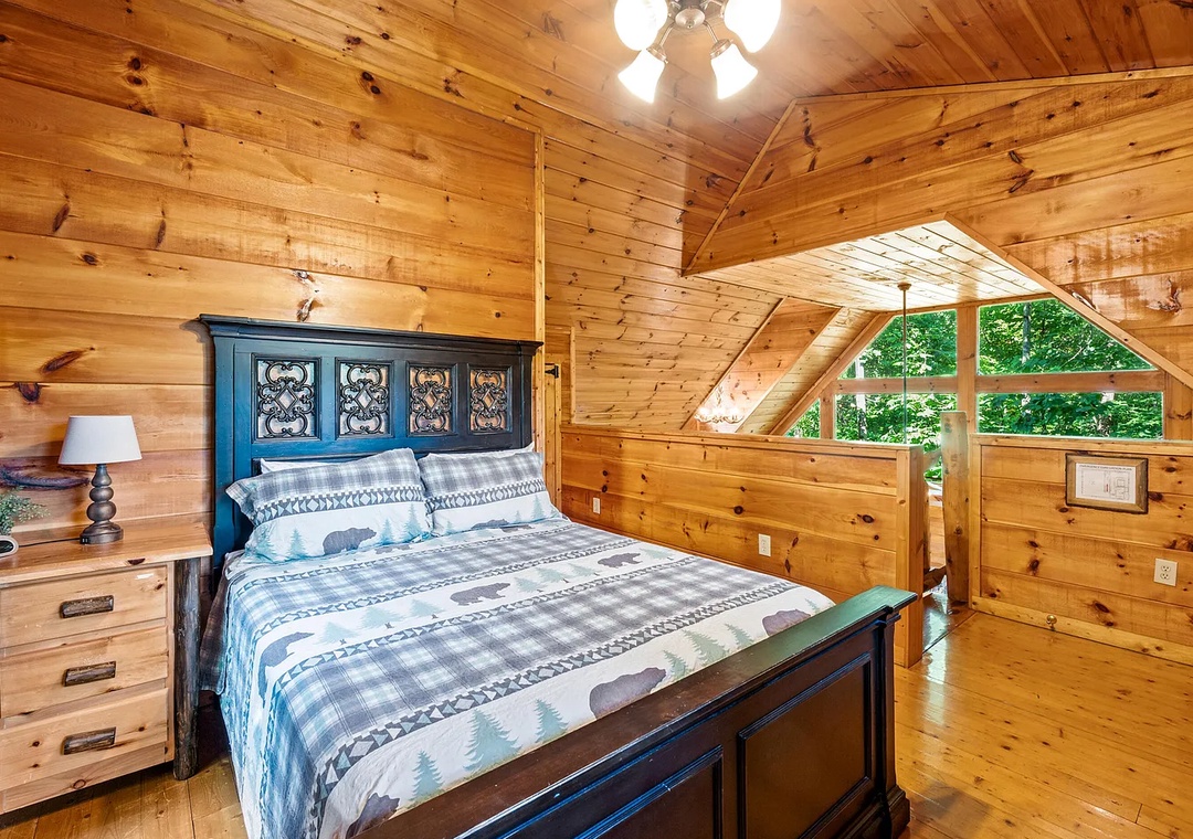 ✔ Loft Bedroom: Queen bed, full bathroom, and a cozy retreat feel with elevated views of the treetops.