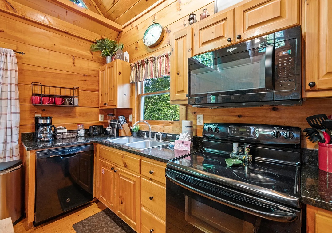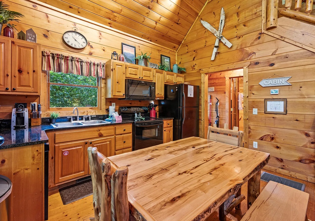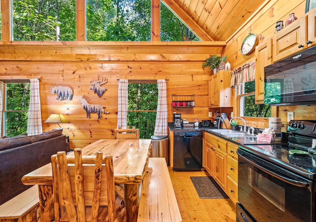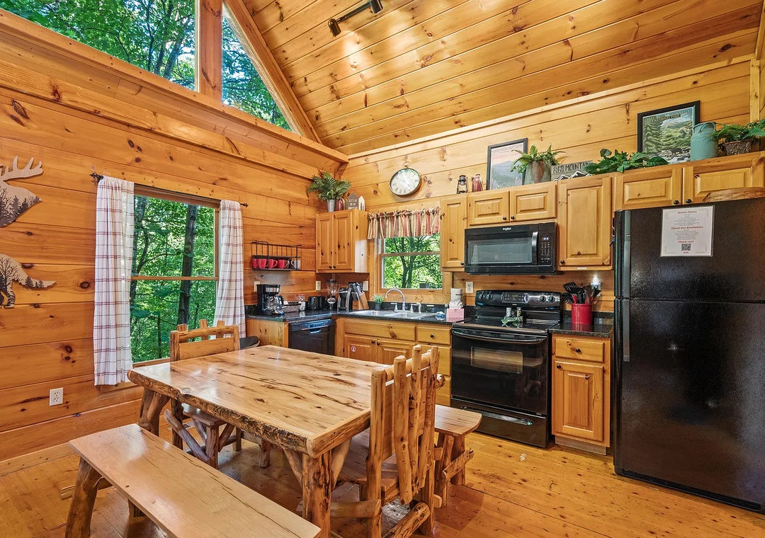 Whip up your favorite meals in the fully equipped kitchen, complete with modern appliances, cookware, utensils, and plenty of counter space. Whether you’re preparing a hearty breakfast before hitting the trails or a homemade dinner to enjoy by the fire, you’ll have everything you need. The adjacent dining area comfortably seats your group, or you can take your meal out to the deck to dine al fresco among the trees.