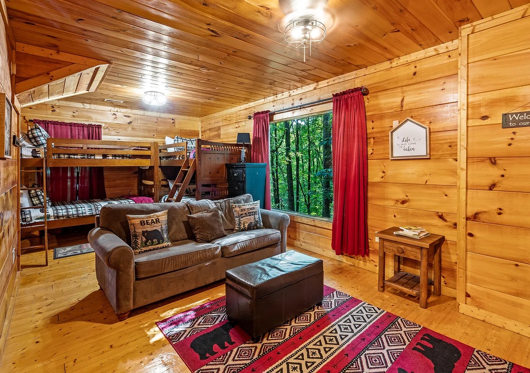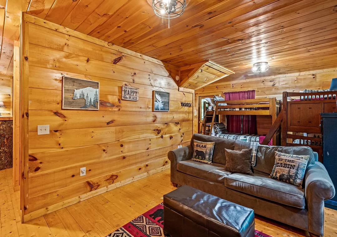 ✔ Lower Level Bunk Area: Two twin-over-twin bunk beds, ideal for kids or extra guests, located near the game room for easy access to entertainment.