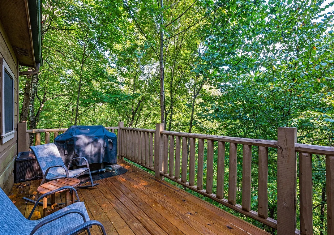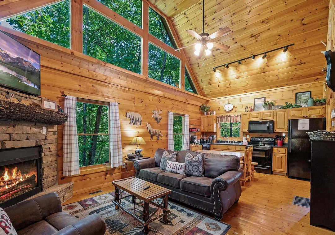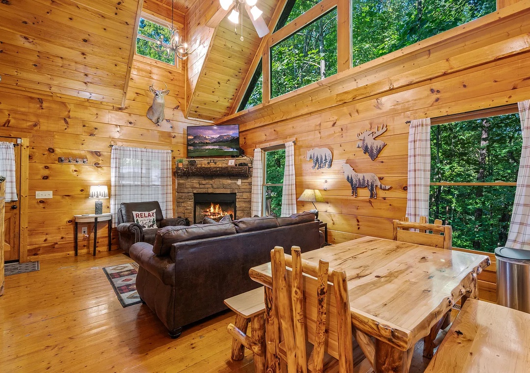 From the moment you arrive, you’ll be enchanted by TreeTop Lodge’s warm wood interior, high vaulted ceilings, and stunning natural surroundings. Step into the main level’s open-concept great room, where large windows let in plenty of natural light and views of the forested hillside. Enjoy cozy evenings by the stacked-stone fireplace, or unwind on the covered deck, complete with outdoor seating and a propane grill for mountain cookouts.
