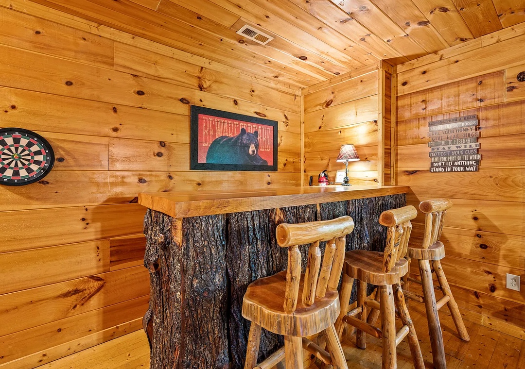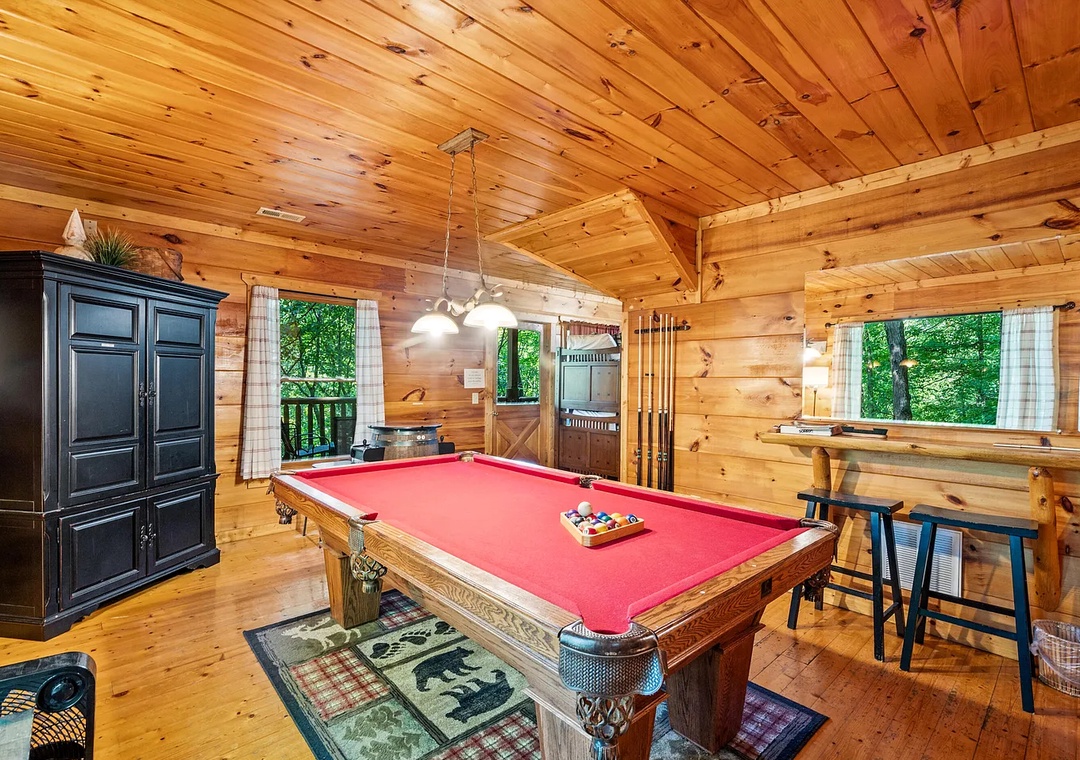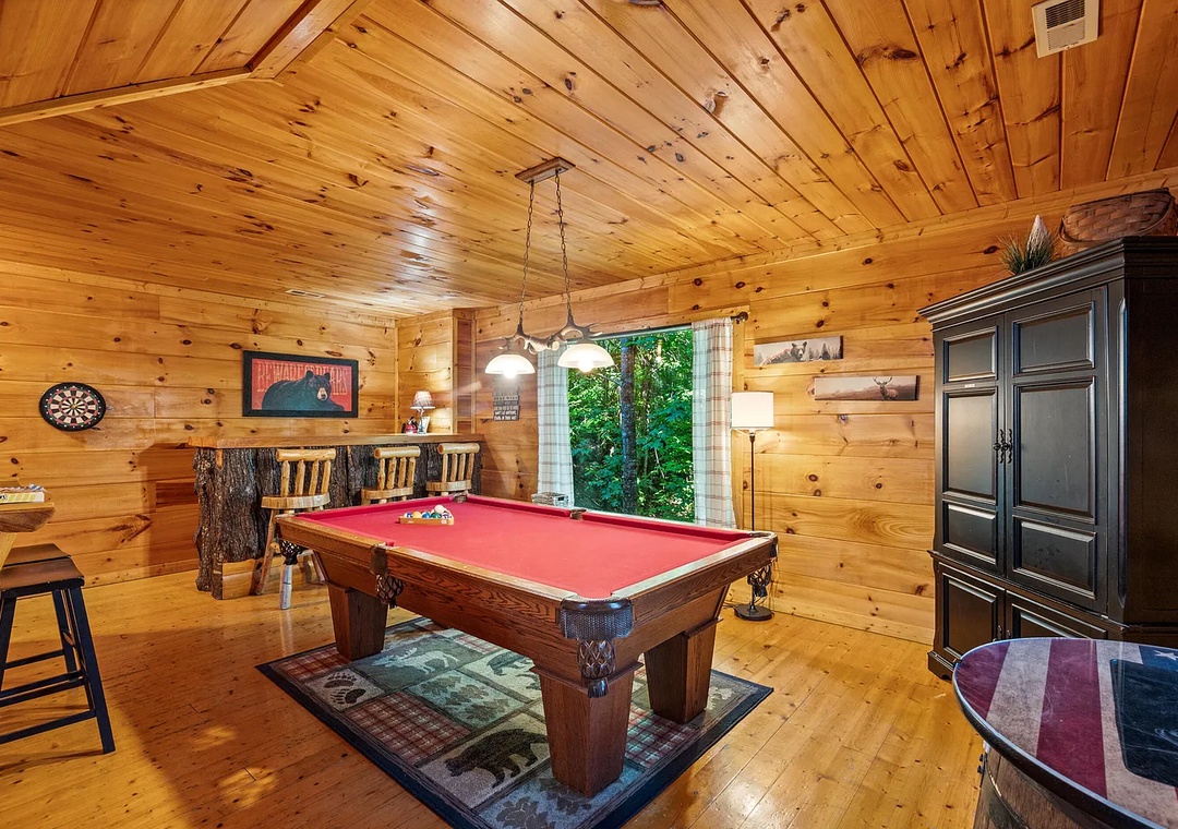 The main level features a spacious living area that seamlessly connects to the kitchen and dining spaces, creating the perfect gathering spot for family and friends. Curl up by the gas fireplace after a day of hiking or exploring, or enjoy movie nights on the flat-screen TV. The natural wood finishes, rustic decor, and thoughtful touches throughout the cabin make every moment feel special and comfortable. Downstairs, the lower level offers additional space for relaxation or play, featuring a game room with a pool table, arcade machine, and cozy sitting area — the perfect hangout zone for kids and adults alike.