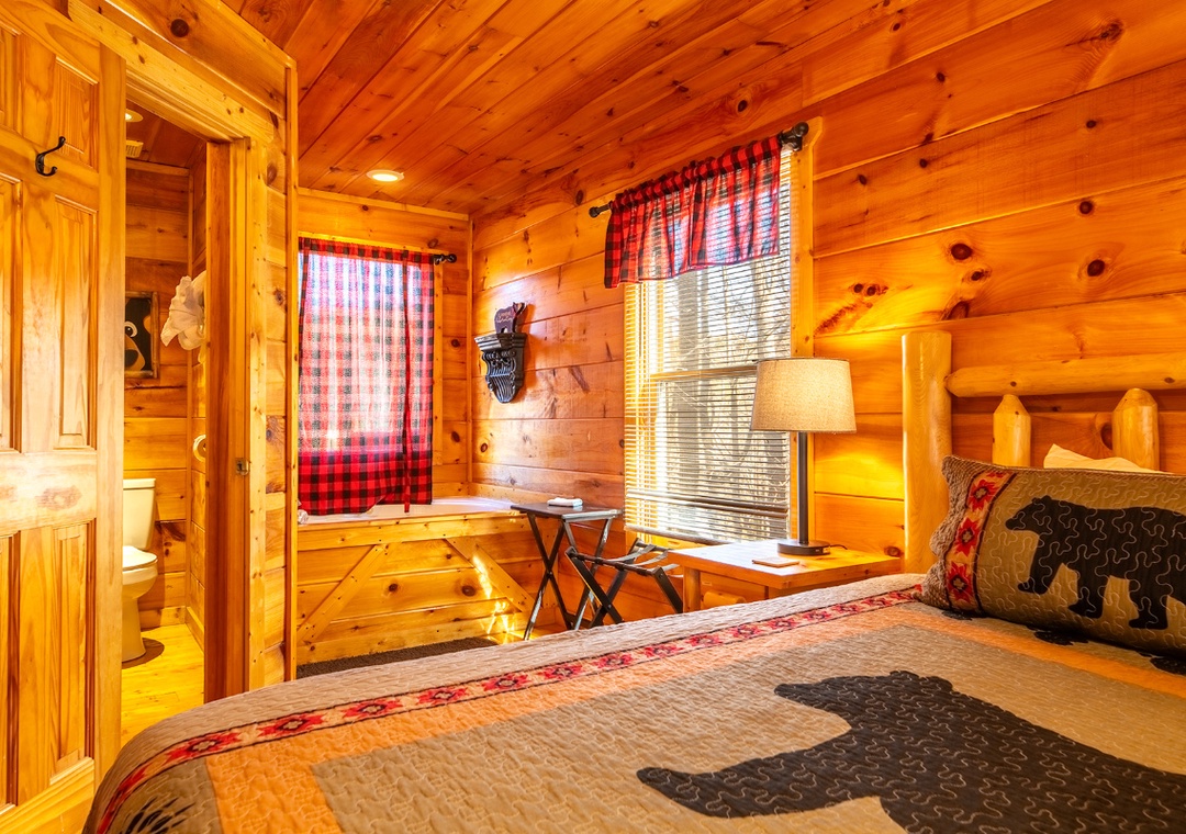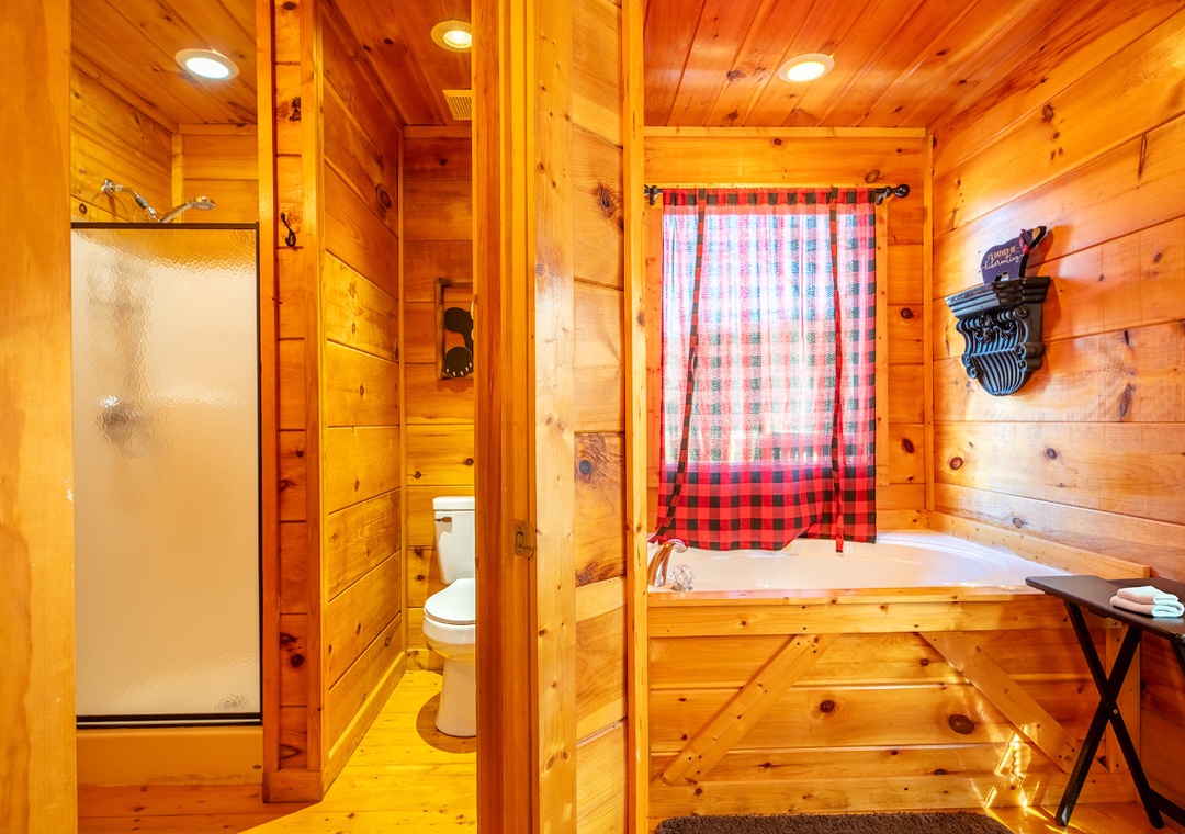✔ Master Suite (Main Level): King bed, flat-screen TV, Access to a Full Bathroom with a stand-up shower, and a Separate Jacuzzi Tub